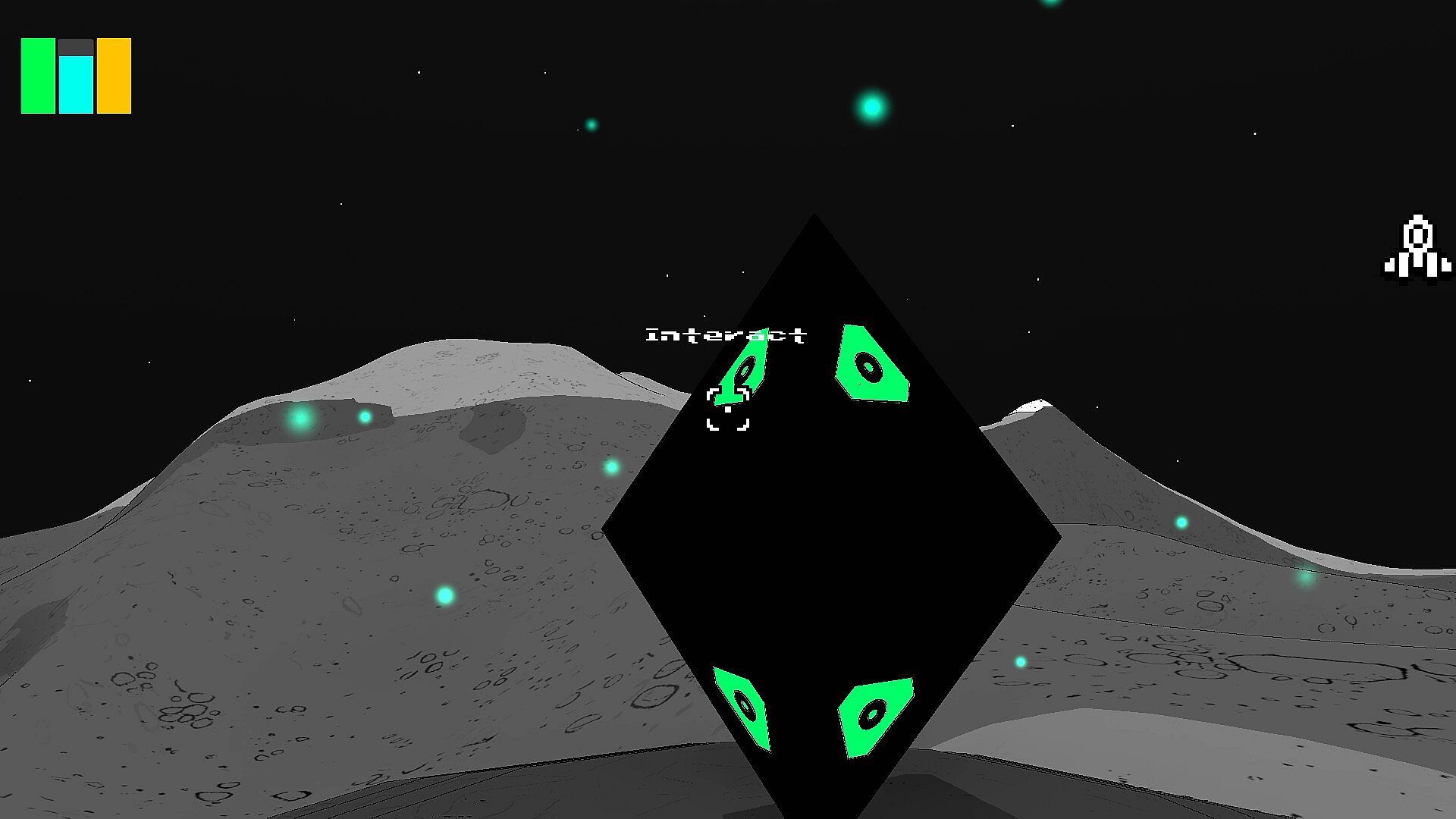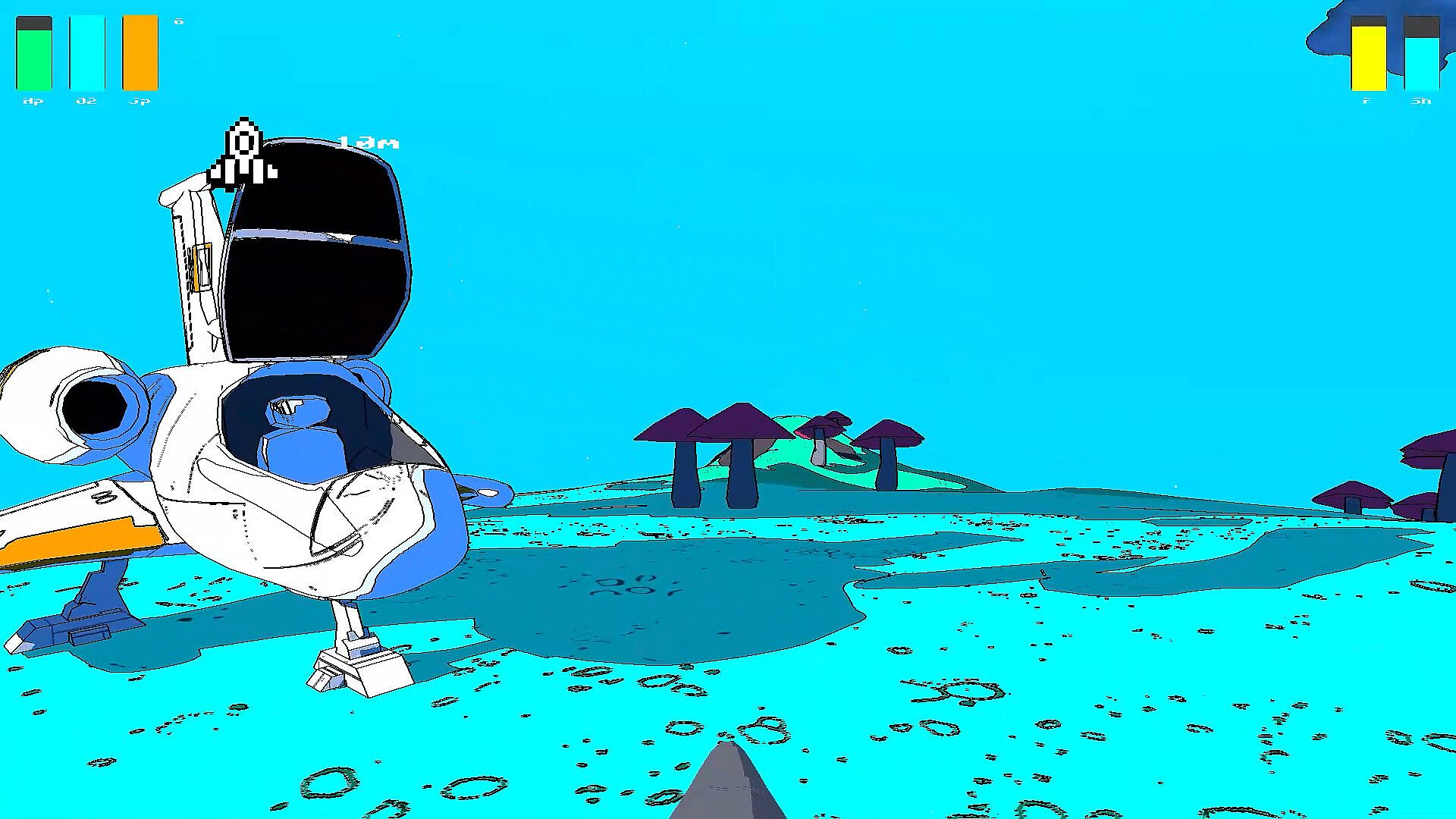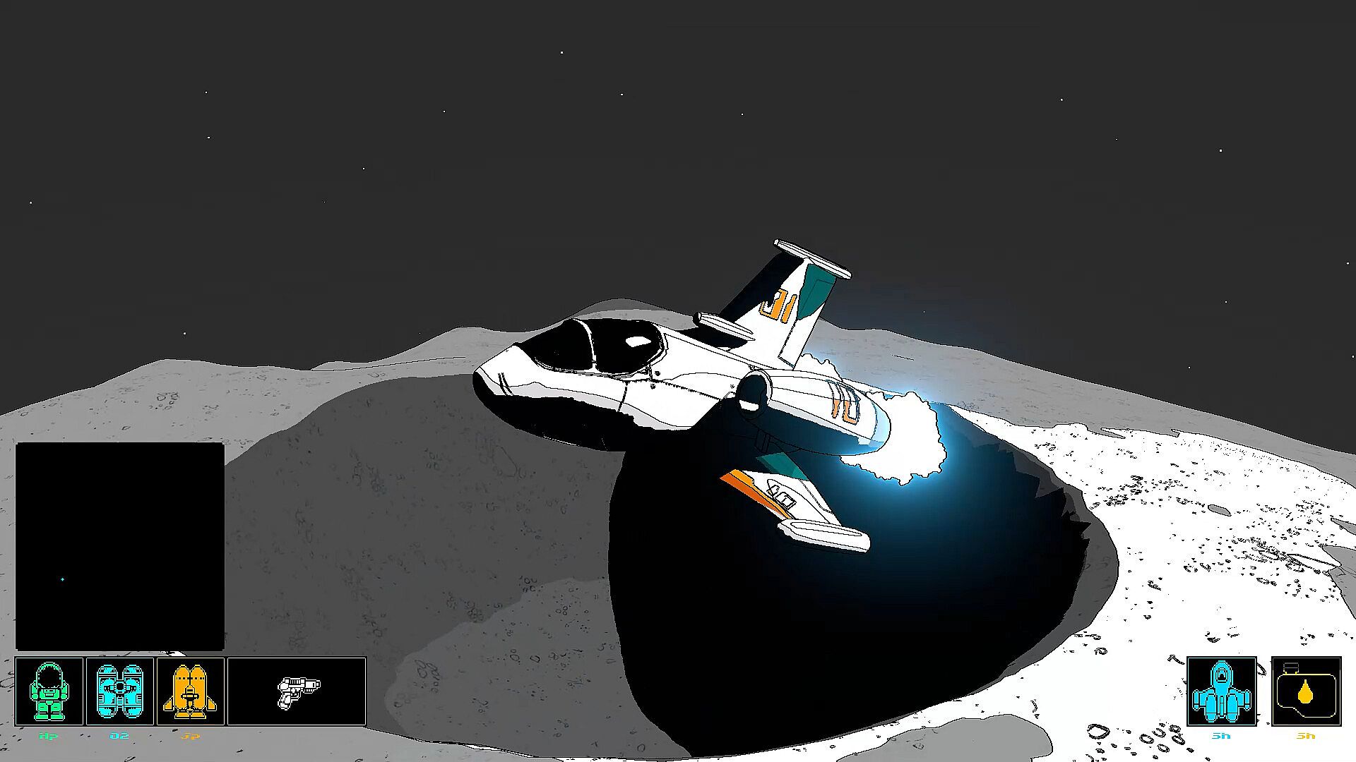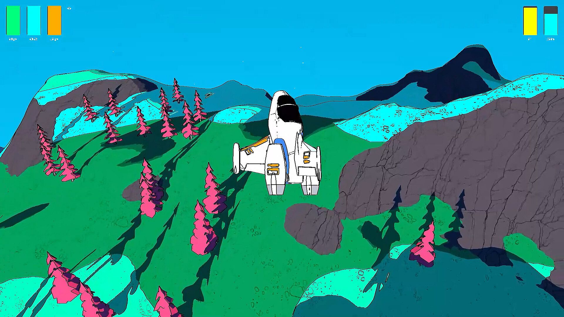 Cratered is a single-player, open-world exploration game with a distinct illustrative style. Players can travel between planets in the star system and land on them. It's played in first-person while on foot and in third-person when flying your space ship.