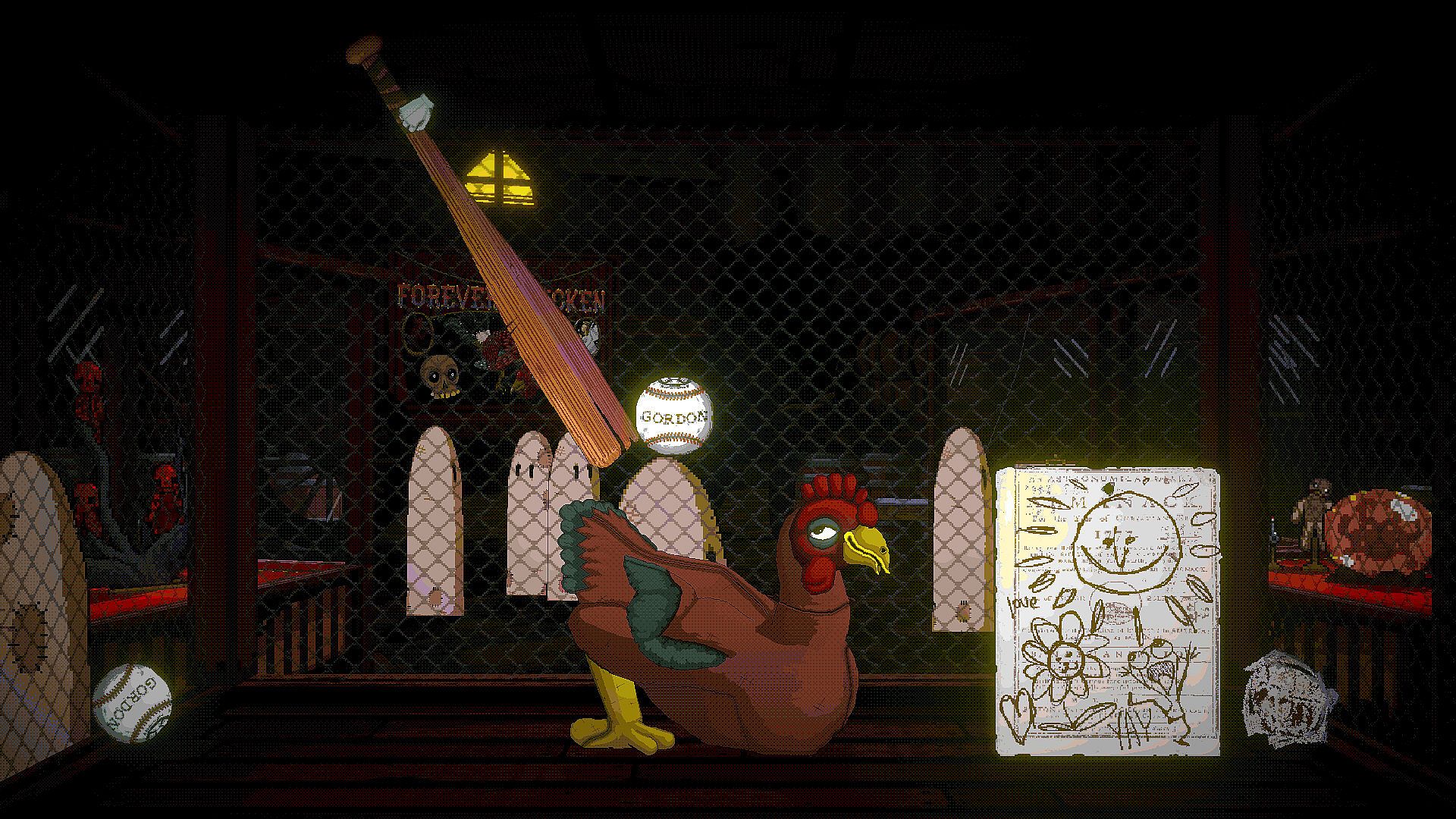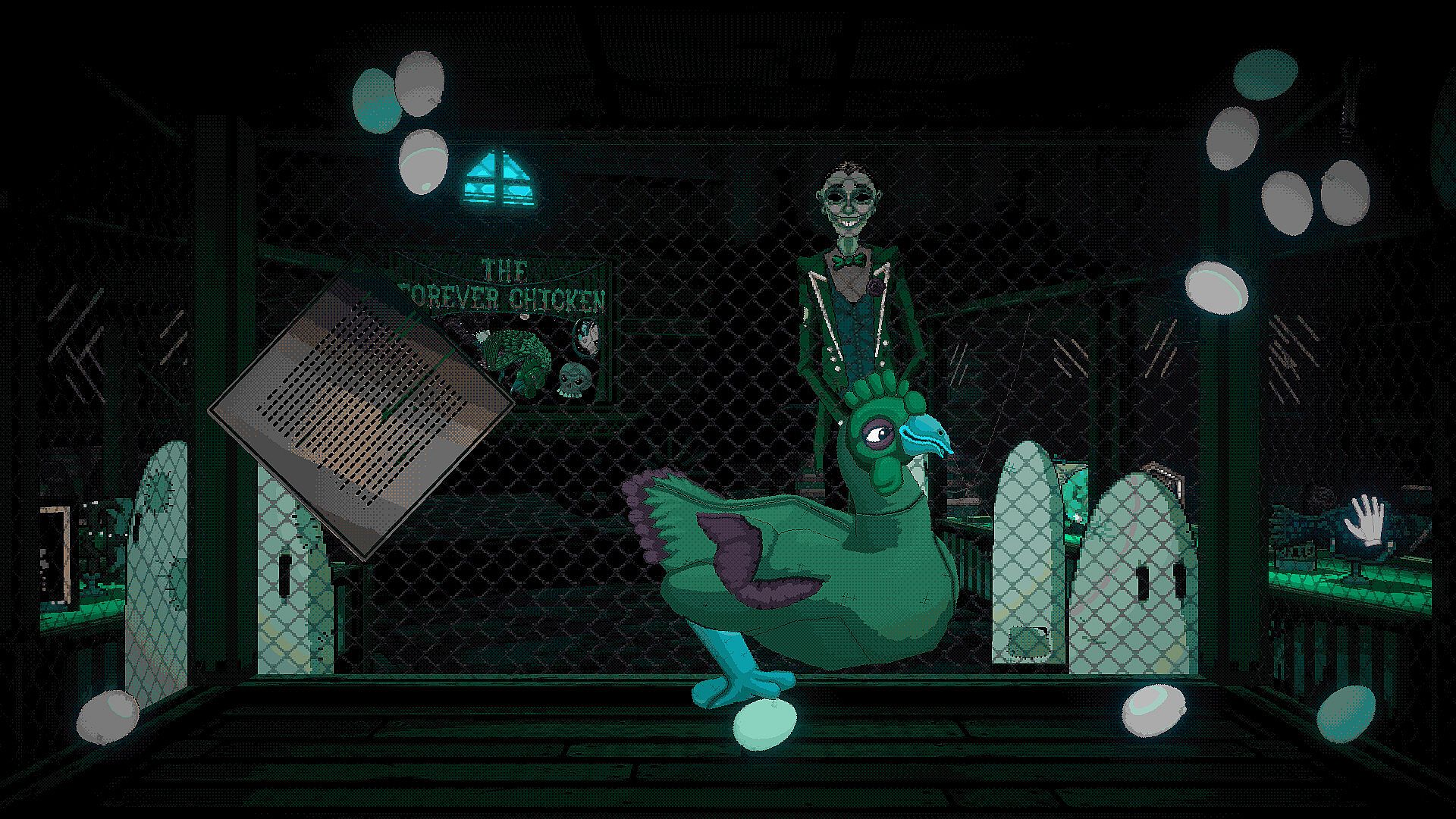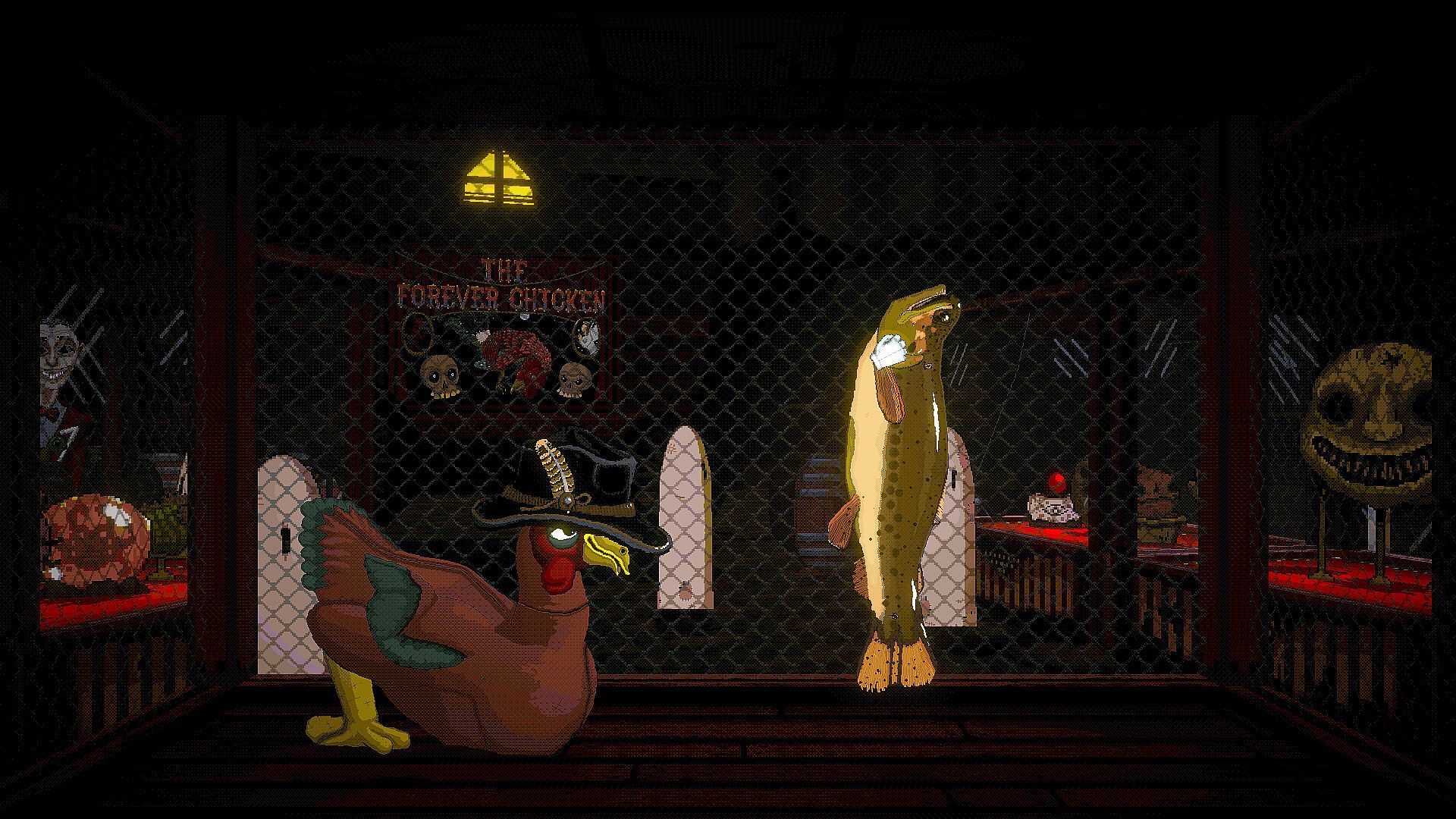 Teach dead rats to smoke cigarettes, play with loaded firearms, throw dance parties for cockroaches. The requests of the carnival are many and strange, but if you are to survive this place you must solve the many riddles and charades revolving around the Forever Chicken.