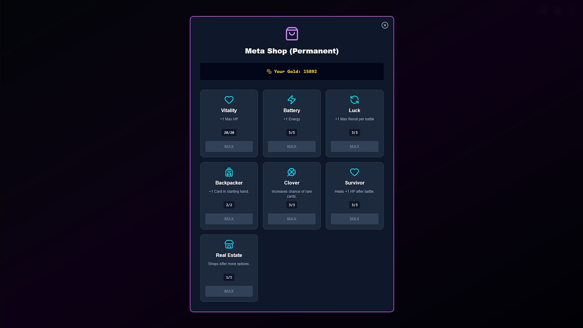 A descent into madness across evolving, hostile biomes. From the Whispering Forest to the Hell Peak, the world evolves to kill you. Every 10 levels, a Guardian demands perfection from your strategy. Survive them all to face The Abyss at level 100—an entity that devours reality. Only the ultimate deck can survive this final nightmare.