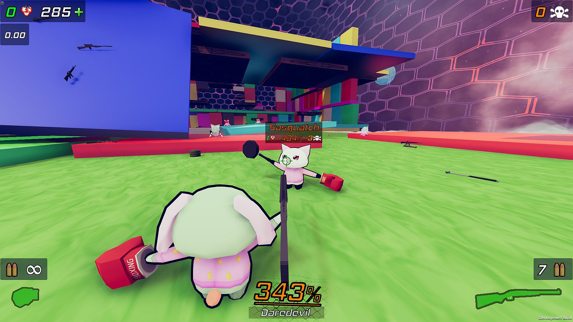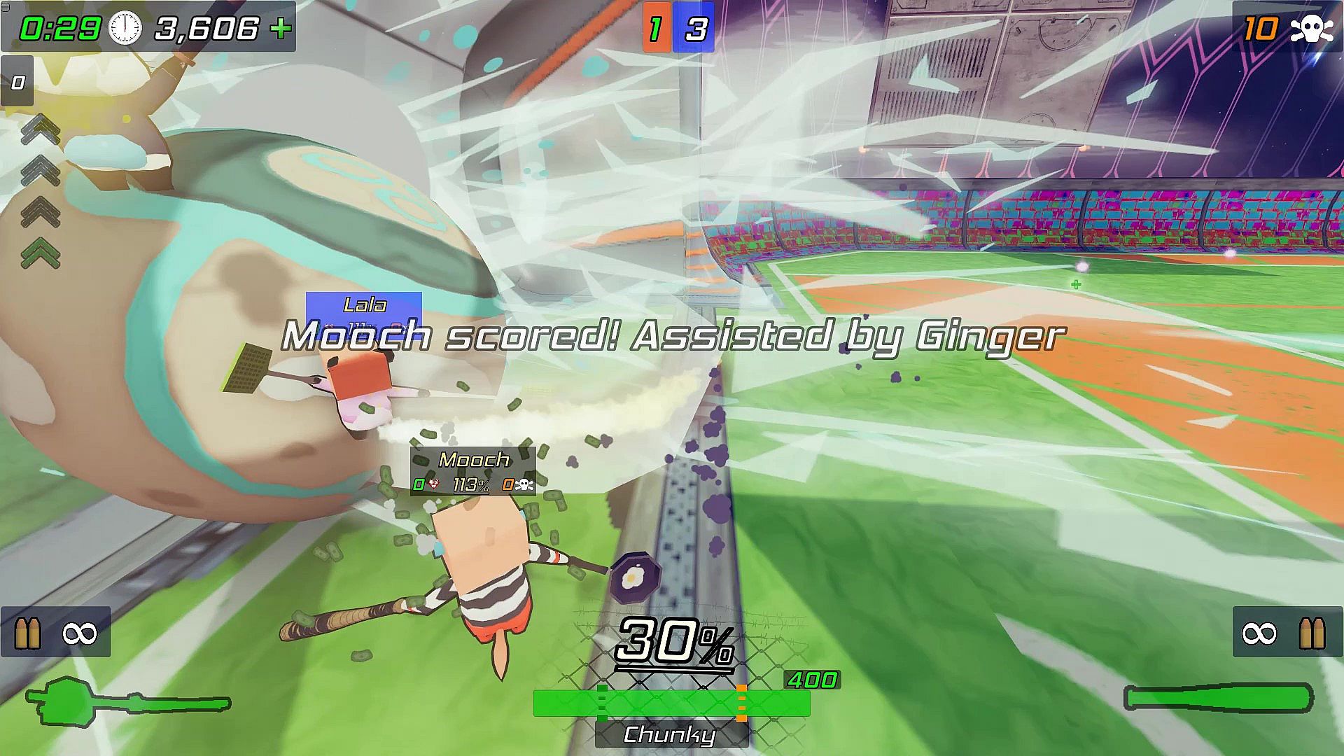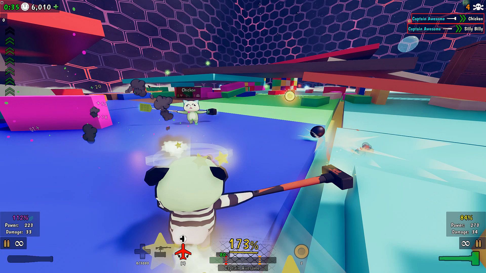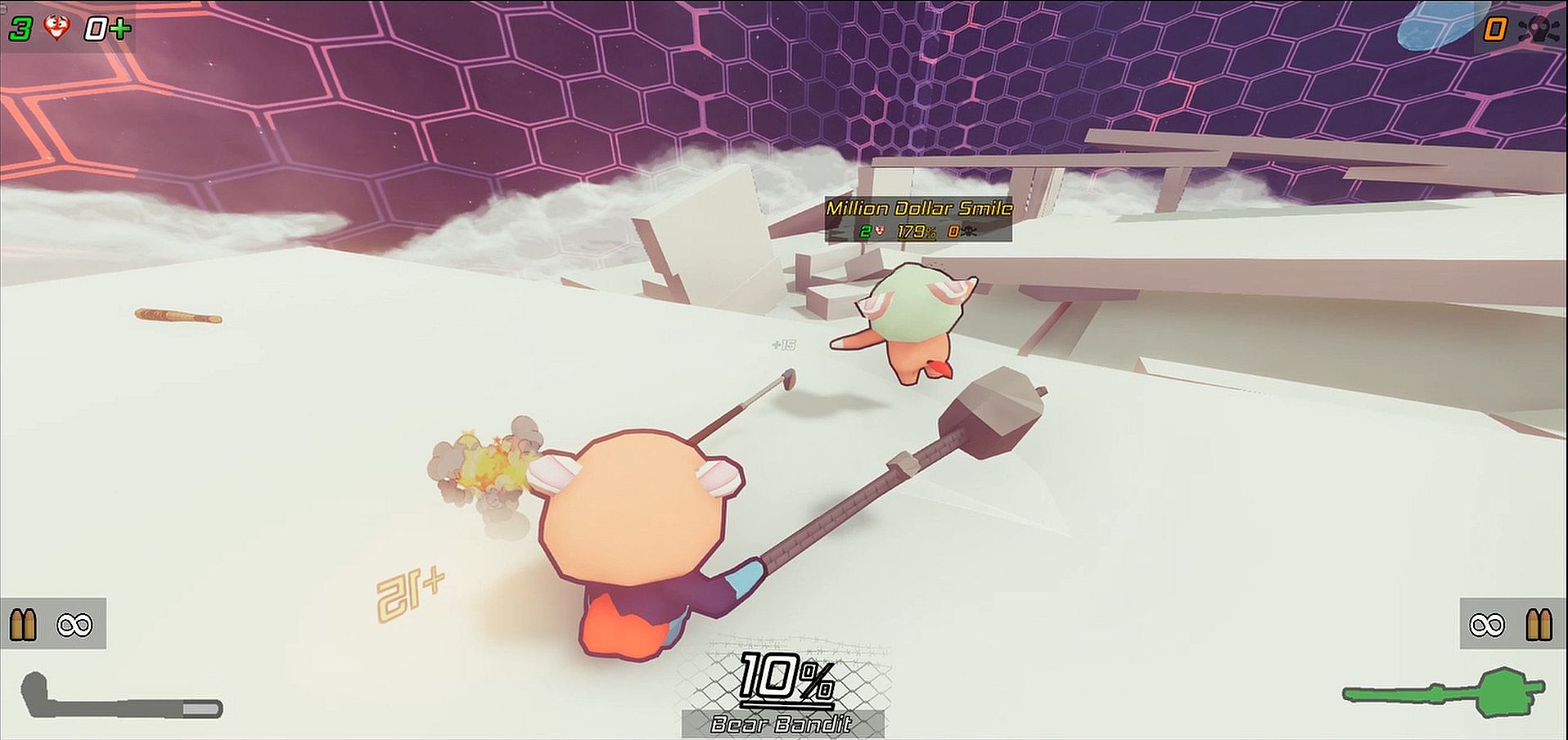 Hits will do variable amounts of damage based on how hard you were actually able to hit them and what their multiplier is. Get a moving start and throw your whole body into it just like real life for maximum damage. Get a melee hit while boosting for double damage!