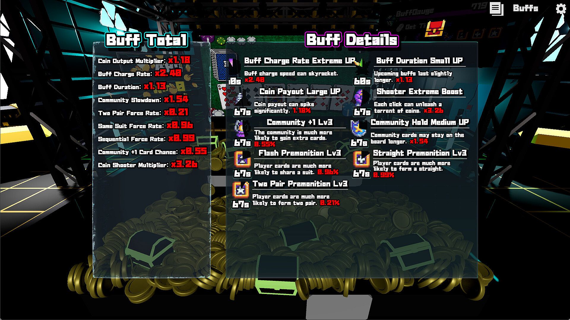 Buffs twist the poker rules (extra hole cards, more community cards, skewed probabilities, multiplier boosts)