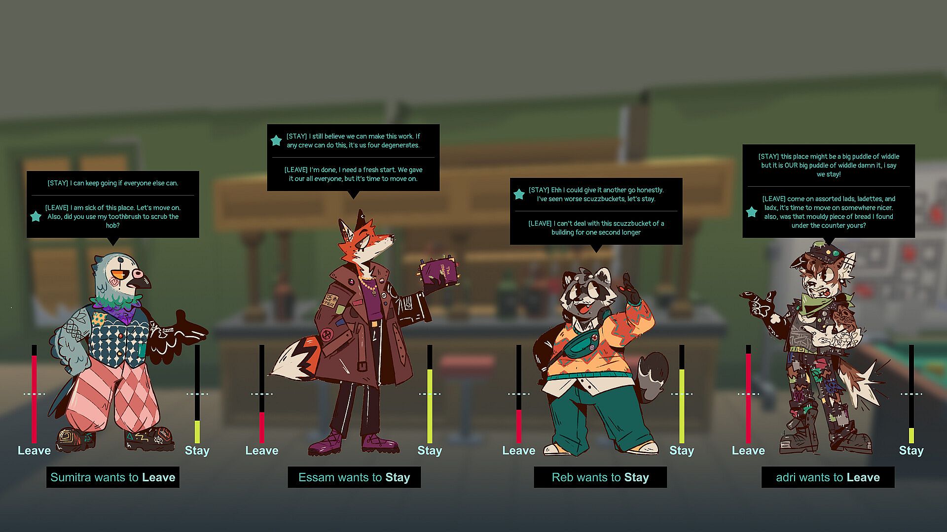 Creatures Like Us is a queer narrative life sim about squatting, solidarity, and surviving capitalism together. Follow a group of friends as they make homes in abandoned buildings. They forage for supplies, fix what’s broken, cook together, hold house meetings, and figure out how to live alongside each other with care, conflict, and humour. It’s not easy. But in the cracks of a failing system, something beautiful is growing.