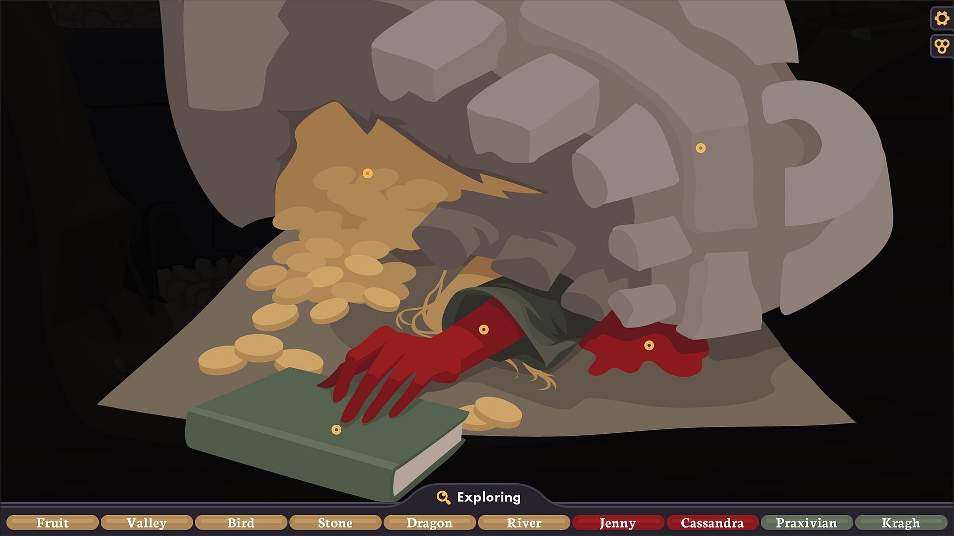 When you have gathered all the pieces of the puzzle, switch to the thinking screen. Use clues and keywords to name the killer, method, motive, and location.