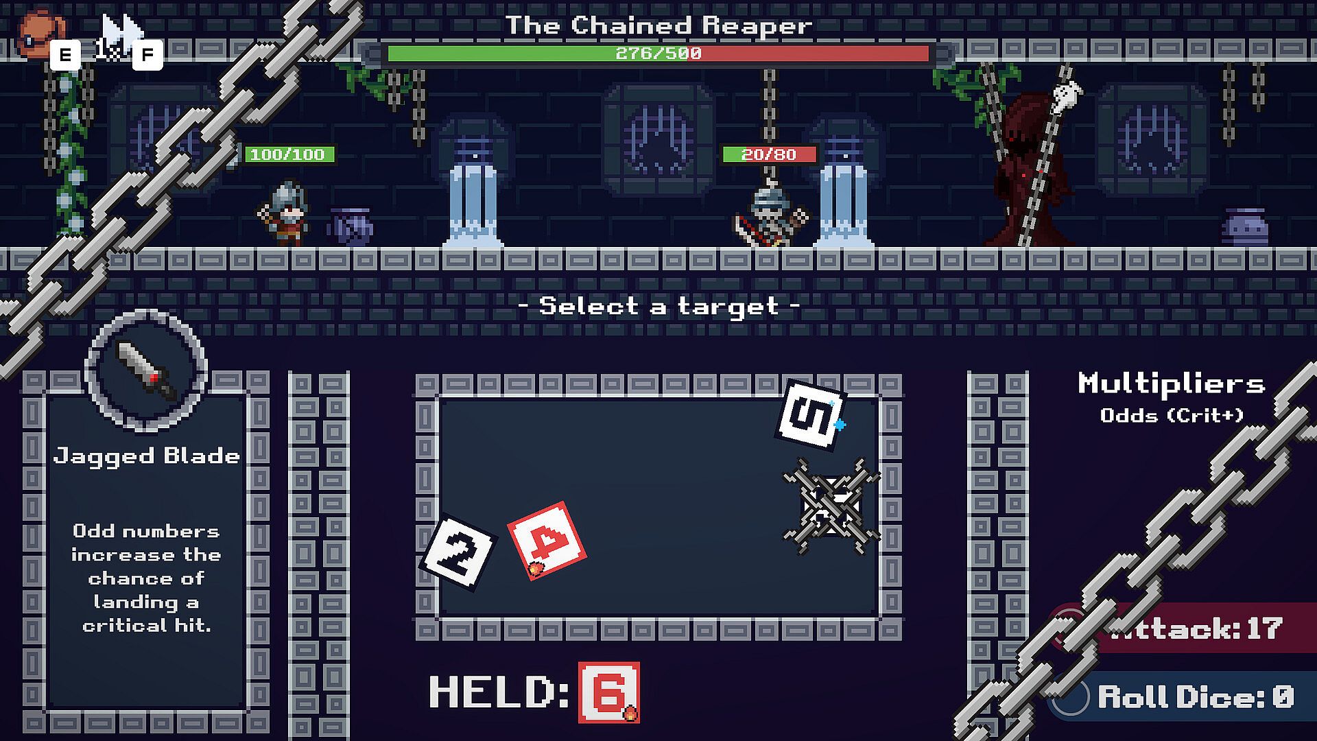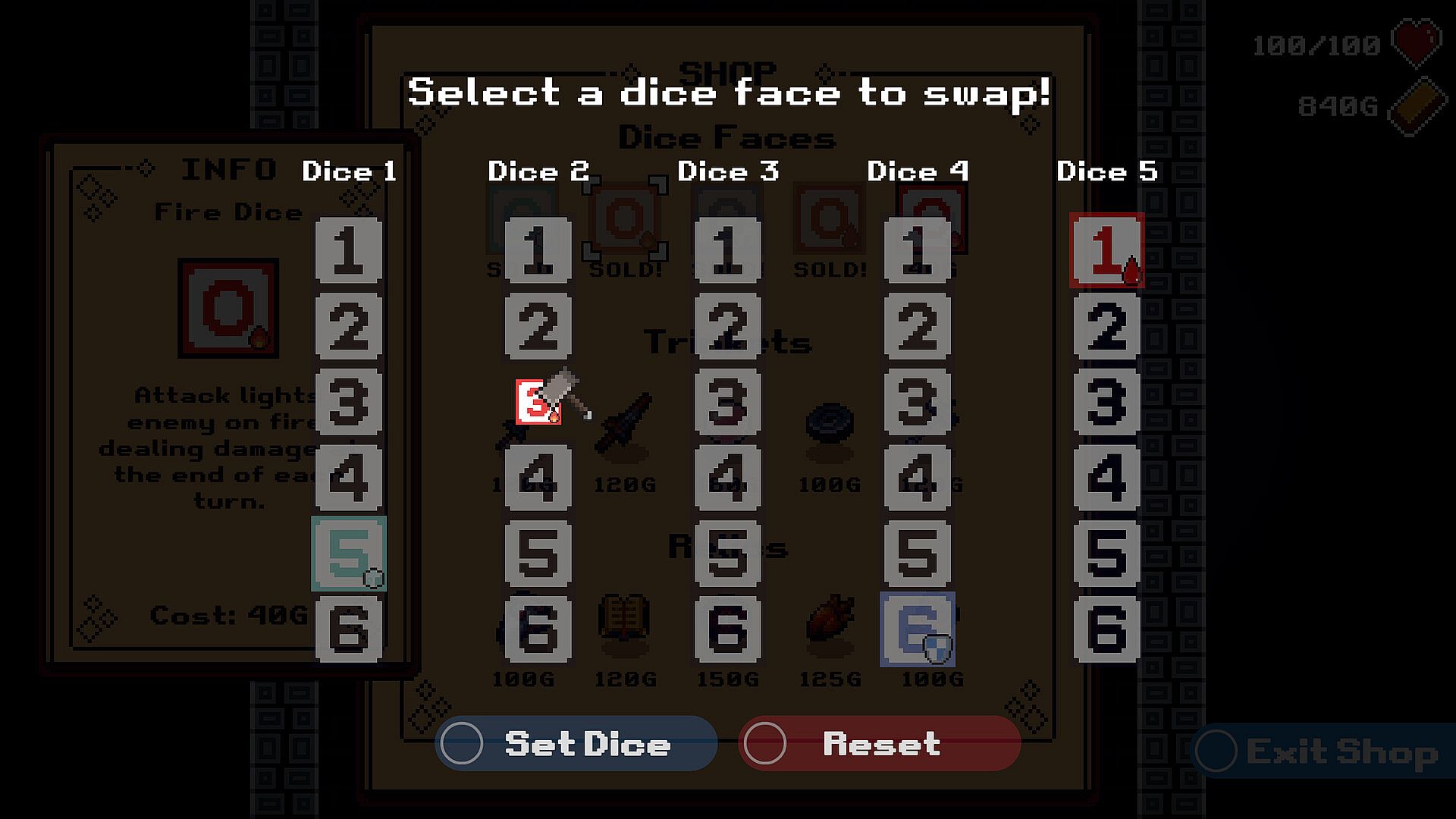 Finding new dice faces on your journey and crafting them onto your dice will allow you to apply special effects to your attacks! Upgrading your dice will be essential to conquering the dungeons! With the right dice you'll be able to inflict status effects on enemies, like burn, bleed, paralysis or confusion. Some dice can even apply buffs to yourself, like shield or reflect.
