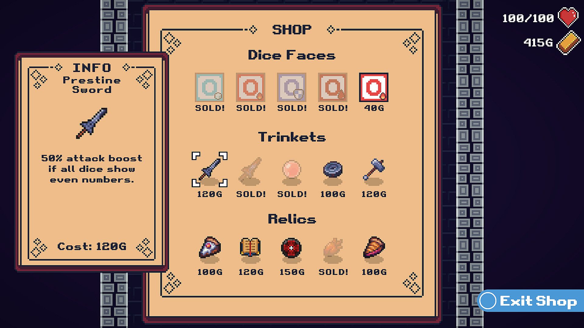 Trinkets can be found throughout your journey; each affecting the way your attack is calculated. Each turn will cycle through your collection of trinkets, forcing you to tackle each turn from a different perspective. Relics offer permanent effects, empowering certain dice faces, or simply increasing your health.