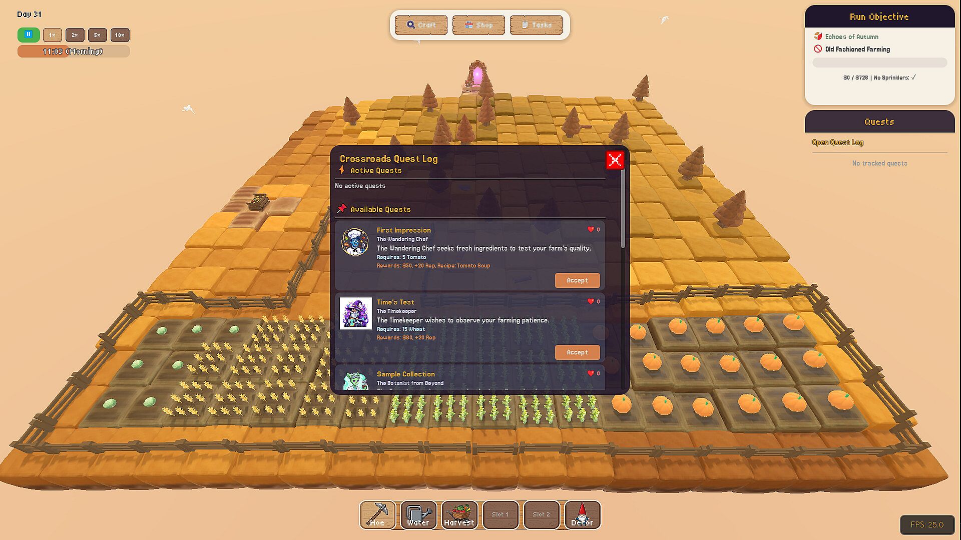 Transform your harvests at the crafting station, turning raw crops into valuable goods. Complete tasks from the community board for rewards and experience. Buy seeds and utilities from the shop, but manage your budget carefully - the crossroads doesn't forgive bankruptcy.