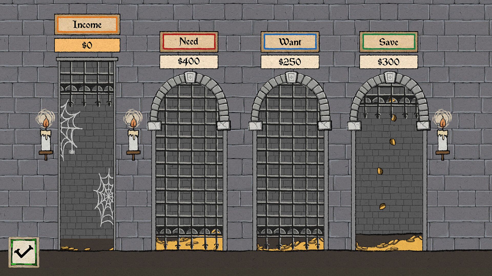 The previous king has wasted away all of the gold from the treasury on frivolous goods, and the kingdom has fallen into disrepair. Now that you have been crowned ruler, managing the finances of the kingdom is your responsibility!