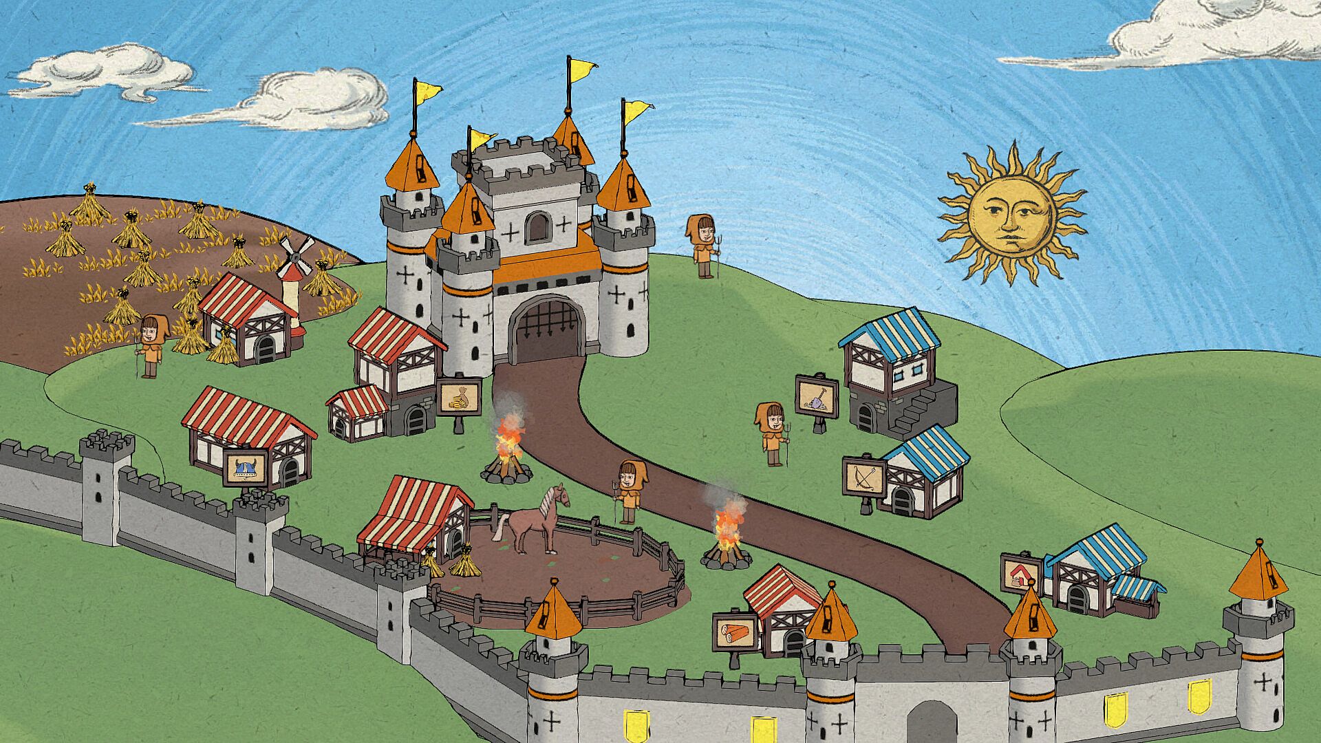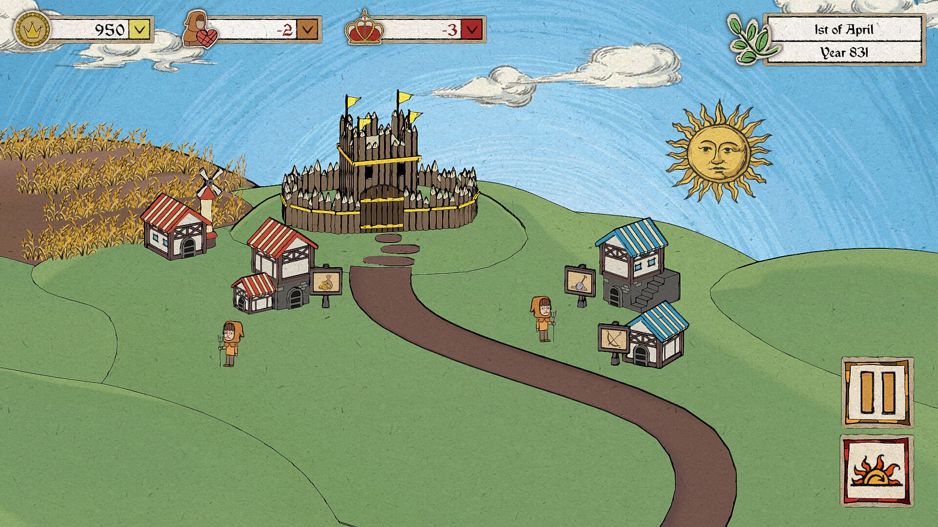 As ruler, your decisions have an impact on the world around you. Keeping your townsfolk happy is critical to staying in power. Your subjects are mostly concerned with your ability to take care of their most basic needs. However, from time to time, even the most loyal subject will want for some fun and games to be as happy as can be!Your reputation among the neighboring kingdoms will determine how your name goes down in history. Other rulers care little for your basic needs; they want to see how you will spend on extravagances beyond just what you need to survive.