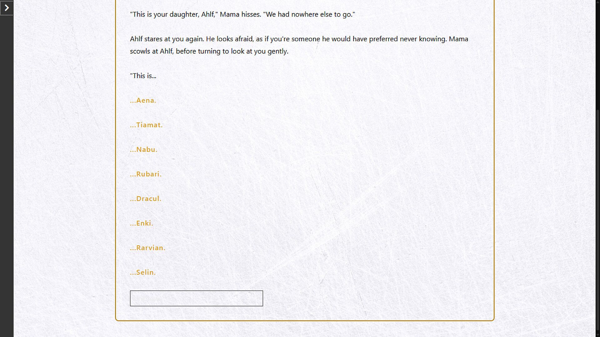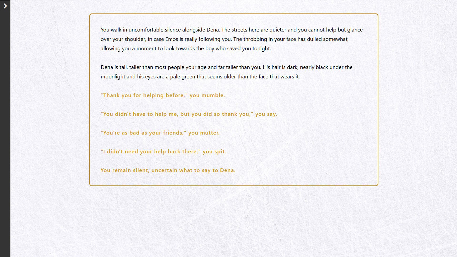 • Dena (gender selectable - he/him, she/her) – A childhood friend turned sea captain. Suave, cunning, and willing to do anything for power.