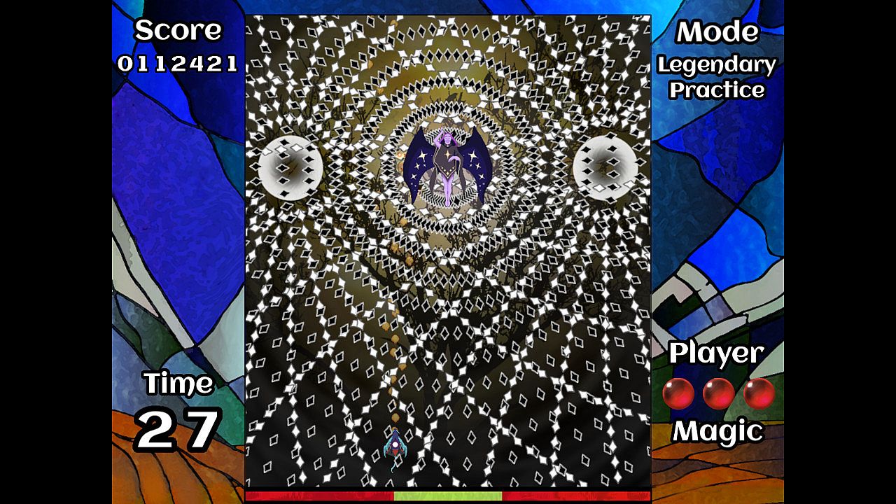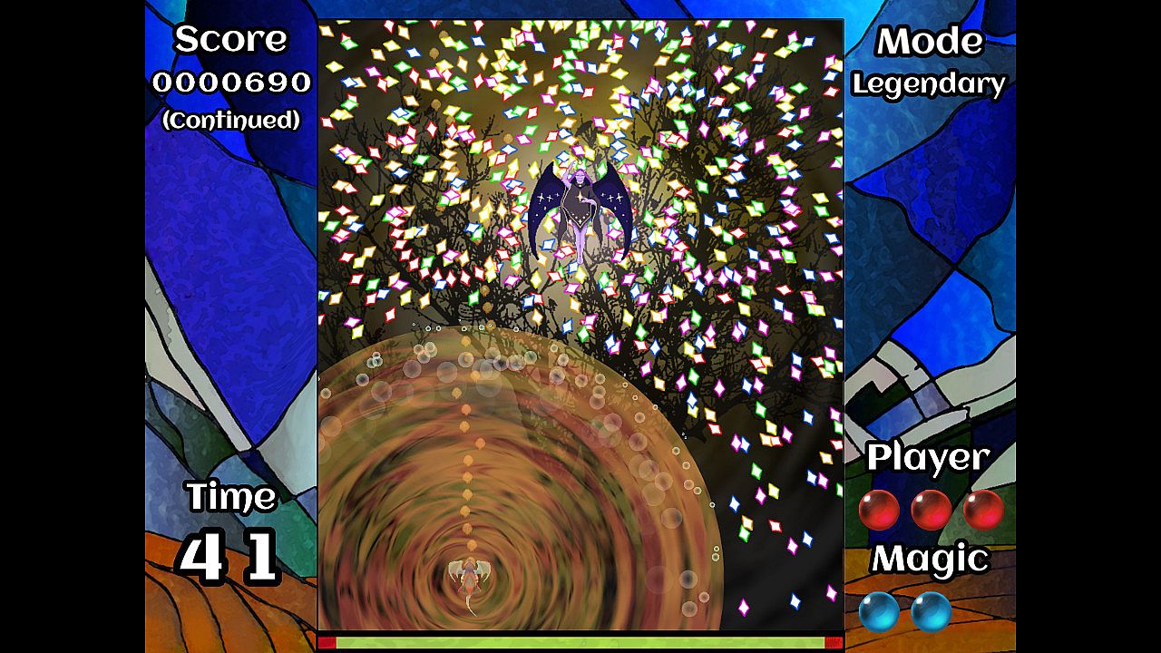 You control a magical dragon in a trial by fire against an older, stronger dragon. Your goal is to dodge through an onslaught of colorful bullet patterns without getting hit. There are twelve patterns in all; you win by lasting through all of them in a row. See the true ending by completing either difficulty without using any continues!