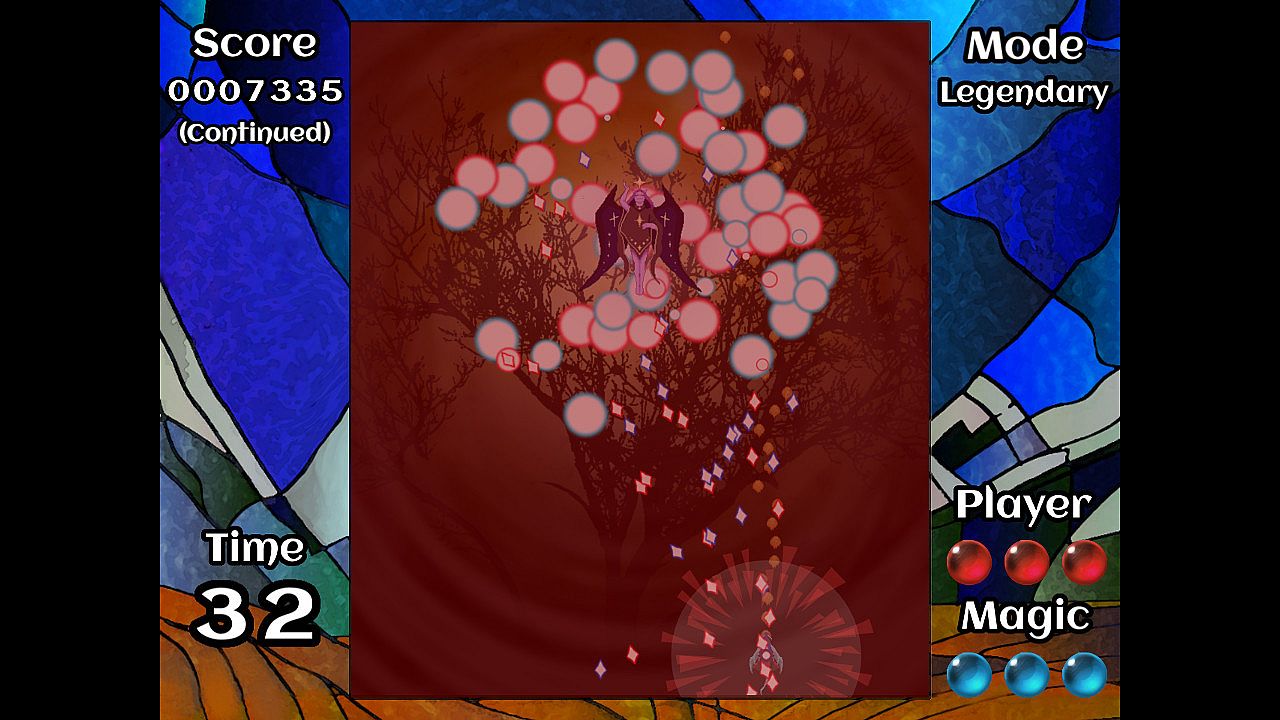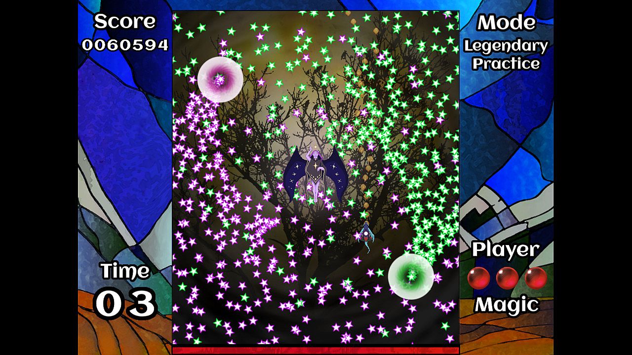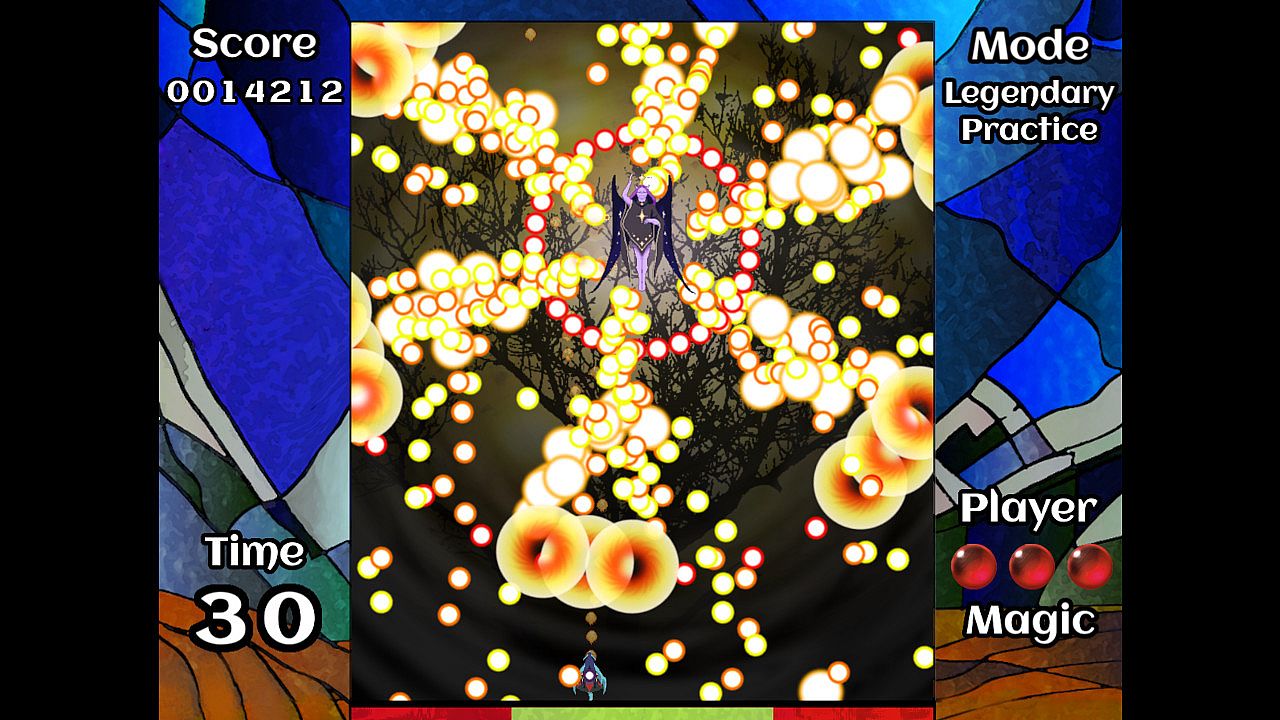 Each bullet pattern can be cleared either by reducing the boss's stamina to zero or lasting until the pattern timer reaches zero. If the player is hit by a bullet, they can prevent themselves from losing a life point by reacting with a fireball burst attack. The player's score increases every second they're alive and whenever they come close to a bullet without touching it.