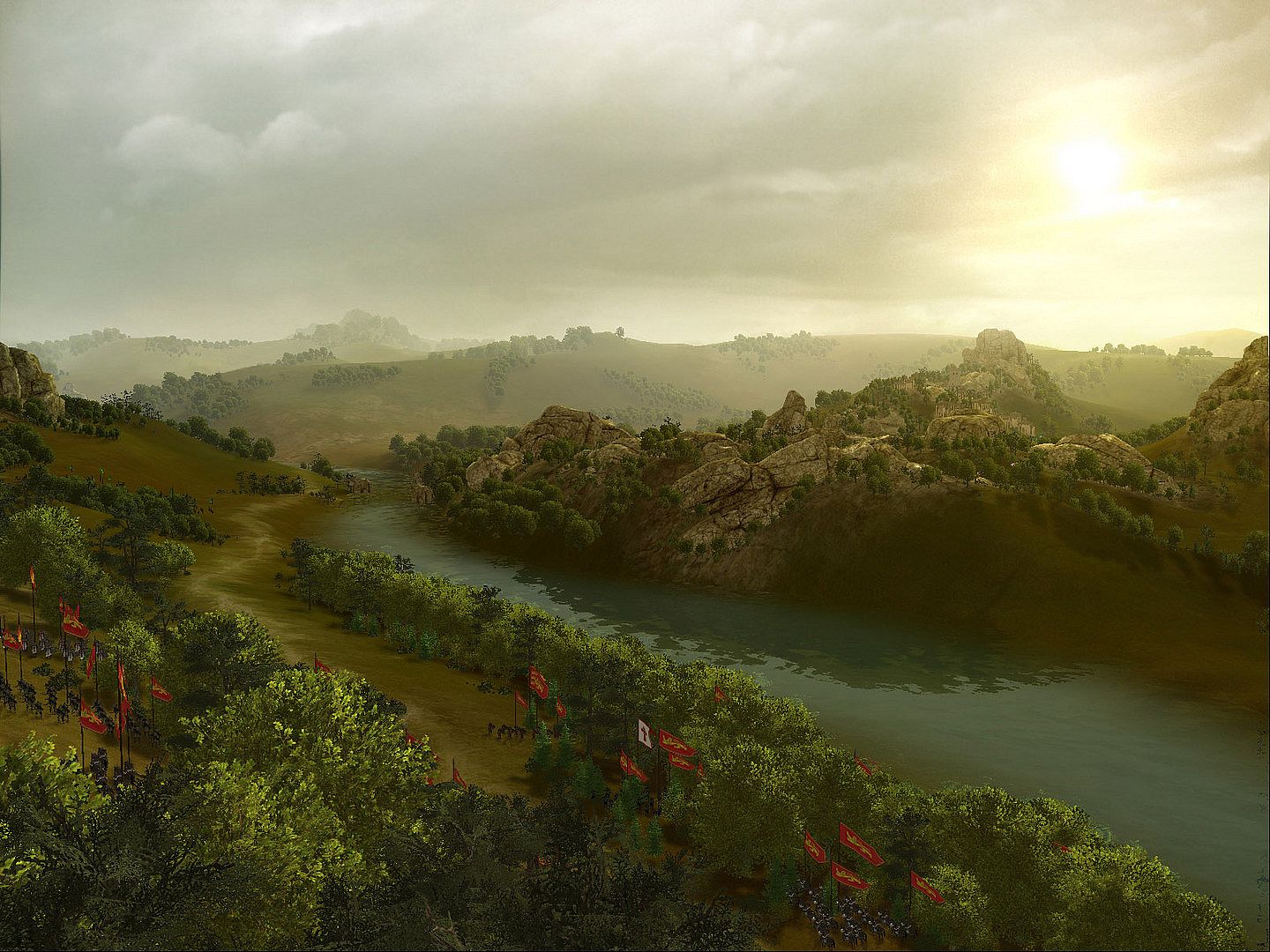 • Huge armies on huge battlefields — Crusaders: Thy Kingdom Come offers highly varied terrains that evoke the atmosphere of the faraway lands where the crusaders marched towards Jerusalem – from the Mediterranean pine forests to the barren rock deserts of the Holy Land. The topographic elements (hills, valleys, slopes etc) heavily influence the tactics and the outcome of the battles. It is also the first RTS where physics is one of the most important factors in the game (where rocks tumble down on the slopes, crushing into the ranks of the enemy and send enemy soldiers flying and sprawling on the ground and so on.) Weather conditions and visibility change dynamically, which is not solely a visual element, but it also affects the gameplay, specifically the abilities of the different units and the outcome of their actions.