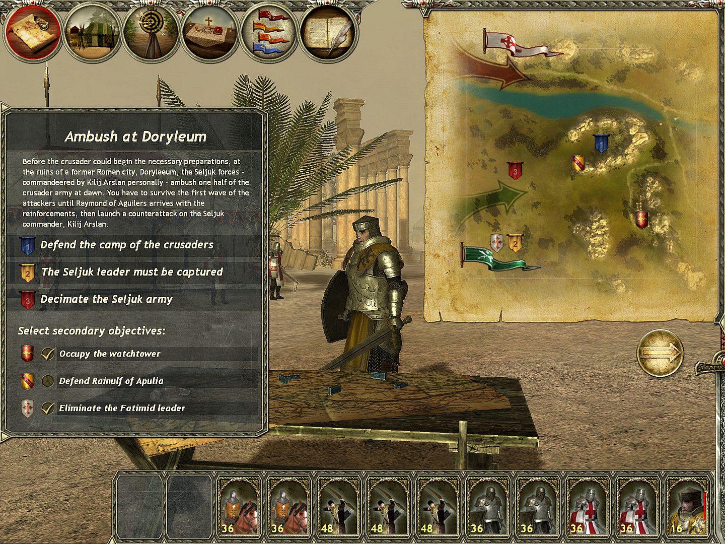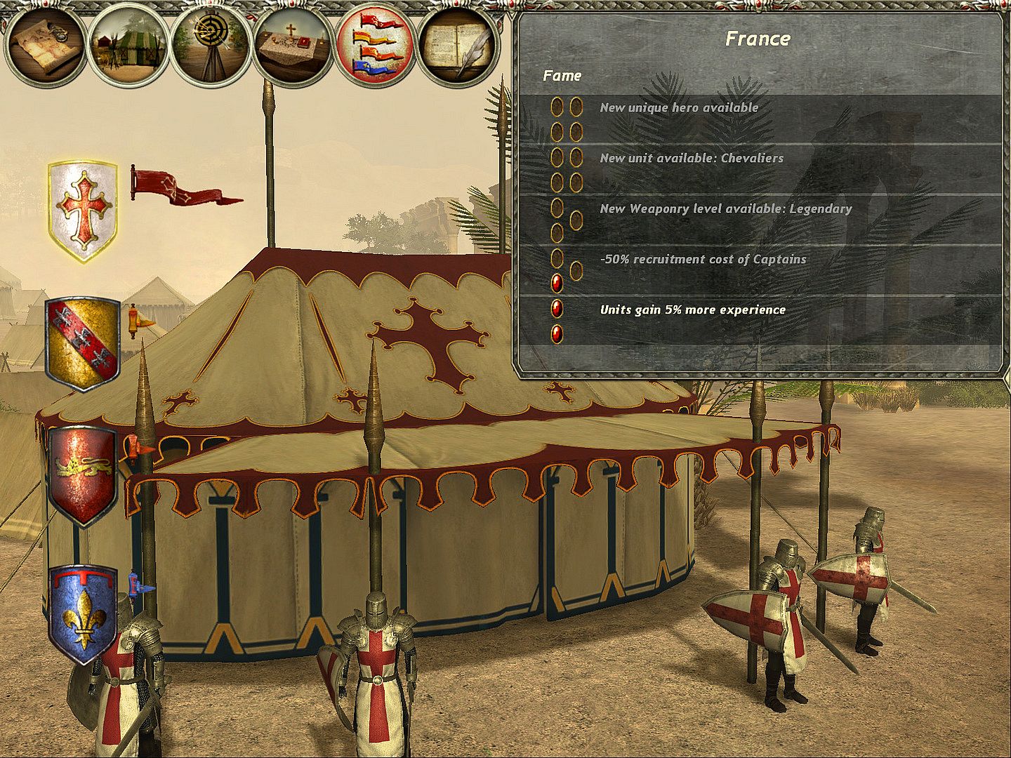 • Factions — The crusader army in the game is about just as divided as it had been historically. The various power groups of the army are called factions, each with a strong nation in charge and they all offer various submissions for their allies. Players should be careful which the faction they prefer, as they forge ties with one nation they slowly exclude the others; however, a faithful ally will get precious rewards like ducats, special units and skills and finally a new, unique hero.