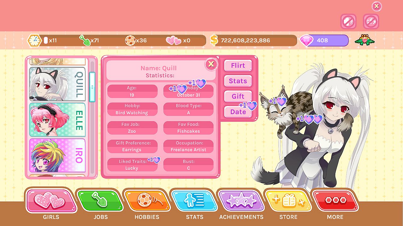 Welcome to Crush Crush – the Idle Dating Sim! Begin your quest to win the hearts of your town's lovely ladies… after a few disastrous intros! Impress the girls by building your stats, unlocking jobs, and earning promotions. Woo them with romantic dates, thoughtful gifts, and a tickle fight or two! Work your way up from Frenemy to Lover, and unlock tons of amazing content along the way.