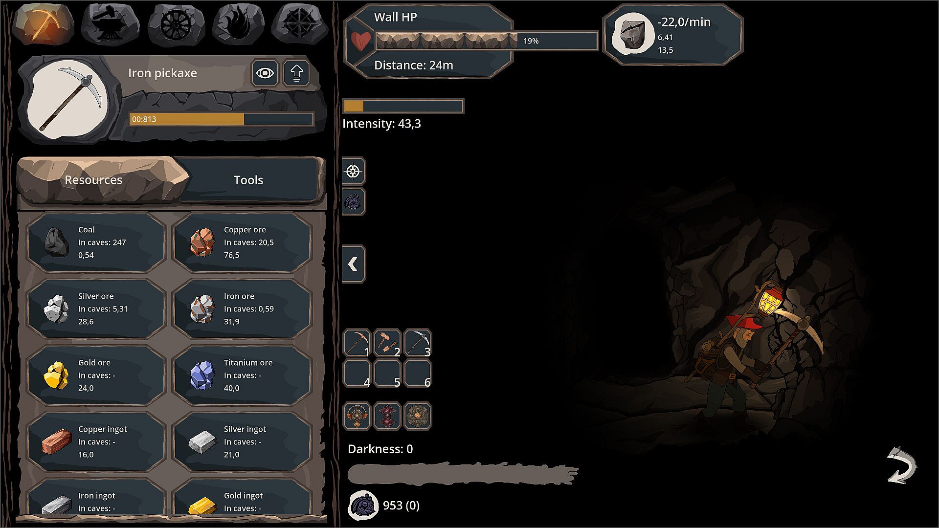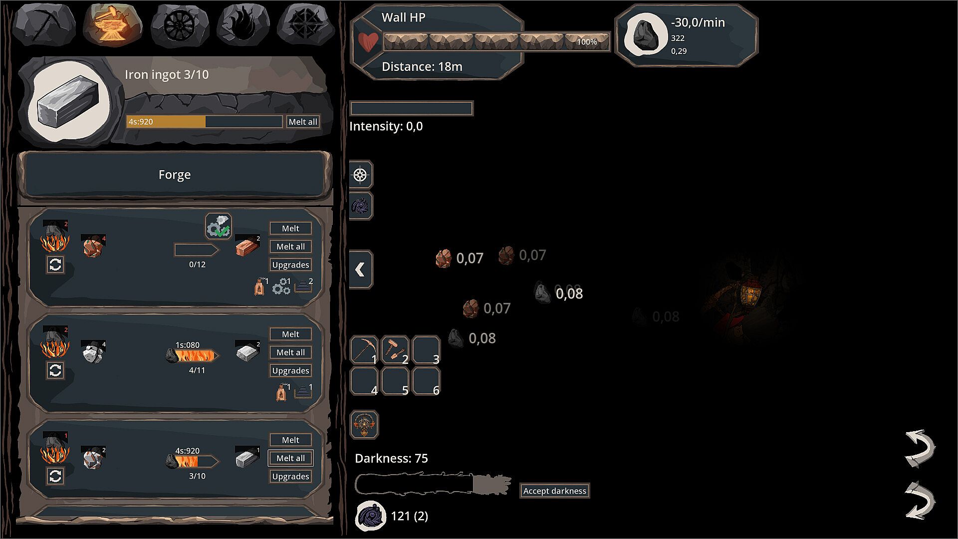• Mine resources that burn and upgrade them to create a brighter light to help fight the darkness