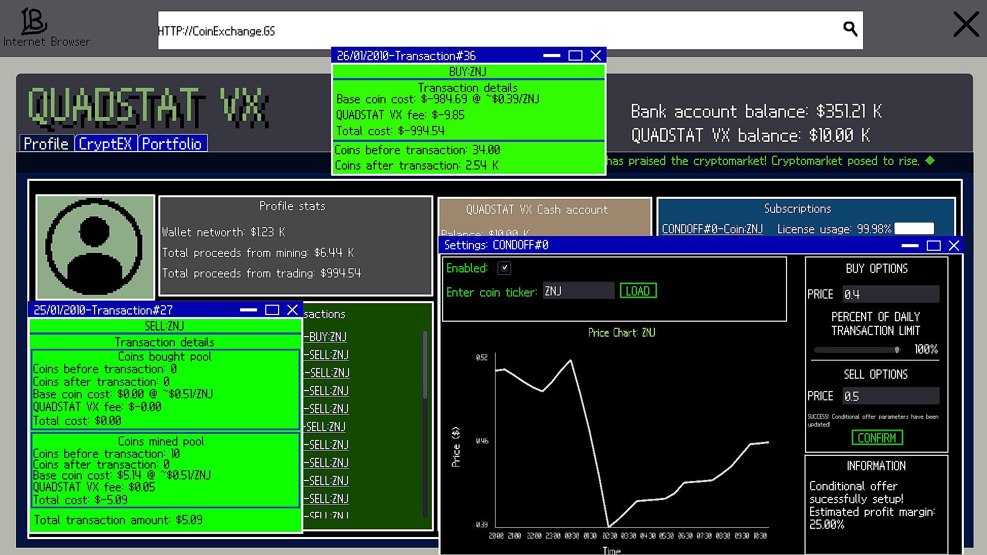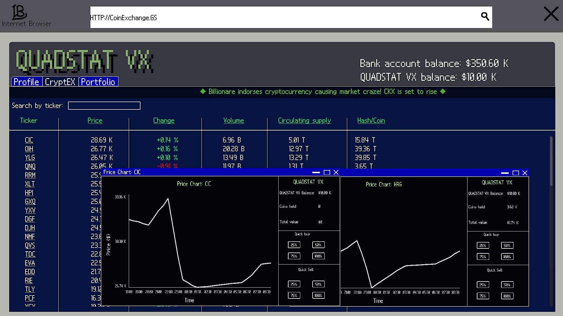 - Procedurally generated cryptocurrencies with simulated market trends.