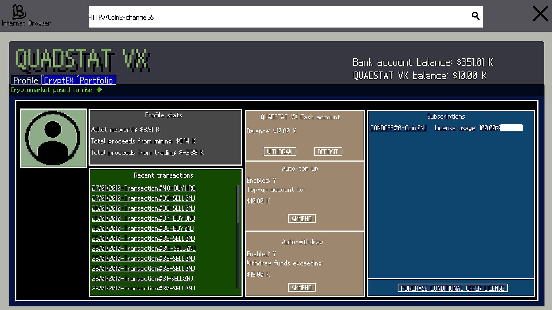 Challenge yourself on the QUADSTAT VX exchange, manage endless instances of servers, shield yourself from the random, chaotic world events and optimise your cryptoRIG to take over the market!