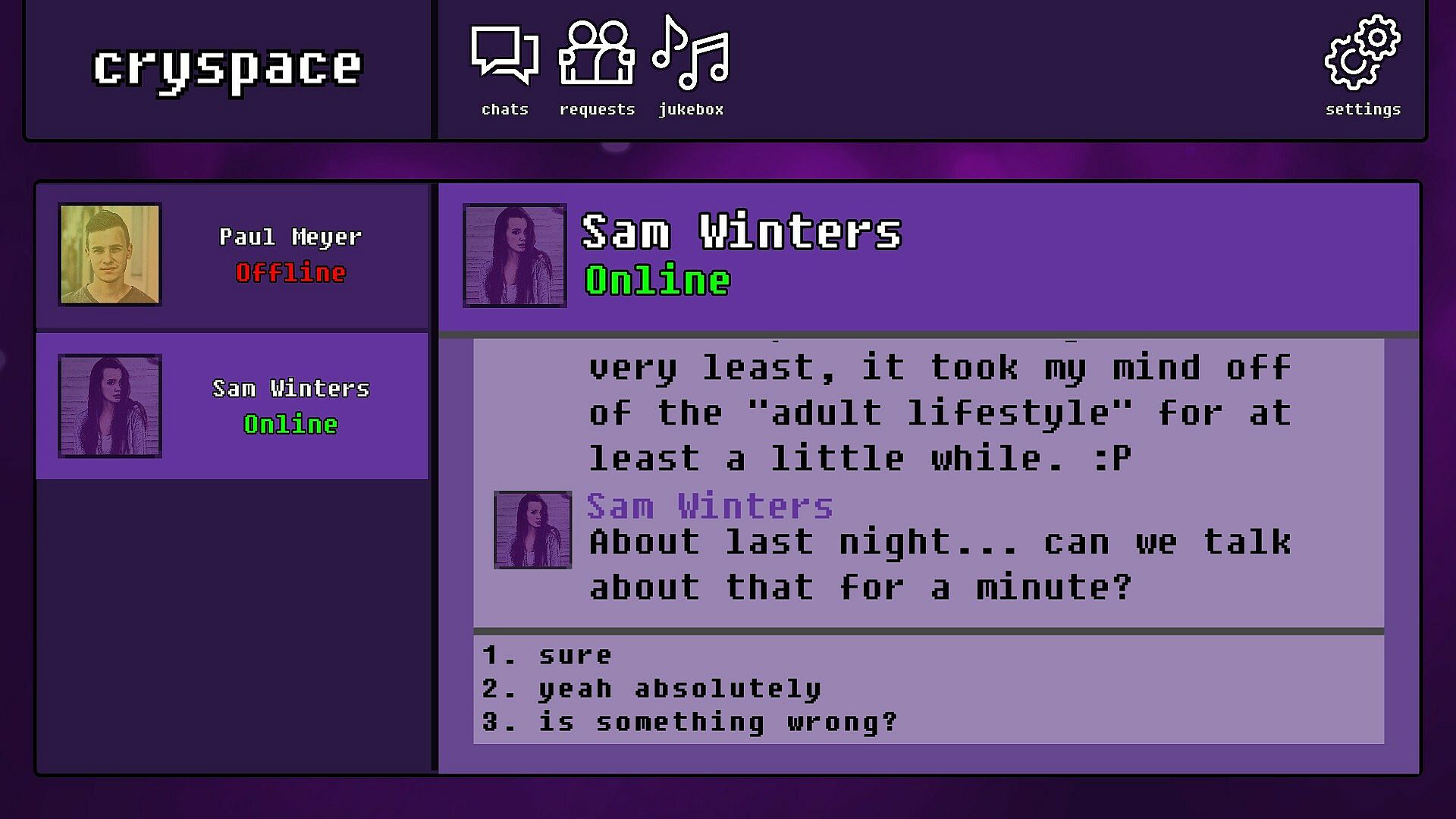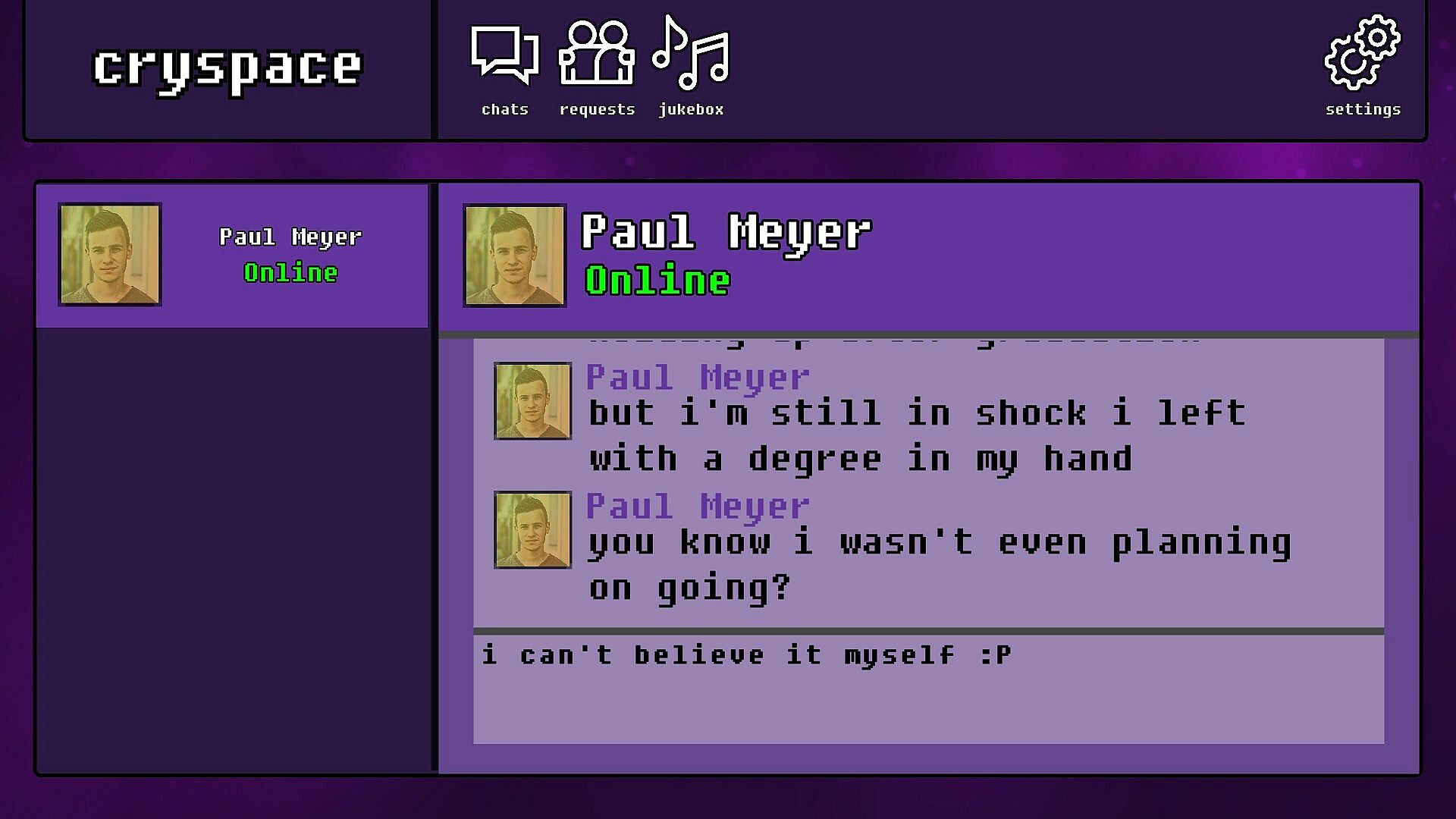 Welcome to Cryspace. Fresh out of college, you decide to make an account on the new social media platform. Upon joining, your lifelong friend, Paul Meyer, adds you, and invites you to a house party. Could this be your chance to live the "college lifestyle" you always dreamed of?