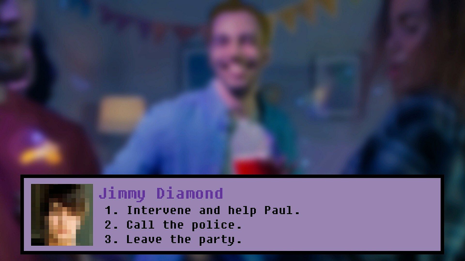 Making your way upstairs in your search, you're met with a frightening scene. Paul is being pressed by a man, Jordan Myra, who happens to be the ex-boyfriend of Paul's current girlfriend, Crystal Mendez. He's threatening violence against Paul, seemingly out of pure jealousy. Will you call the cops on him? Take on the fight for yourself? Maybe you decide to leave the party and not get involved at all?