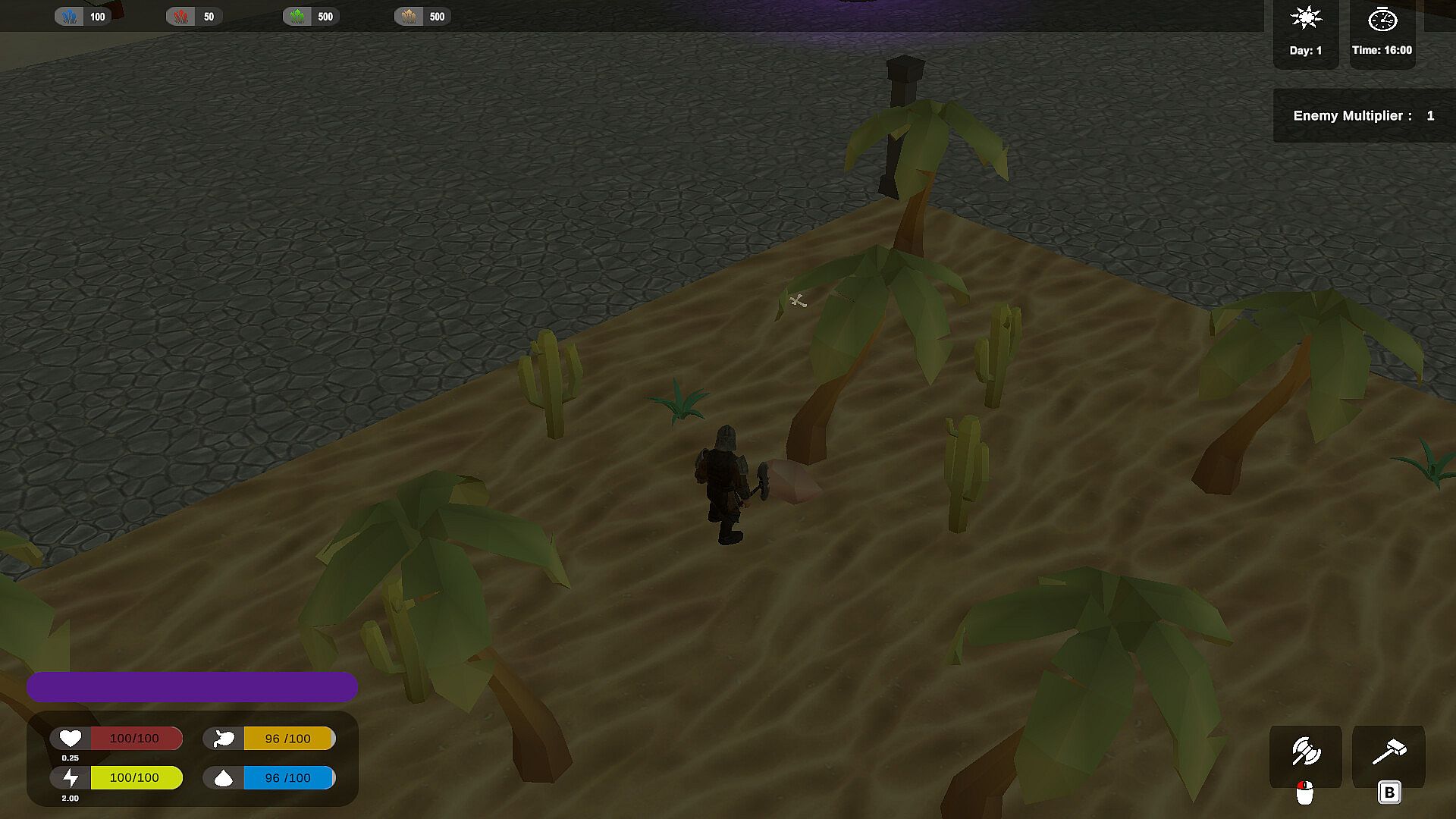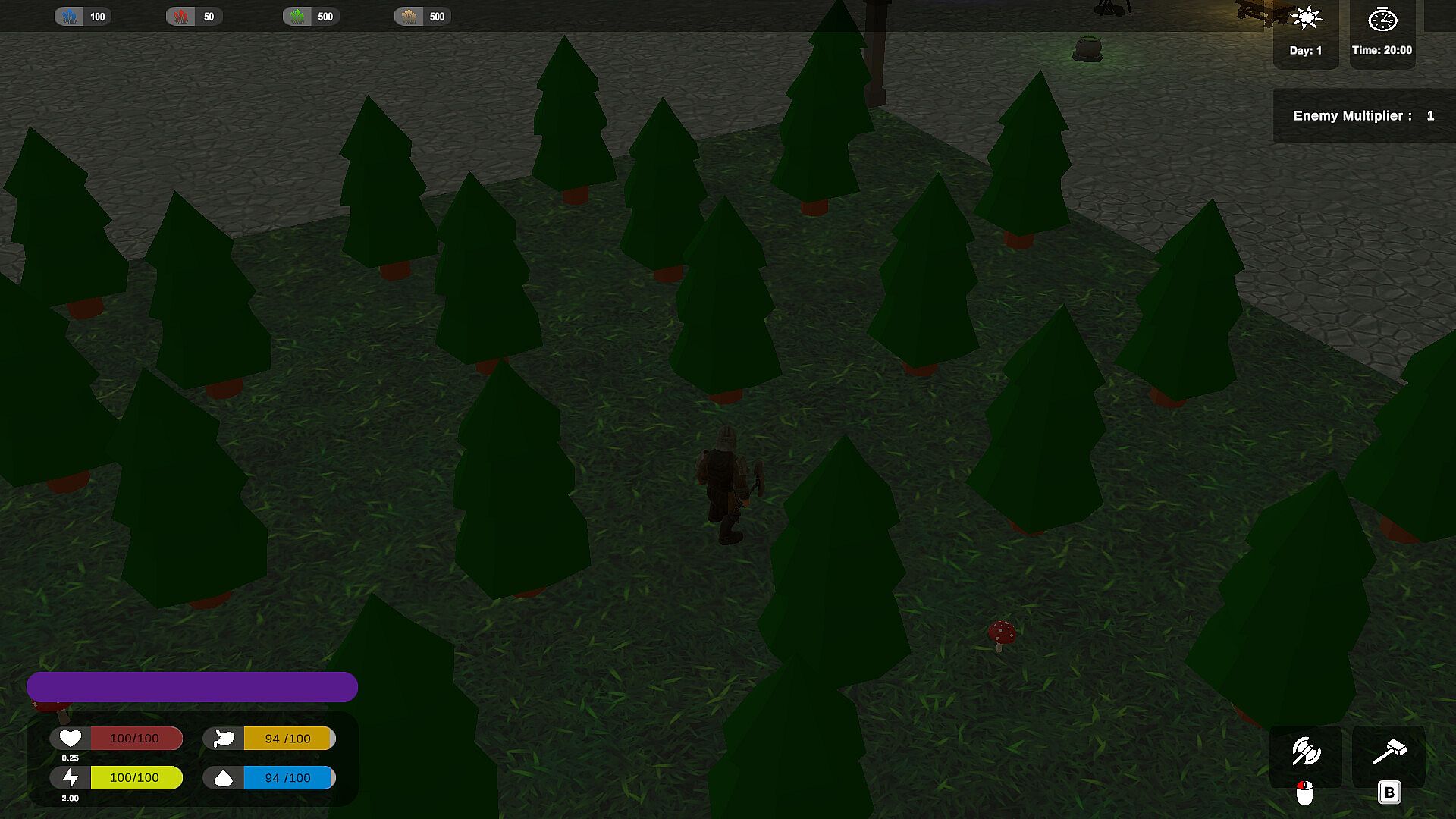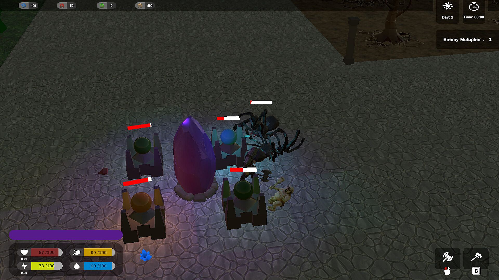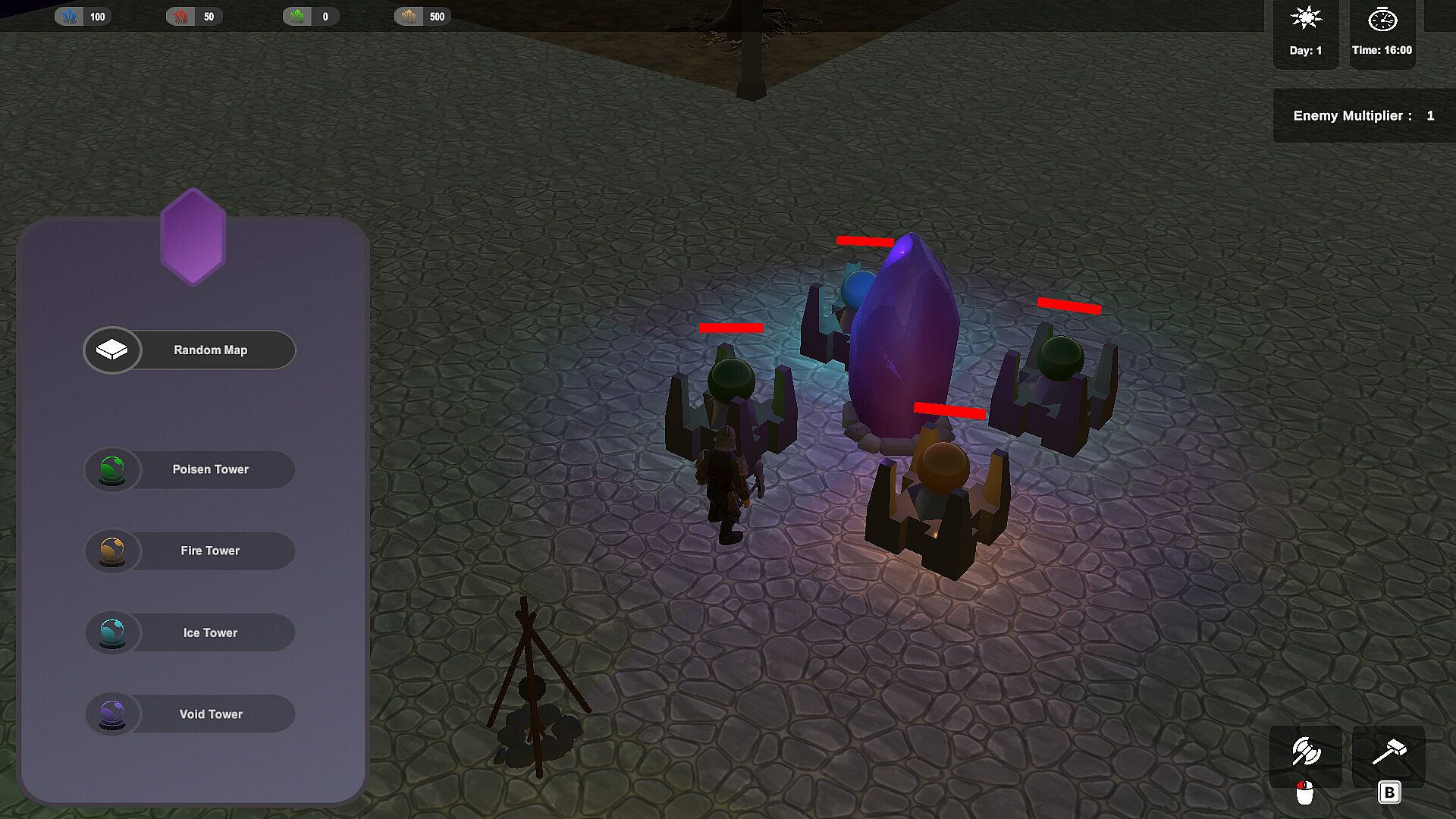 The Crystal Guardian game is a tower defense game based on strategic elements of time management and tower placement according to the locations of different biomes. Every night at 00:00, different enemies emerge from different biomes and attempt to destroy the crystal. You must strategically place towers that will inflict more damage to the creature of that biome, as different enemies come from different biomes. However, remember that the difficulty of the game is not only the enemies but also finding solutions to hunger and thirst. To do this, you must explore and gather resources during safe hours in the daytime. Each biome has different resources. The game starts over when the crystal is destroyed or when you die, so try to learn from your previous games and survive until the 100th day. Good luck, guardians, in your mission!