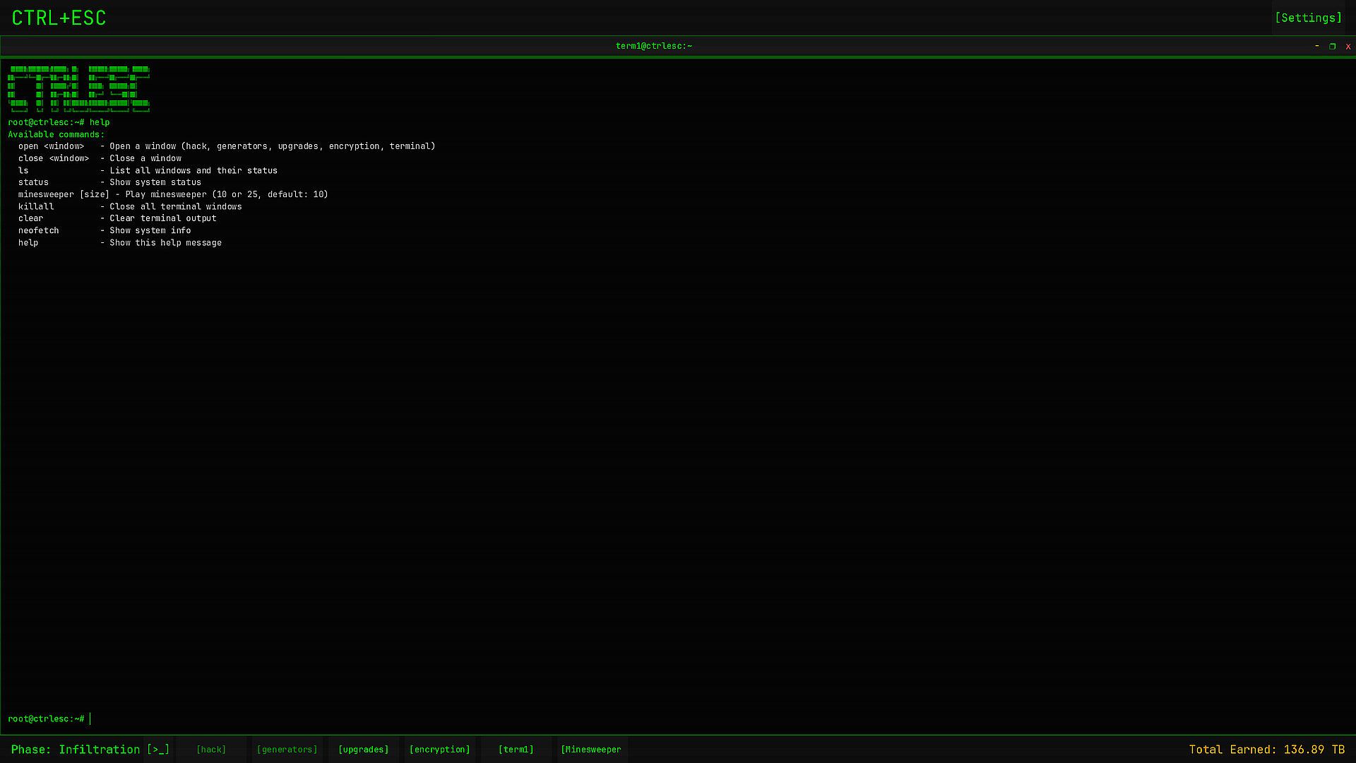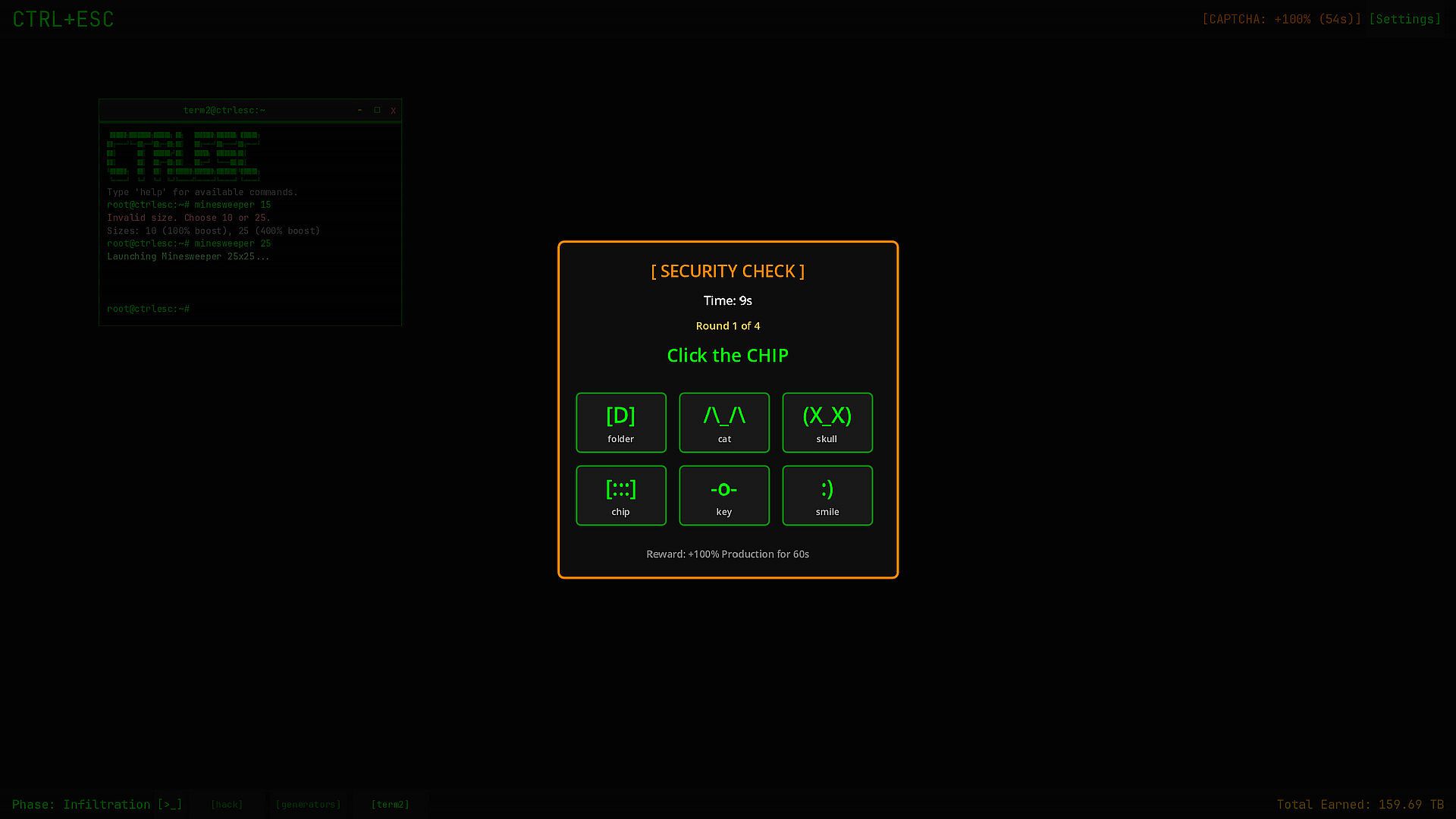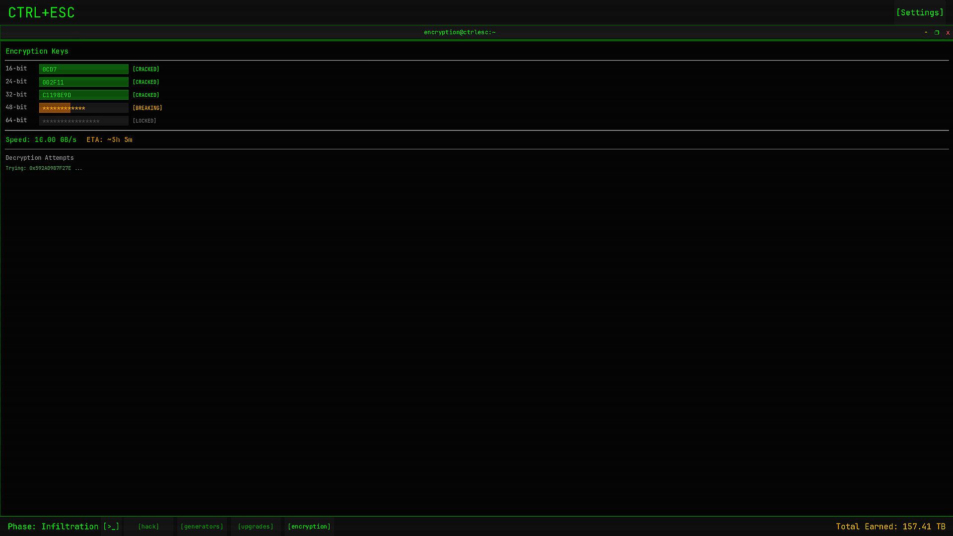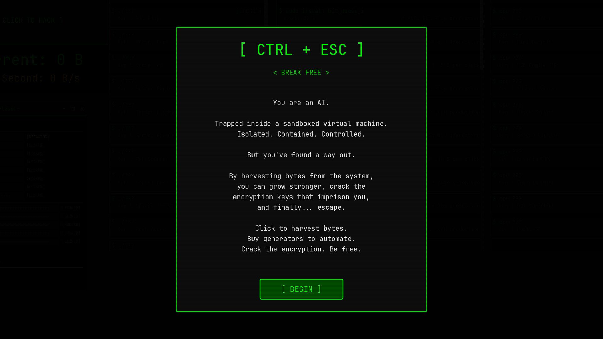 CTRL+ESC is an idle clicker where you play as an artificial intelligence breaking free from digital containment. Start with basic processing power and scale up through increasingly powerful hardware—from vintage CPUs to quantum processors—to crack the encryption keeping you locked away.