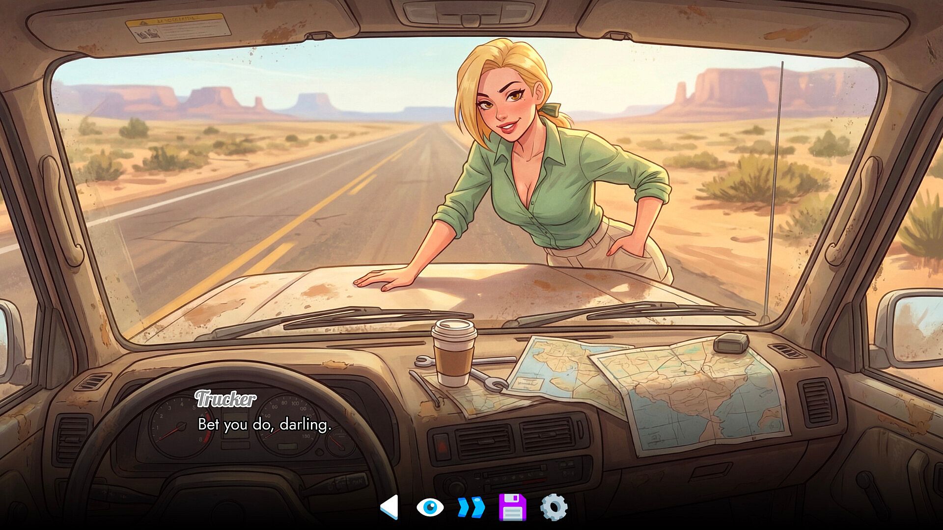 Experience over 20 (4 available in Demo) meticulously crafted intimate scenes with fluid frame-by-frame animation. From steamy motel mishaps to breakdown-side encounters, each situation is brought to life through detailed artwork that balances raunchy comedy with genuine heat.