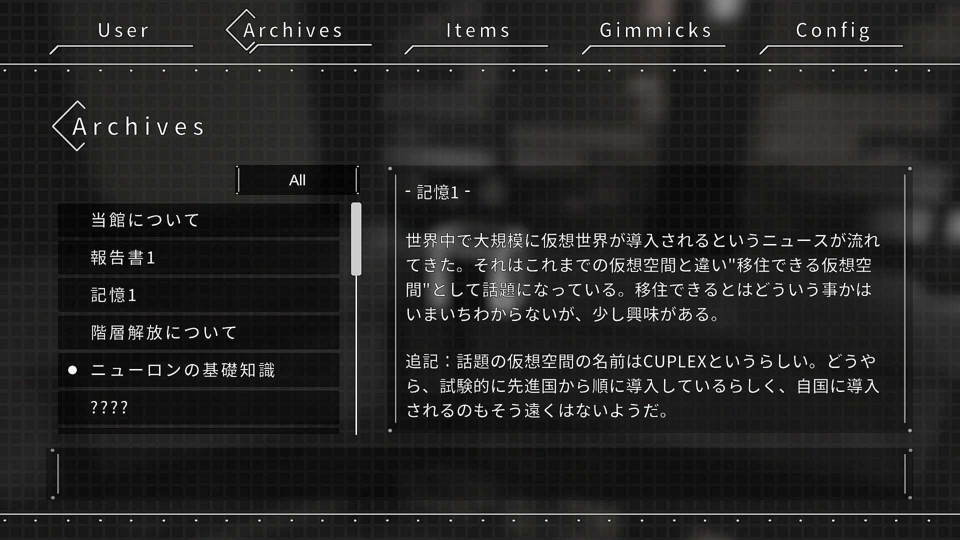 Welcome to the new virtual space, "CUPLEX". This is a virtual space, where unlike traditional ones, all senses... including sight, hearing, smell, taste, and touch, are interconnected. The protagonist, "Cube" hacked into the "Library" within CUPLEX in search of specific information. As he progresses through the Library, the truth behind CUPLEX gradually unfolds. Will he be able to accomplish his mission in the end...?