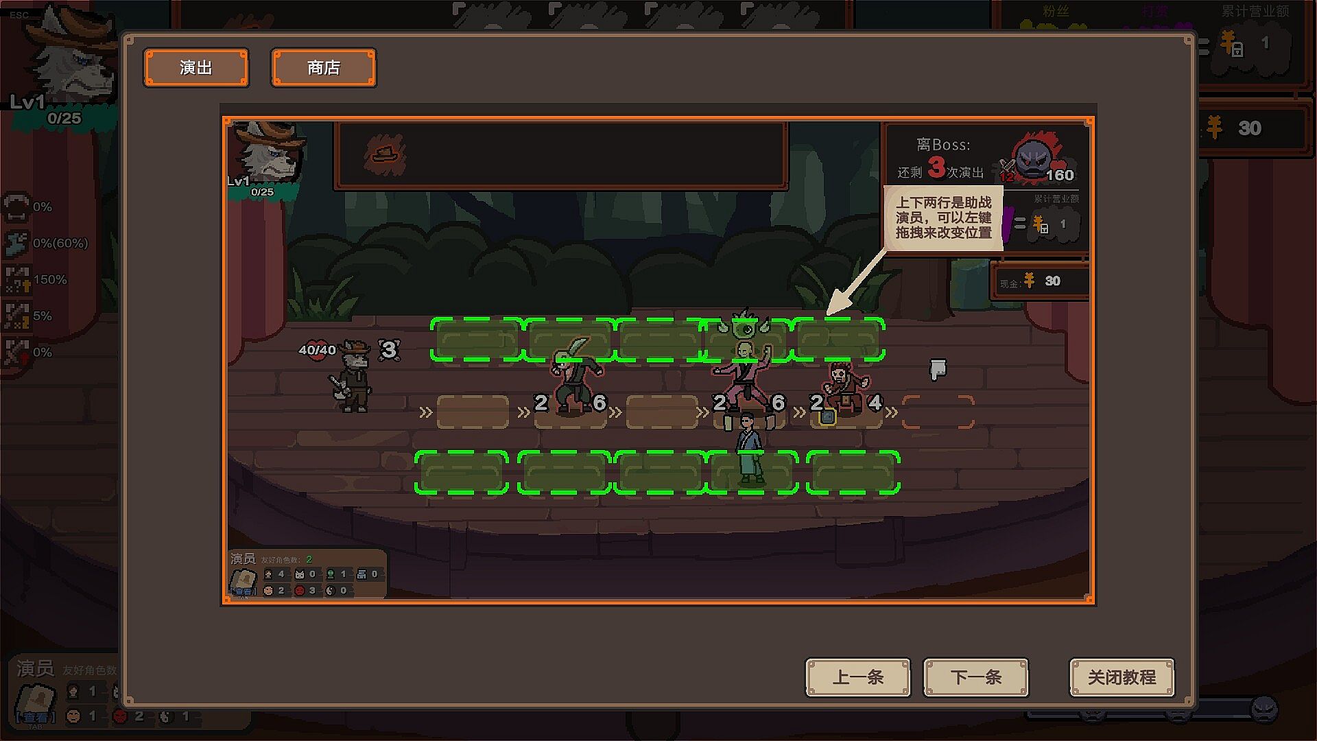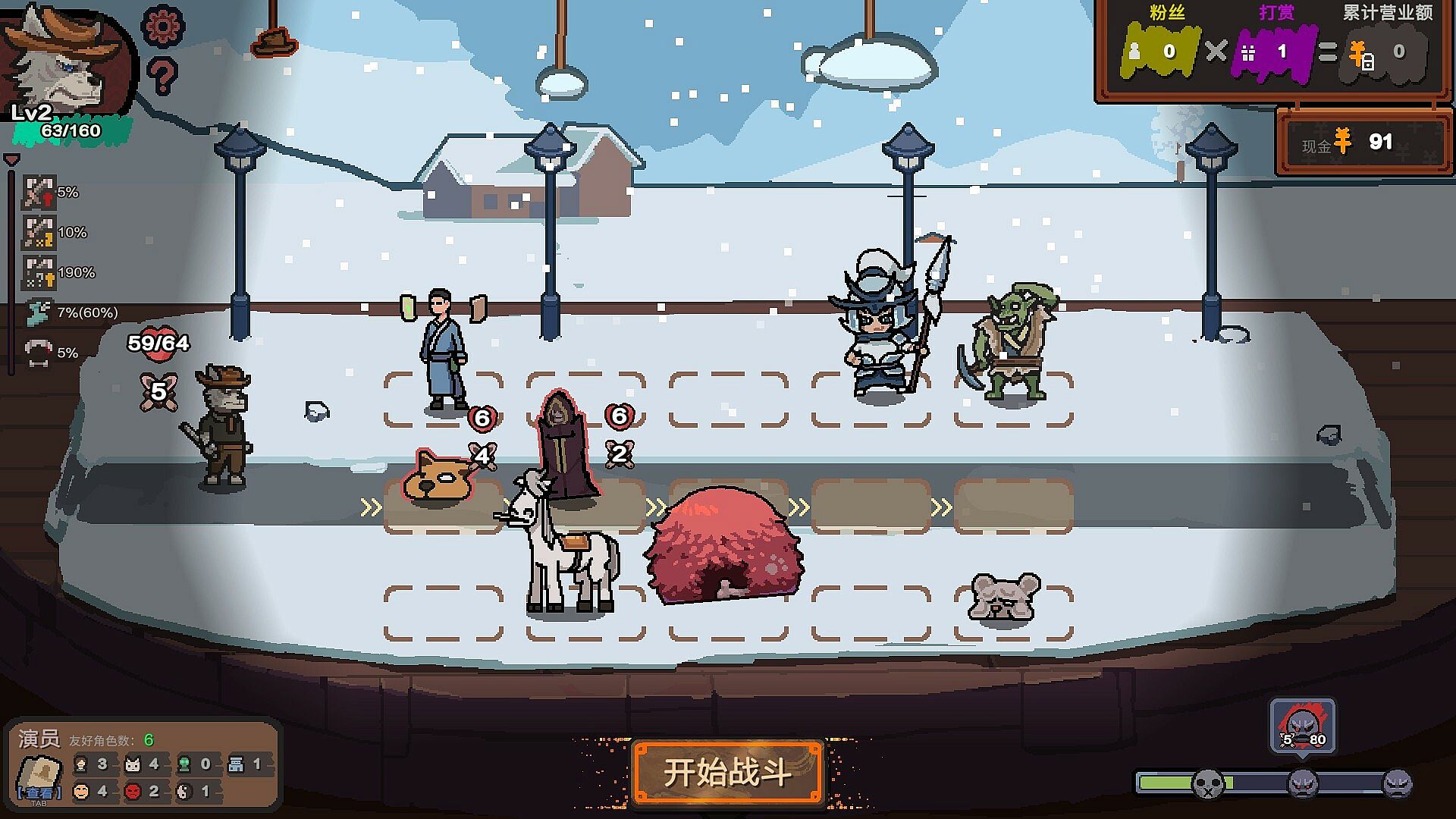 Performers are either Good or Evil. Hire the former to help you out, and the latter to stand as enemy antagonists. Set the stage, and take on the lead role! Battle your way through each stage earning tips from your fans, and put on a show they'll remember.