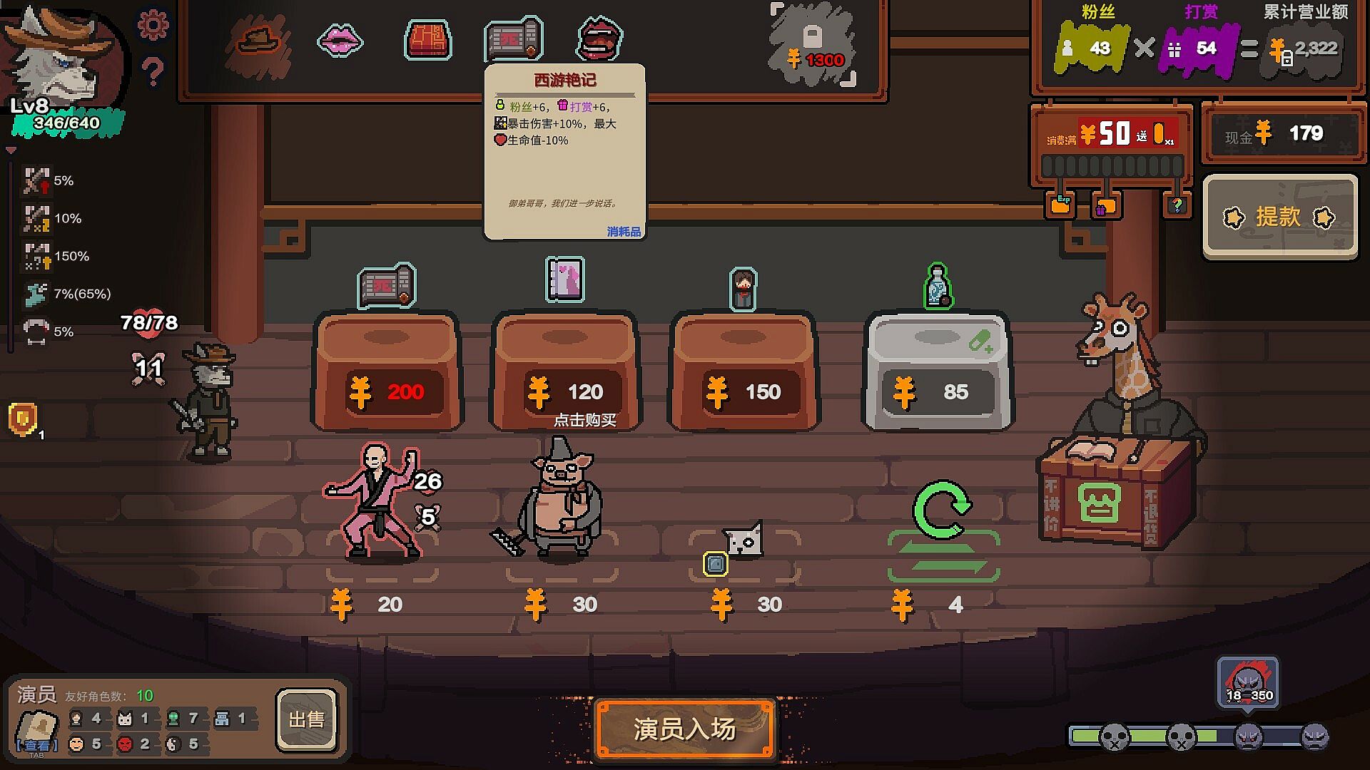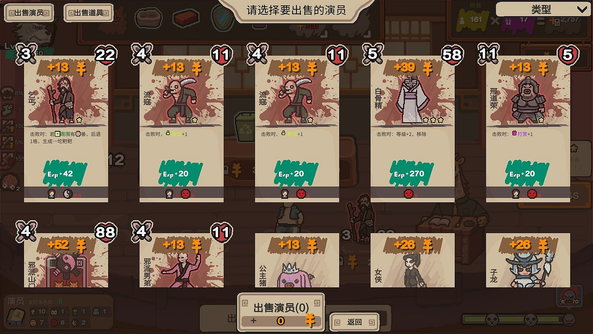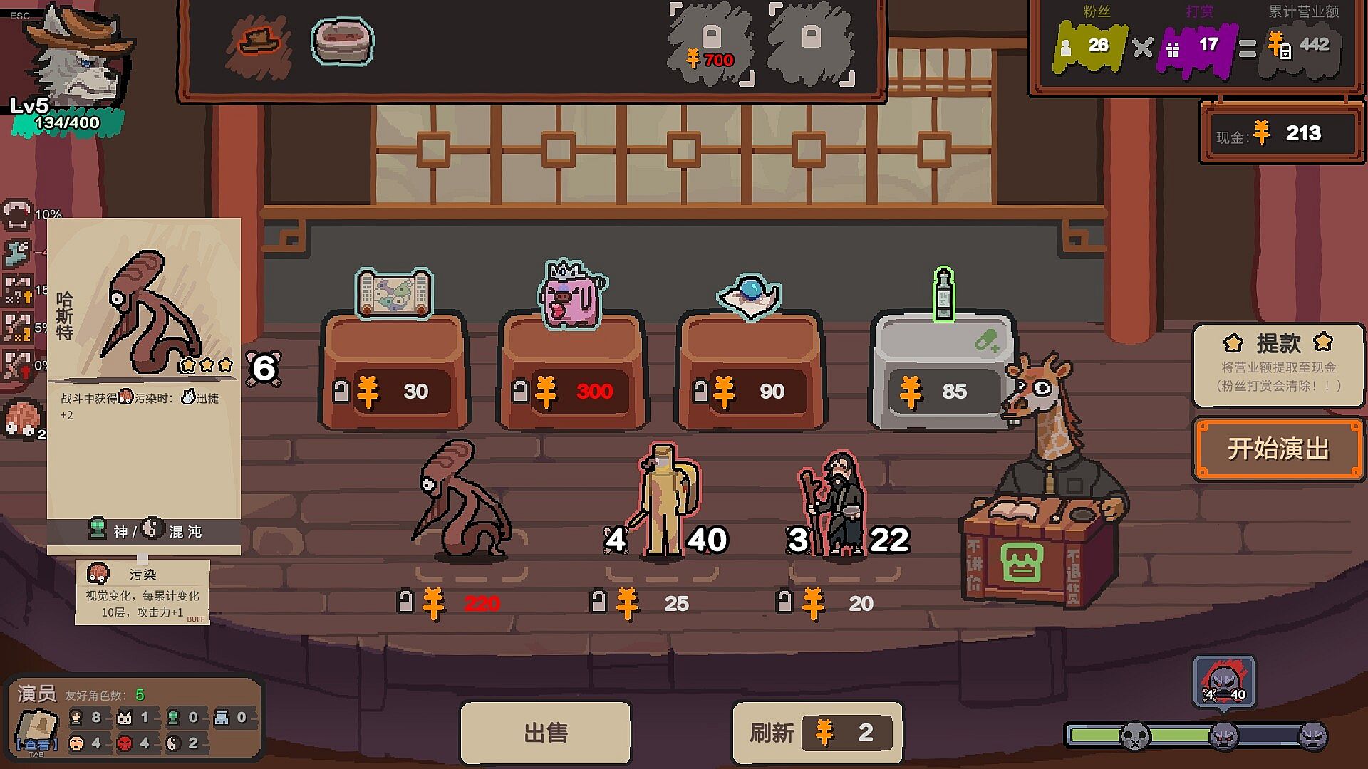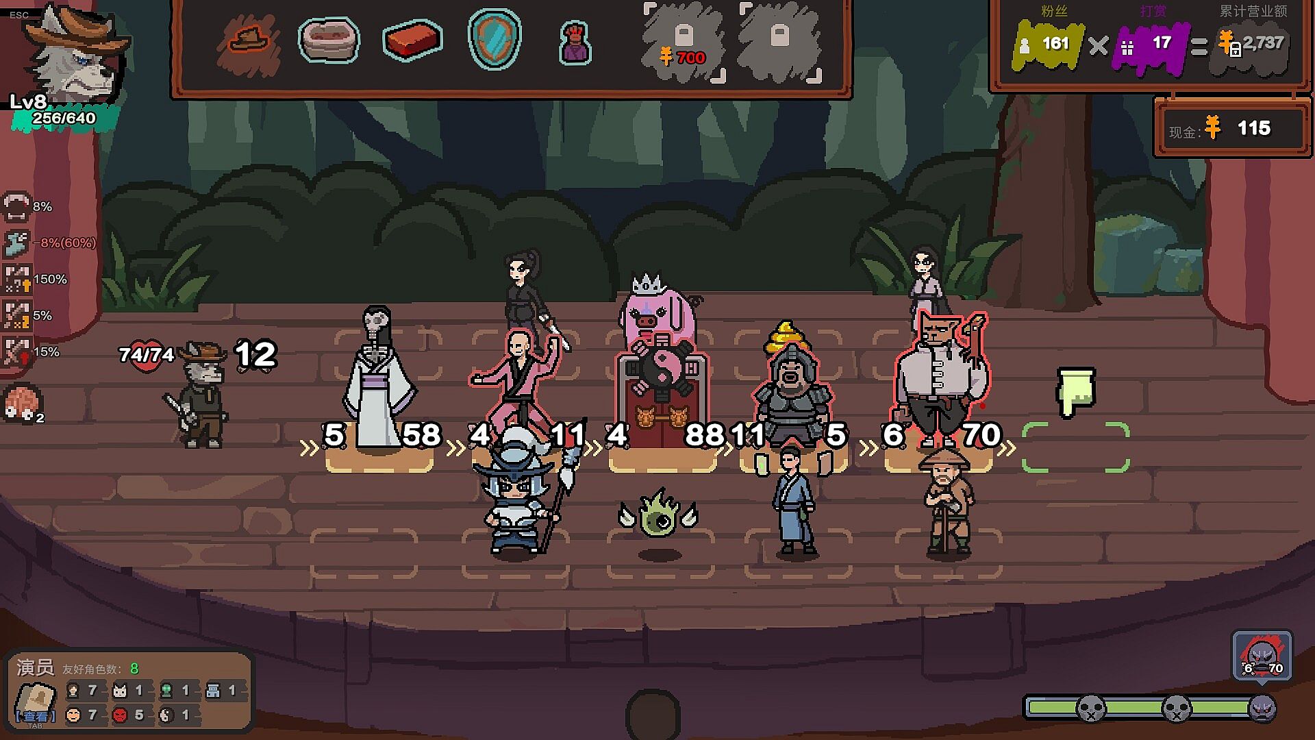 Collect items and hire performers to build a strategy all your own. Curtain Call boasts over 100 Good and Evil performers along with 100 different items, with a range of synergies between them for nigh-on infinite possibilities. Withdraw from your savings, sell performers, refresh or lock in shop offerings for next time around... Push your strategy to the limit as you micro-manage your way to victory.