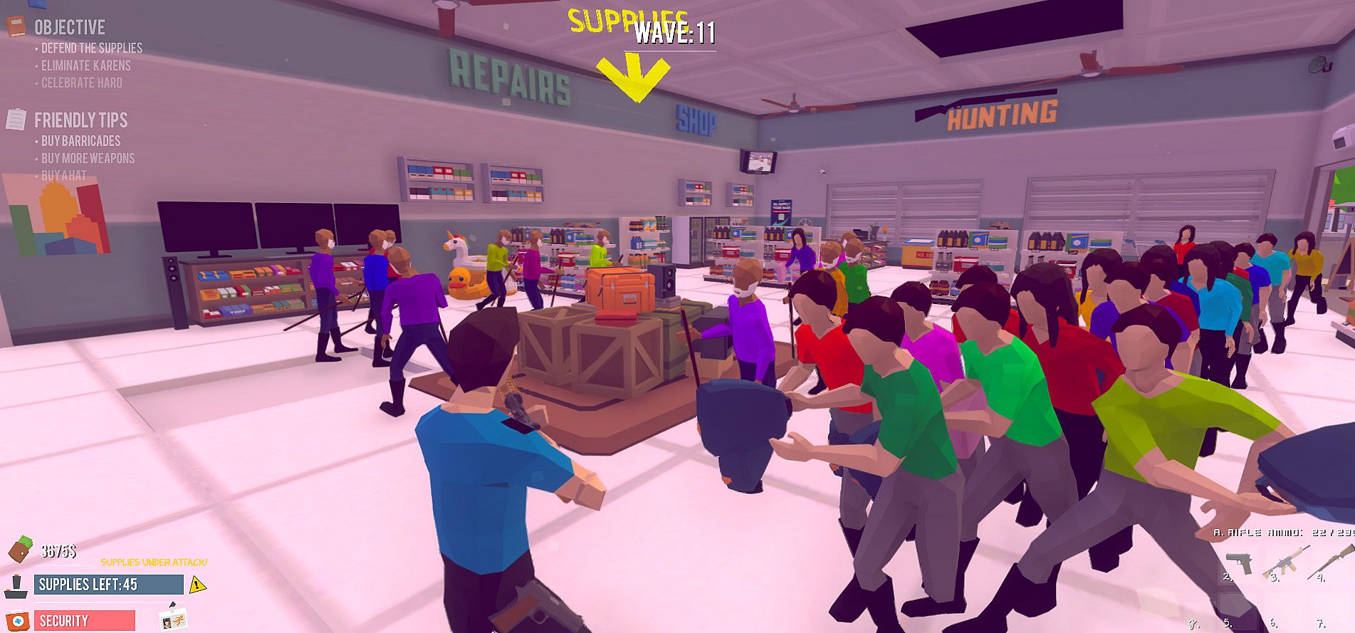 Welcome to Customers From Hell. A wave-survival game where you have to protect supplies and eliminate annoying customers ("Ahem .. Karens") and upgrade your base with each wave becoming more and more challenging as Karens gets more aggressive. Protect your supplies and base, build barricades, traps, upgrades, weapons and survive for as long as possible!