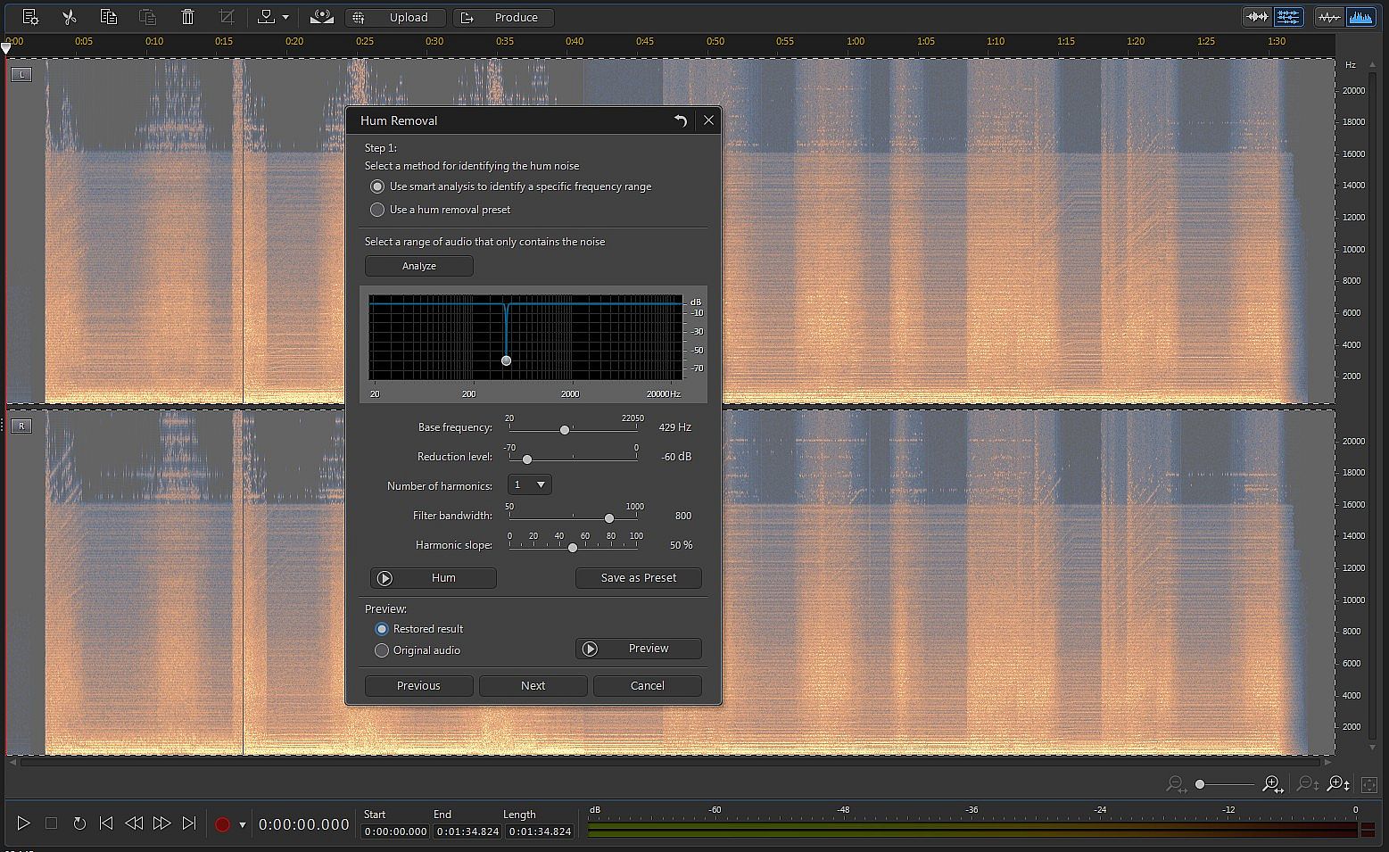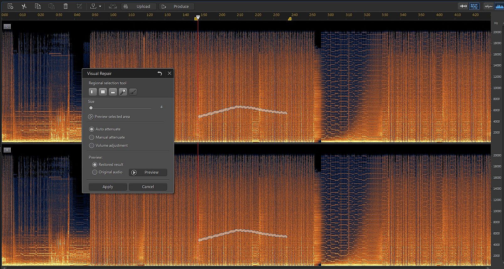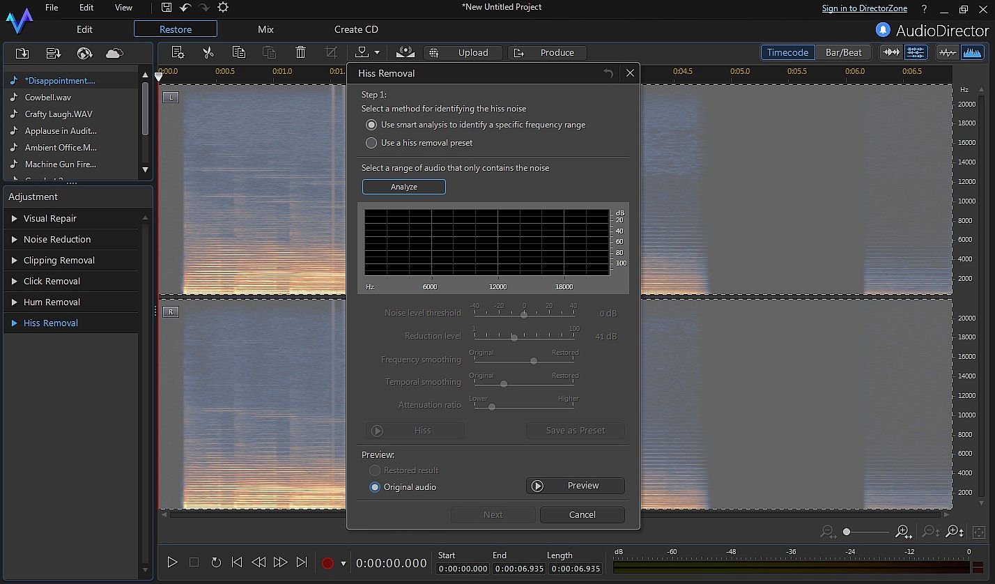 Removing audio imperfections in sound recordings is made easy with an advanced visual restoration interface that lets you use both your eyes and ears to identify and isolate audio problems. A detailed spectral frequency display accurately visualizes what your ears hear, clearly highlighting areas that require audio repair and enabling quick and simple removal of hisses, hums, pops and crackles.