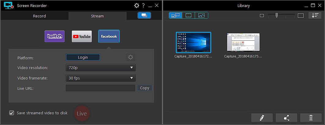 Using Screen Recorder you can connect directly to the platform of your choice and stream video in up to Full HD quality. Livestreaming gameplay to Twitch, YouTube or Facebook is a great way to share your love of gaming with the world.