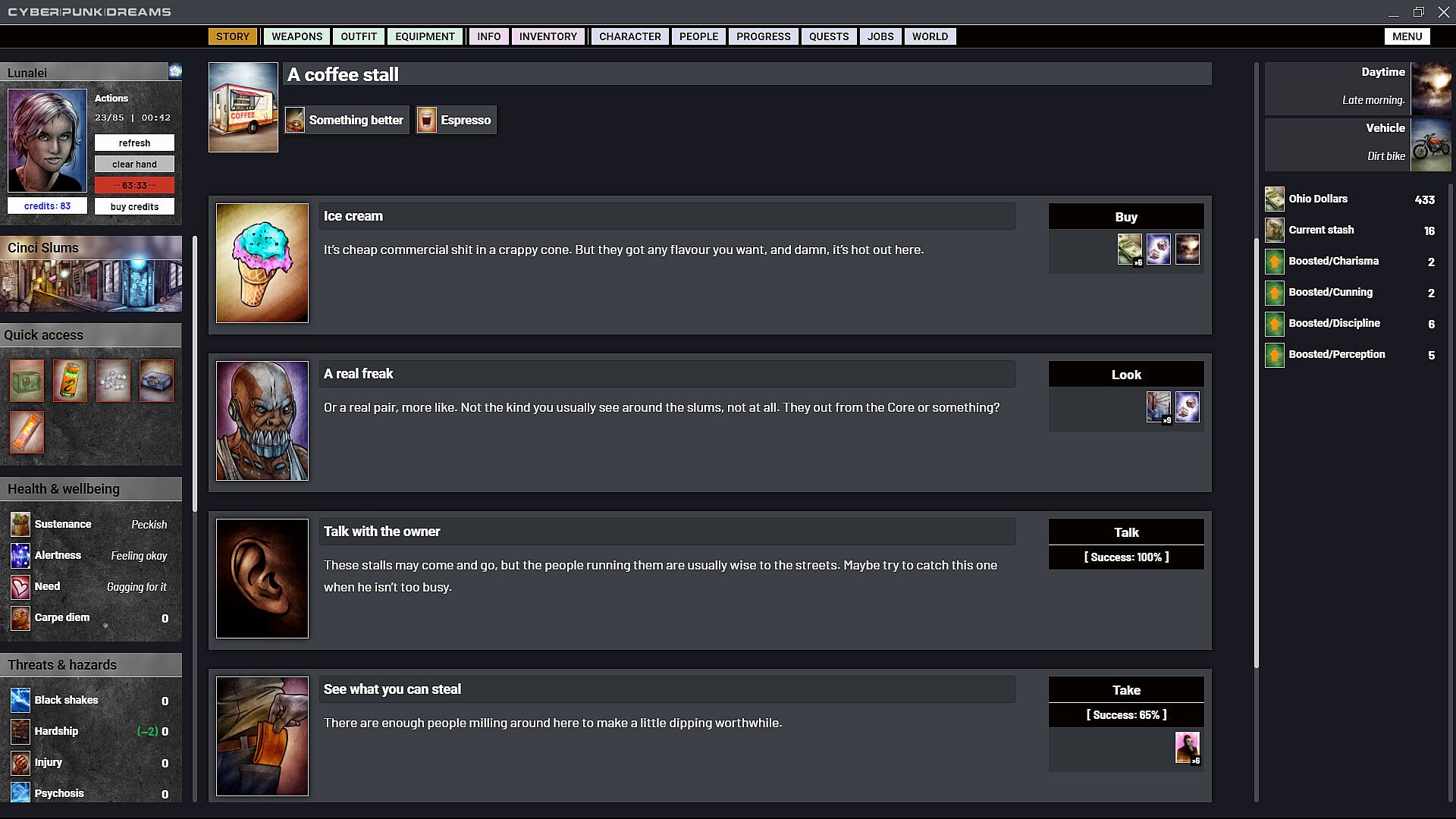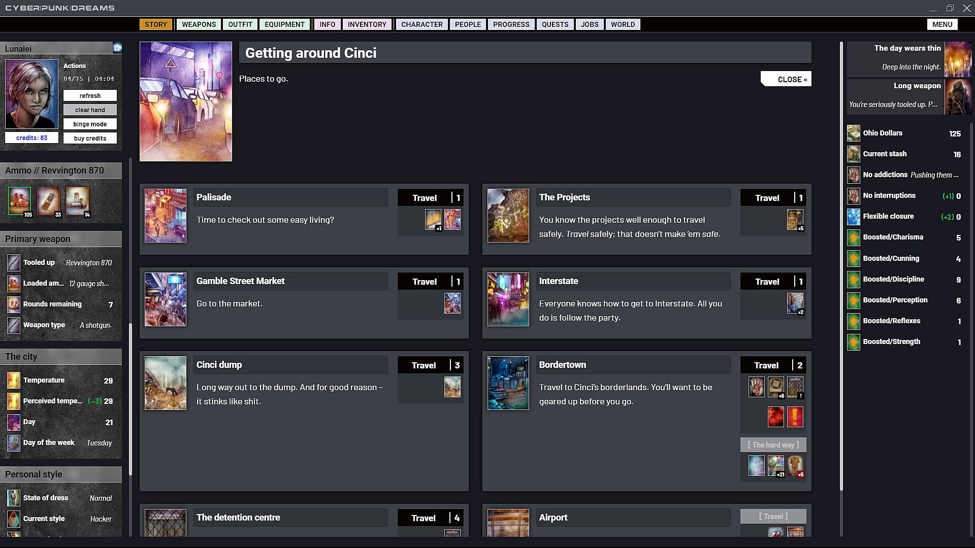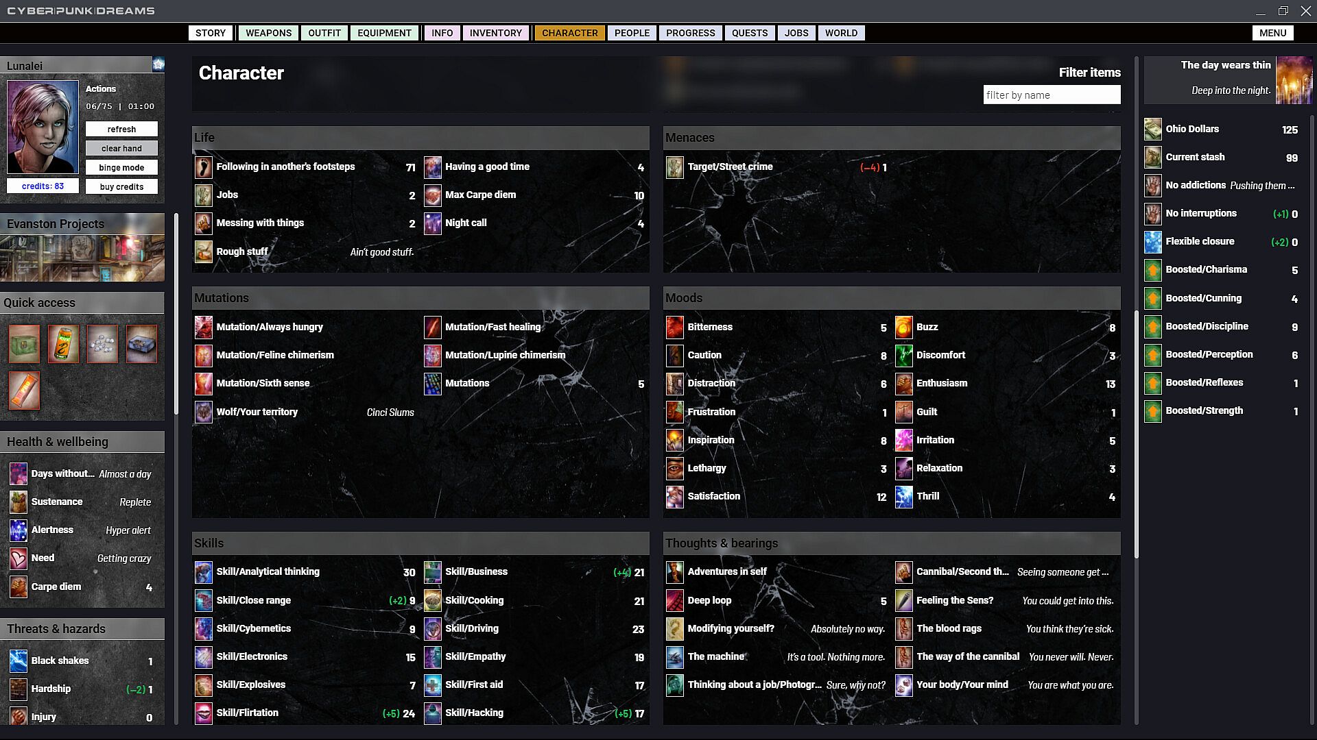cyberpunkdreams offers highly customisable character creation that continues throughout your entire time in Cincinnati. Become who you want to be. Occupy your skin in any way you choose. Gender, sexuality, cybernetics, mutations, clothing and equipment all combine to create a fluid system with any number of possibilities. Choose not just what you do but why you do it. Respond to the things that happen to you with glee or bitter remorse, and choose which of these inner feelings to share with the NPCs who are close to you.