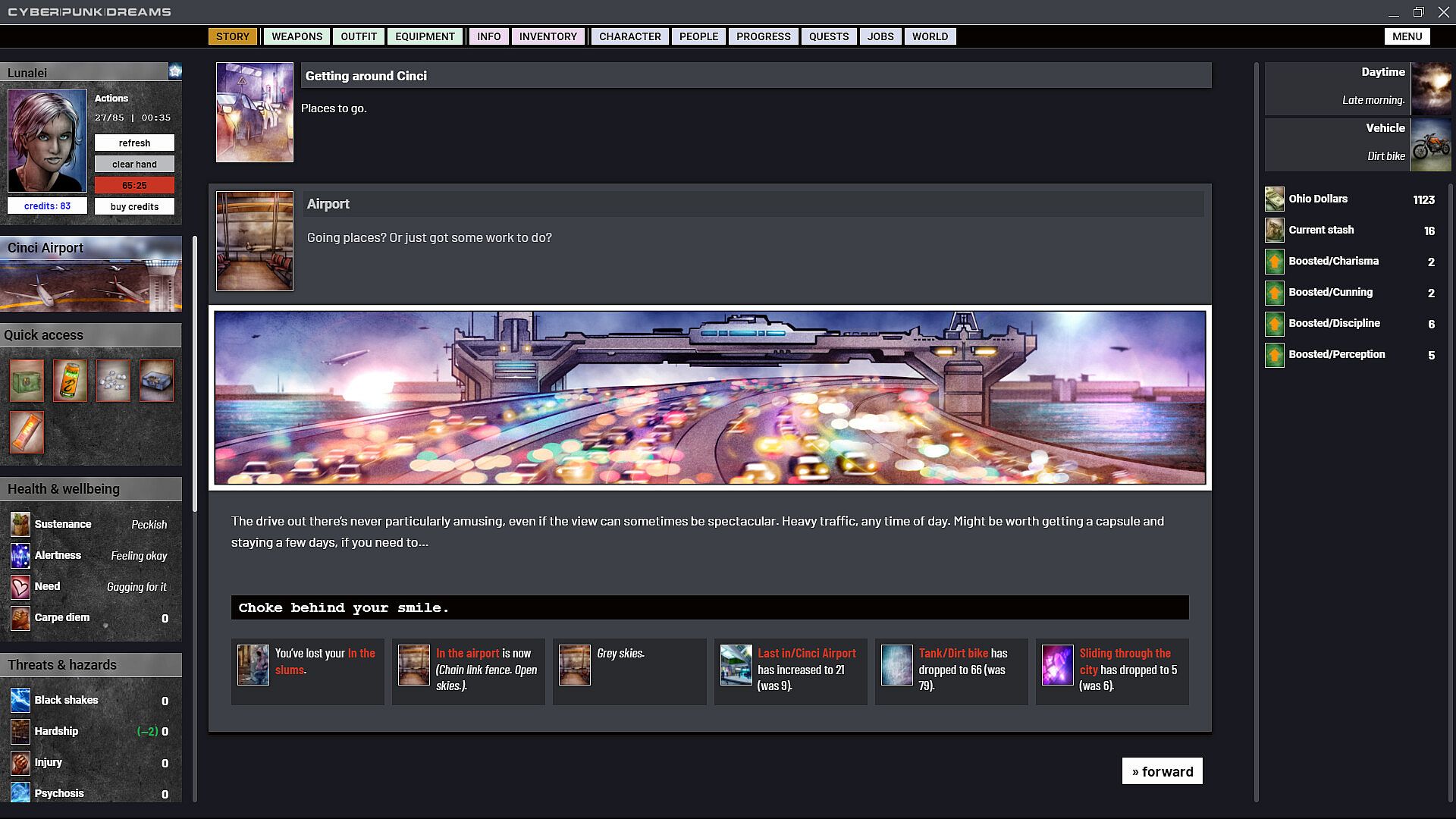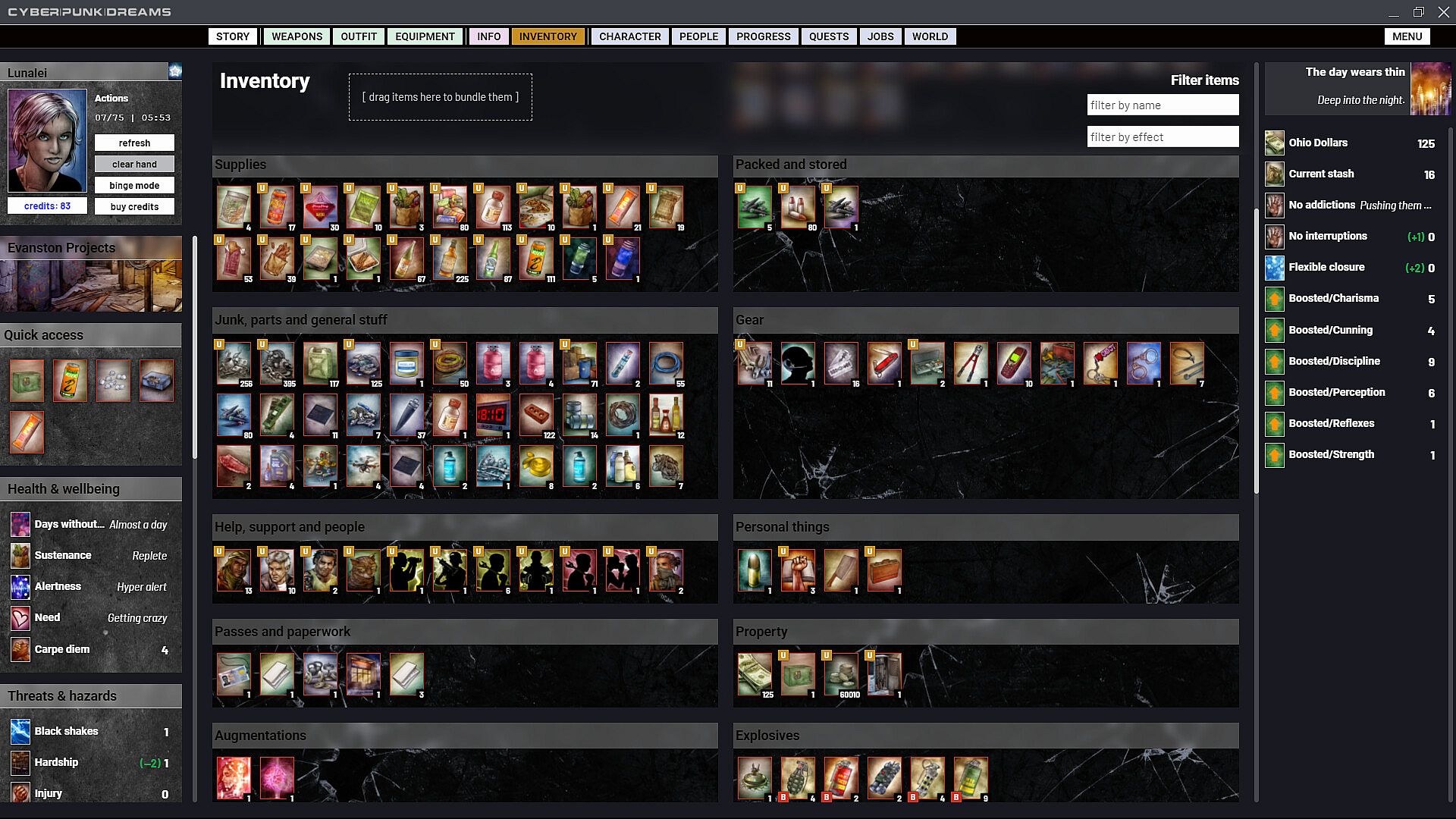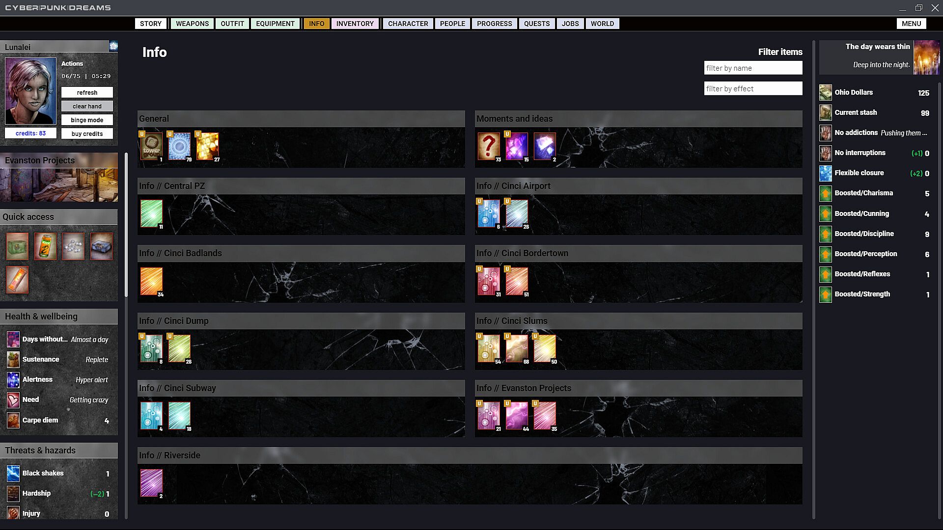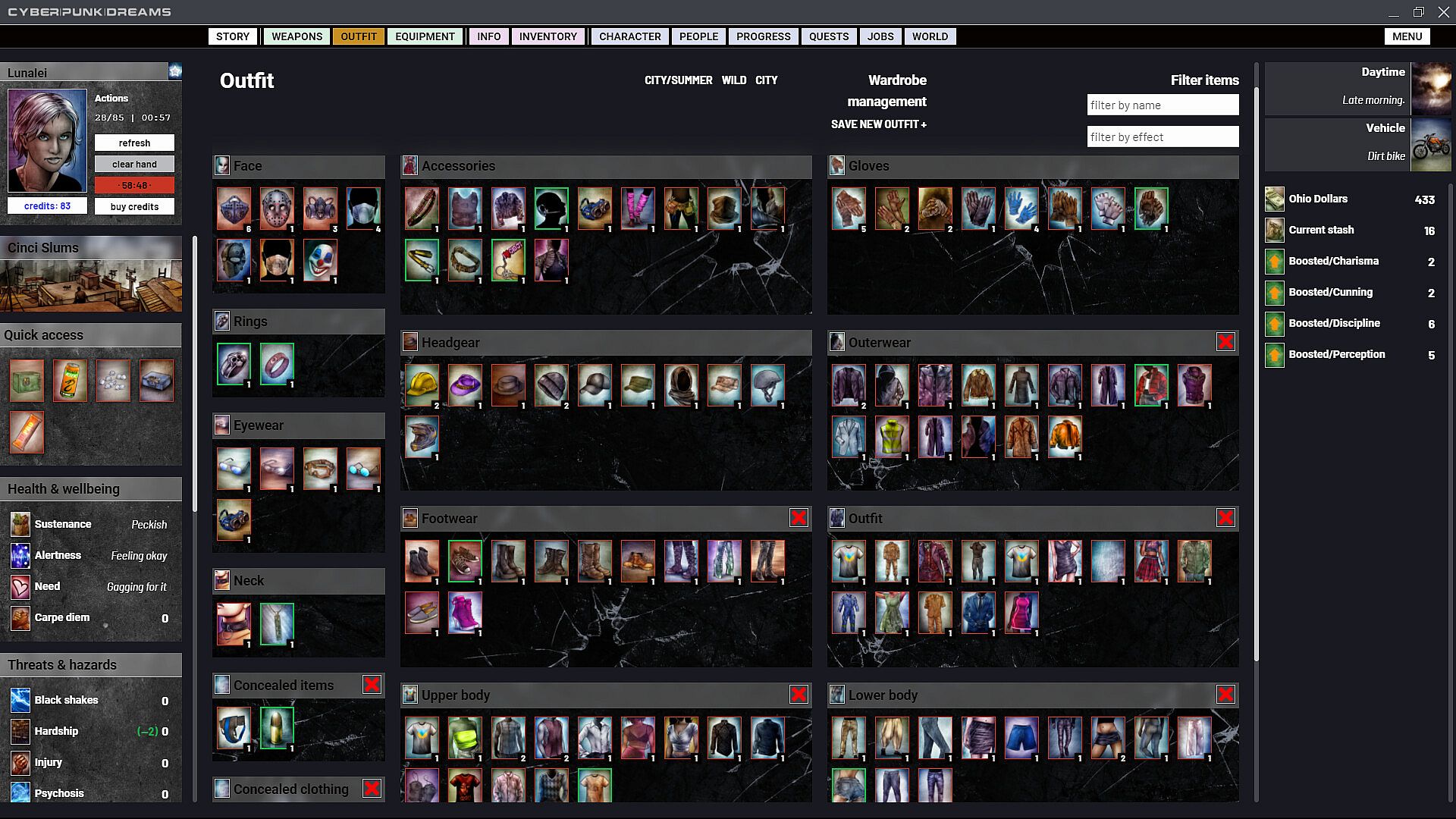 cyberpunkdreams offers highly customisable character creation that continues throughout your entire time in Cincinnati. Become who you want to be. Occupy your skin in any way you choose. Gender, sexuality, cybernetics, mutations, clothing and equipment all combine to create a fluid system with any number of possibilities. Choose not just what you do but why you do it. Respond to the things that happen to you with glee or bitter remorse, and choose which of these inner feelings to share with the NPCs who are close to you.