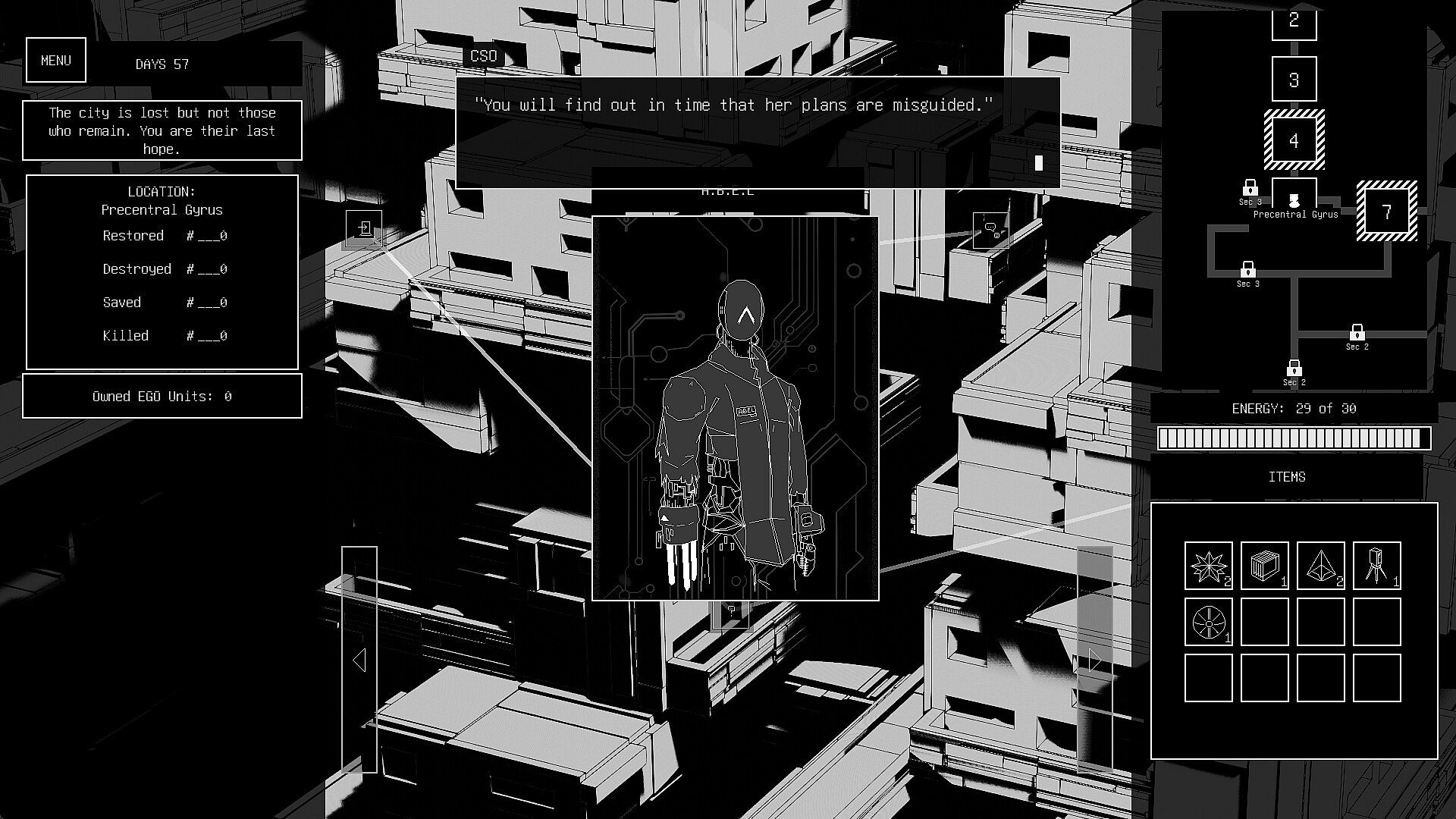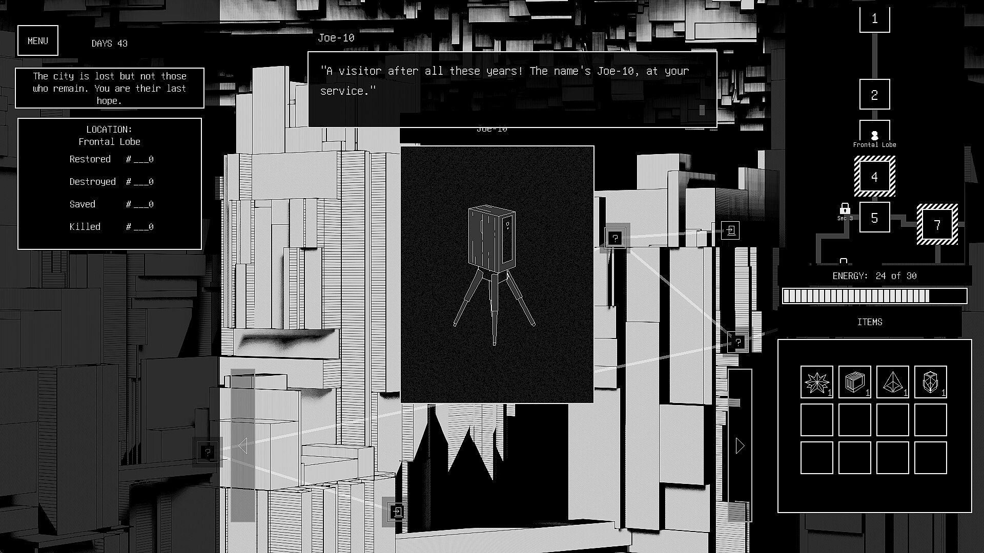 As you navigate the city's 45 districts, each linked to its vast neural network, you’ll encounter strange and sentient beings—Dendrone, Cybersaur, the Twins, and the Dross Bishop—each holding fragments of your past.
