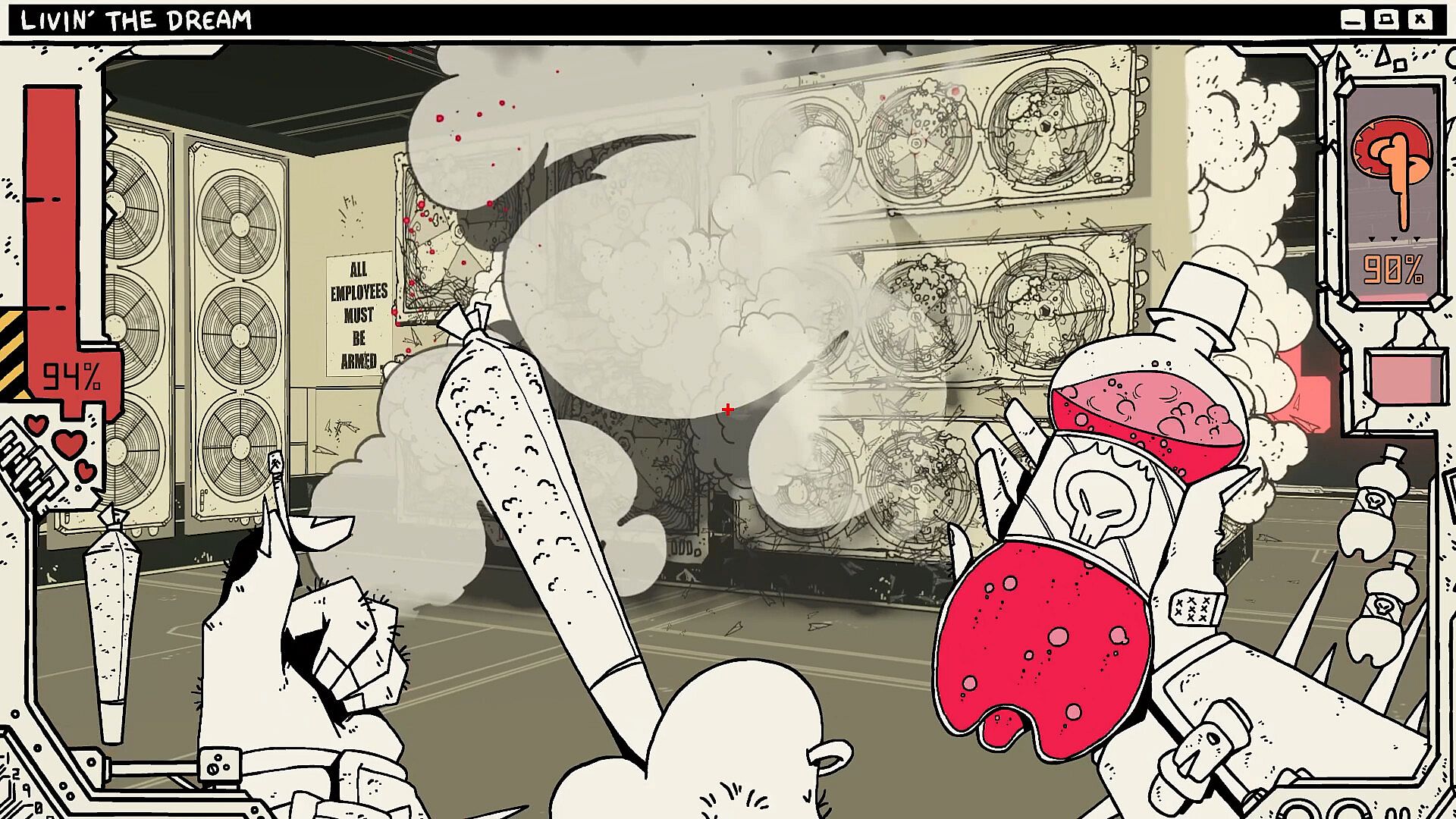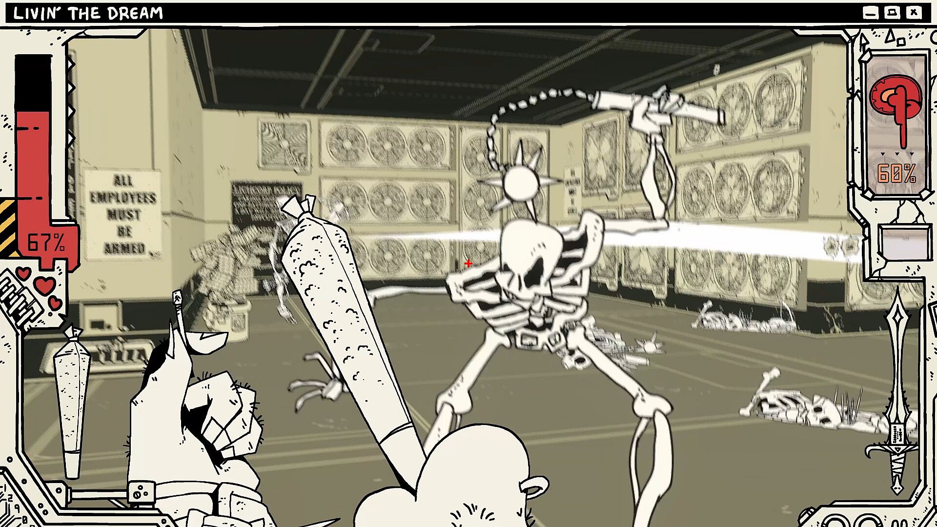 The player’s goal is to traverse the CYBRLICH’s labyrinthine corporate headquarters, making use of various weapons and utility items: