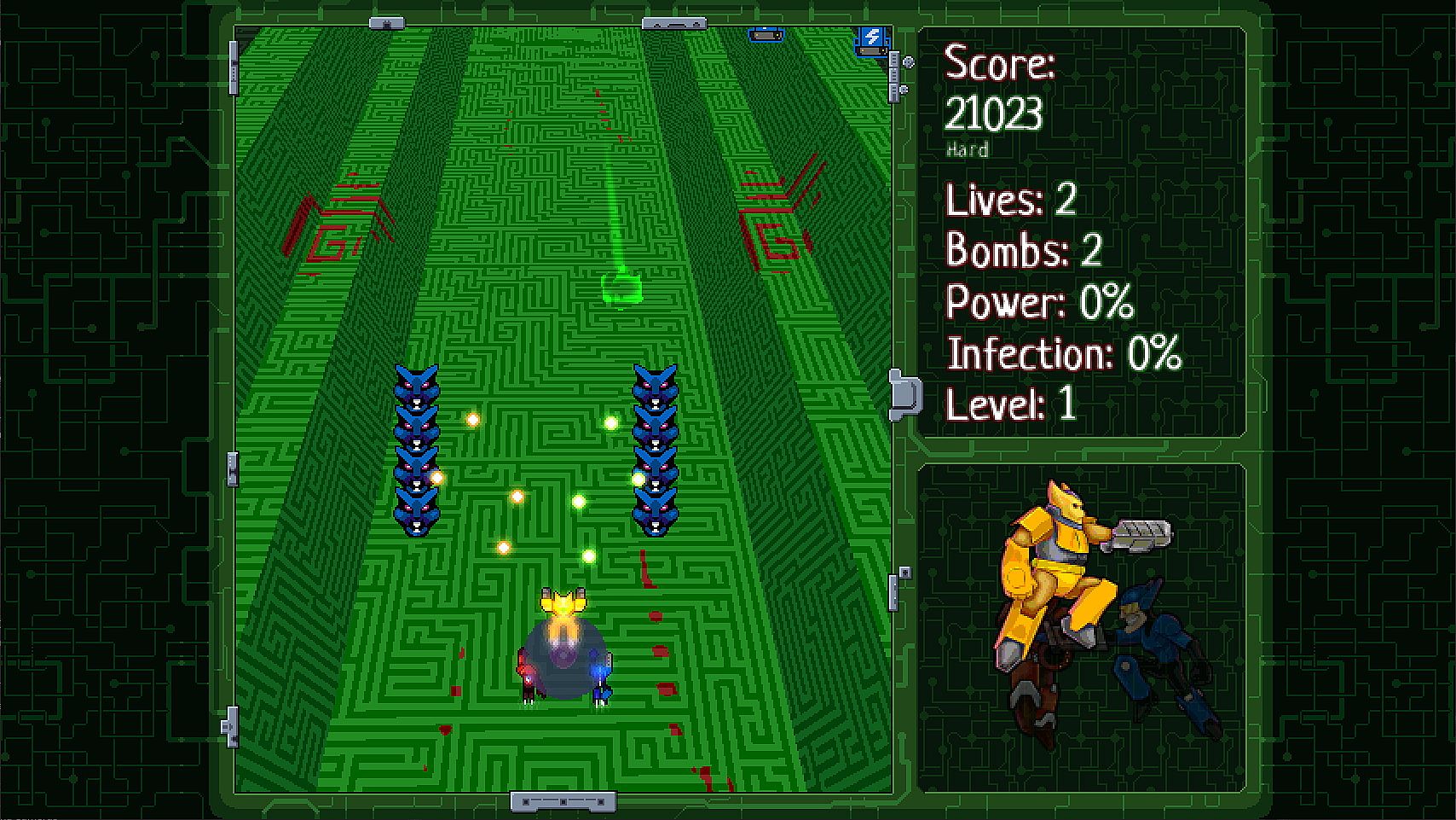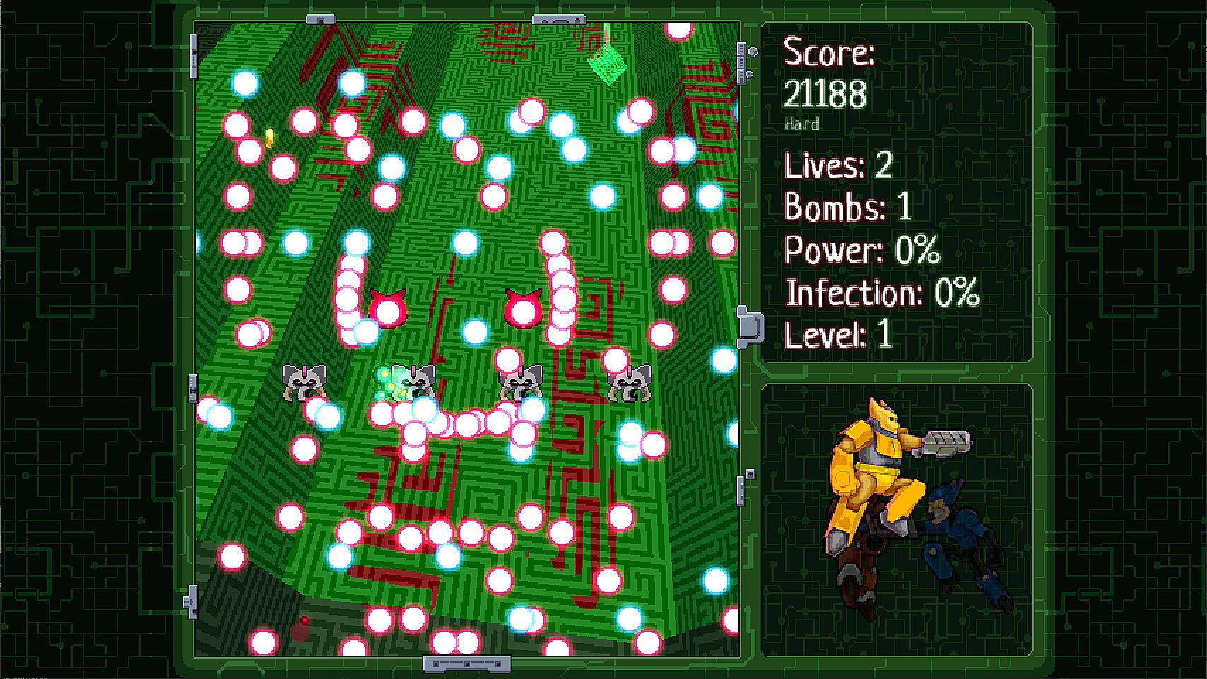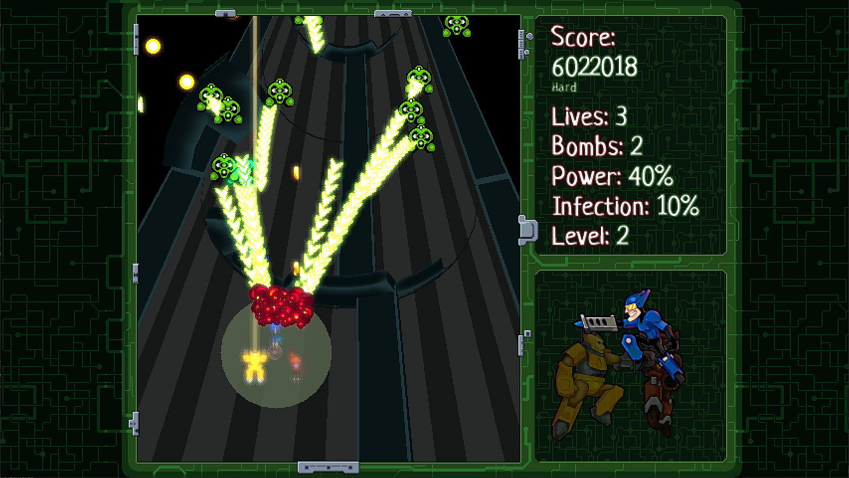 Cybxus Hearts inspired by classic Japanese shooting games. This is a game where you control three different characters at the same time. You can swap between characters depending on situation. But protect your central core with the all cost!Features