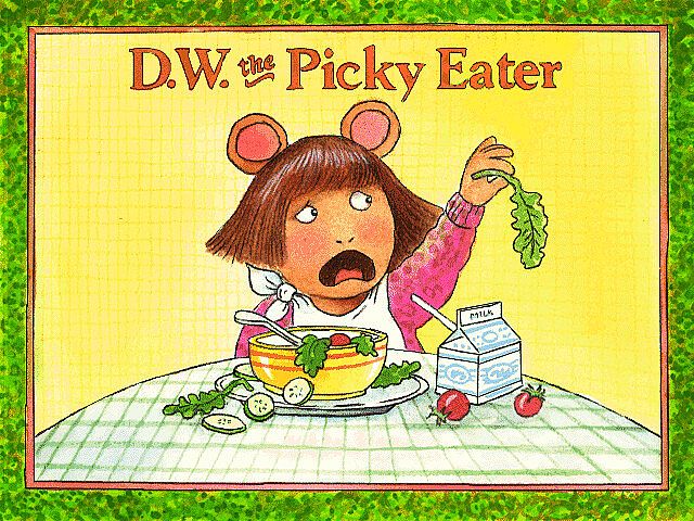 The story centers around D.W., who is an aardvark, and the younger sister of Arthur. D.W. is wary of trying any new foods and would rather stick to plain spaghetti noodles or peanut butter and jelly sandwiches. When her family decides to celebrate at a restaurant and she is served a spinach salad, she causes a scene and embarrasses her family. Afterwards, she is banned from going to any restaurants, until she changes her attitude. D.W. starts to worry...what about Grandma Thora’s birthday dinner? Can D.W. reconcile her misgivings and give something new a chance?