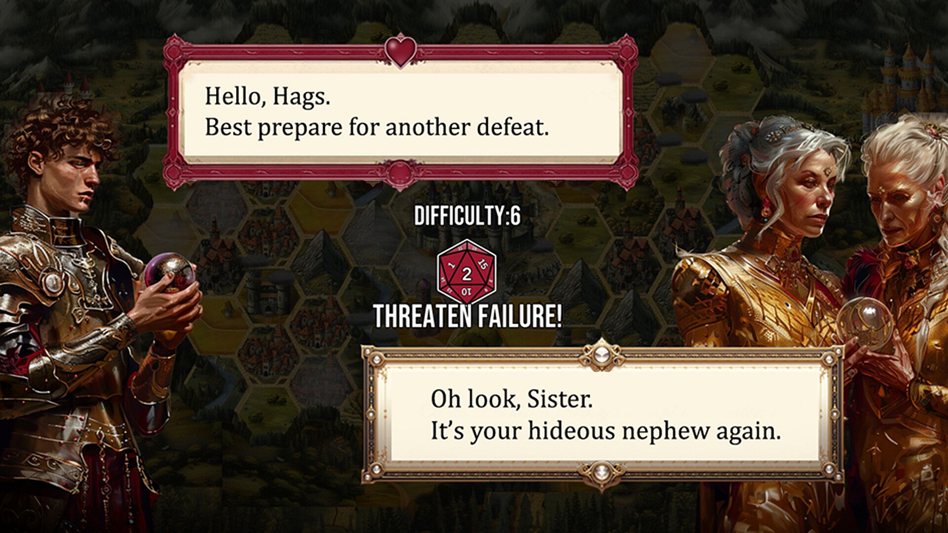 Diplomatic negotiations offer a window into the relationships of the four great houses and their leaders through hundreds of lines of unique dialogue, as alliances are forged and shattered.