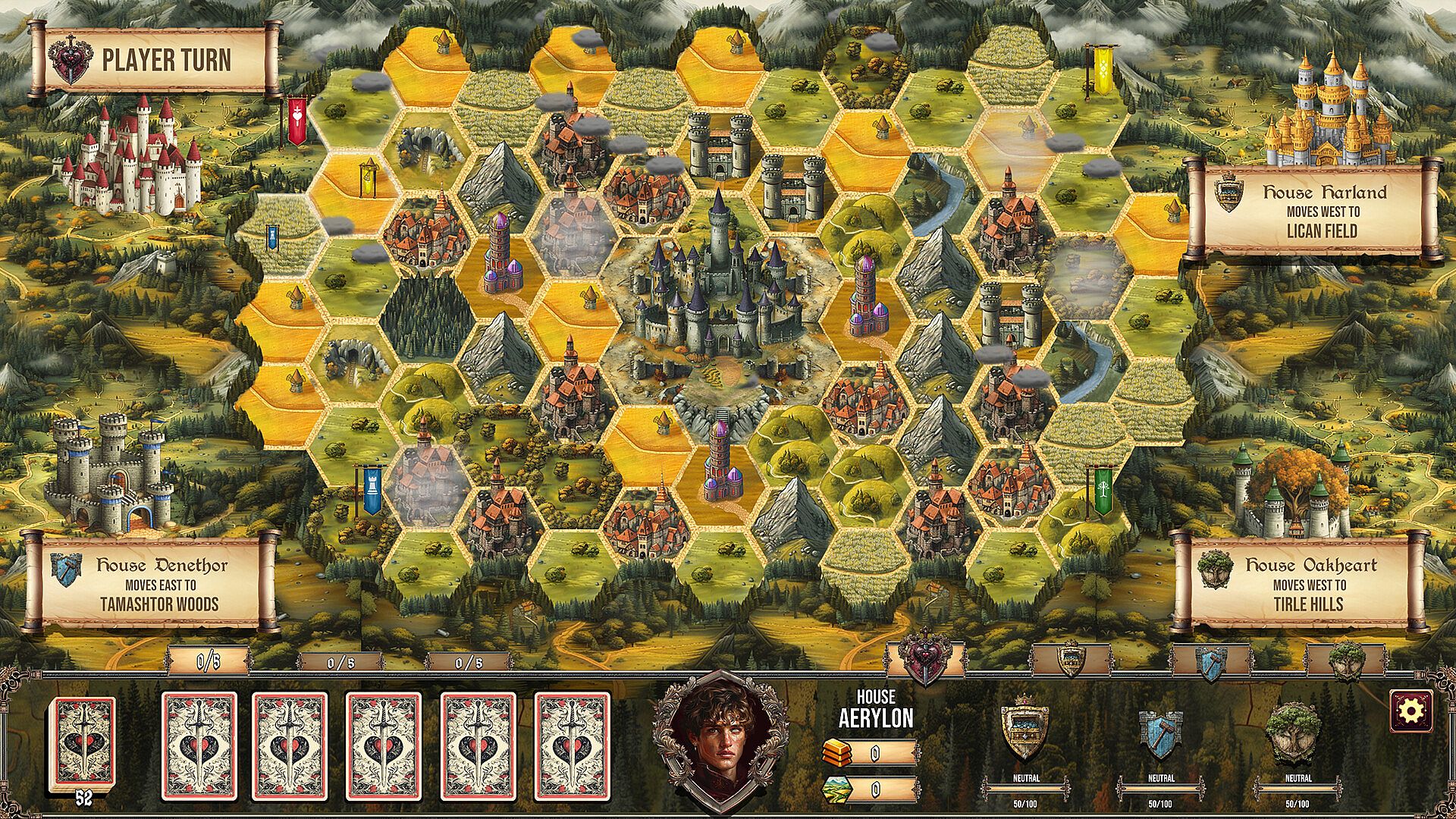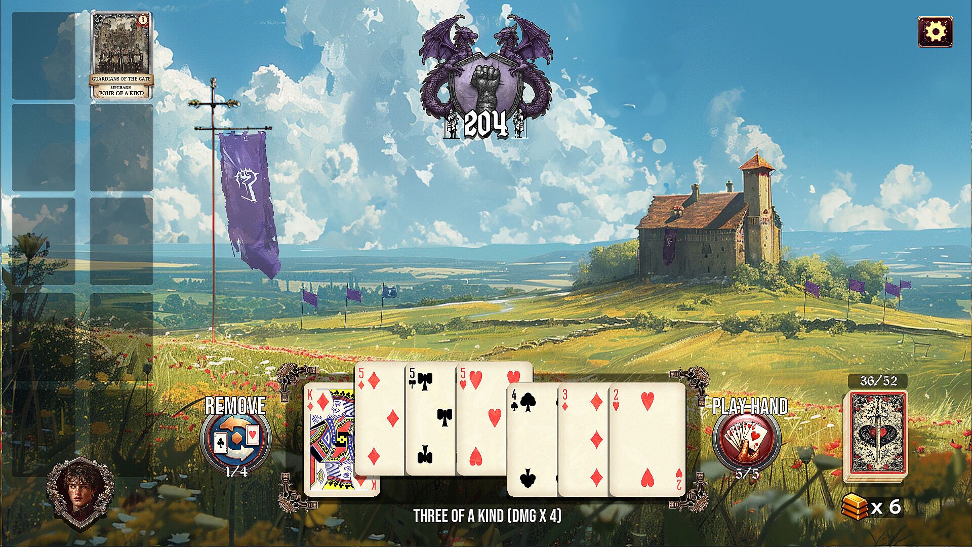These battles task the player with building powerful poker hands to deal damage to enemy forces. Triumph grants you control of the land and its valuable gold. Failure means the fall of your house.