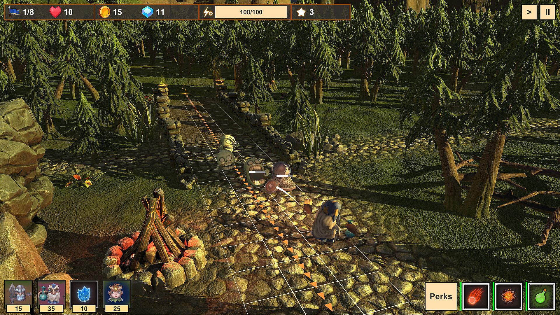 Instead of static defenses, you command a party of three adventurers defending the trade roads from waves of invading monsters such as zombies, orcs, trolls, bats, dragons, and more.