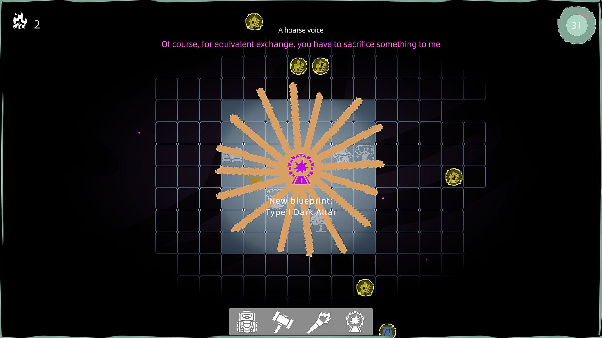 Simultaneously, another [hoarse voice] communicates with you. It seems to possess boundless dark power. If you offer sacrifices to it, it will grant you: