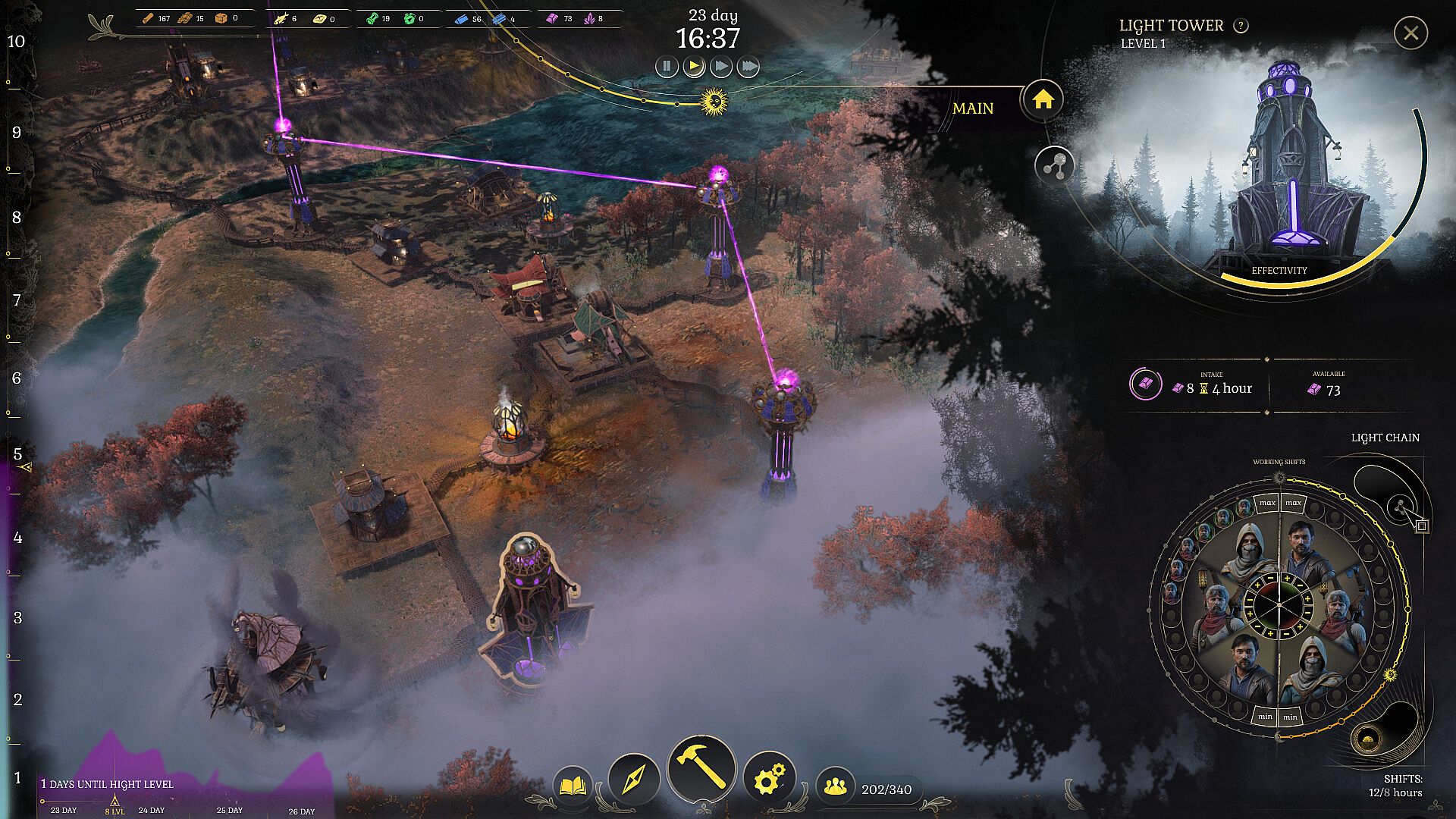 Manage raw and processed resources, production facilities, and citizen morale, while fortifying defenses to withstand fog's creeping chaos.