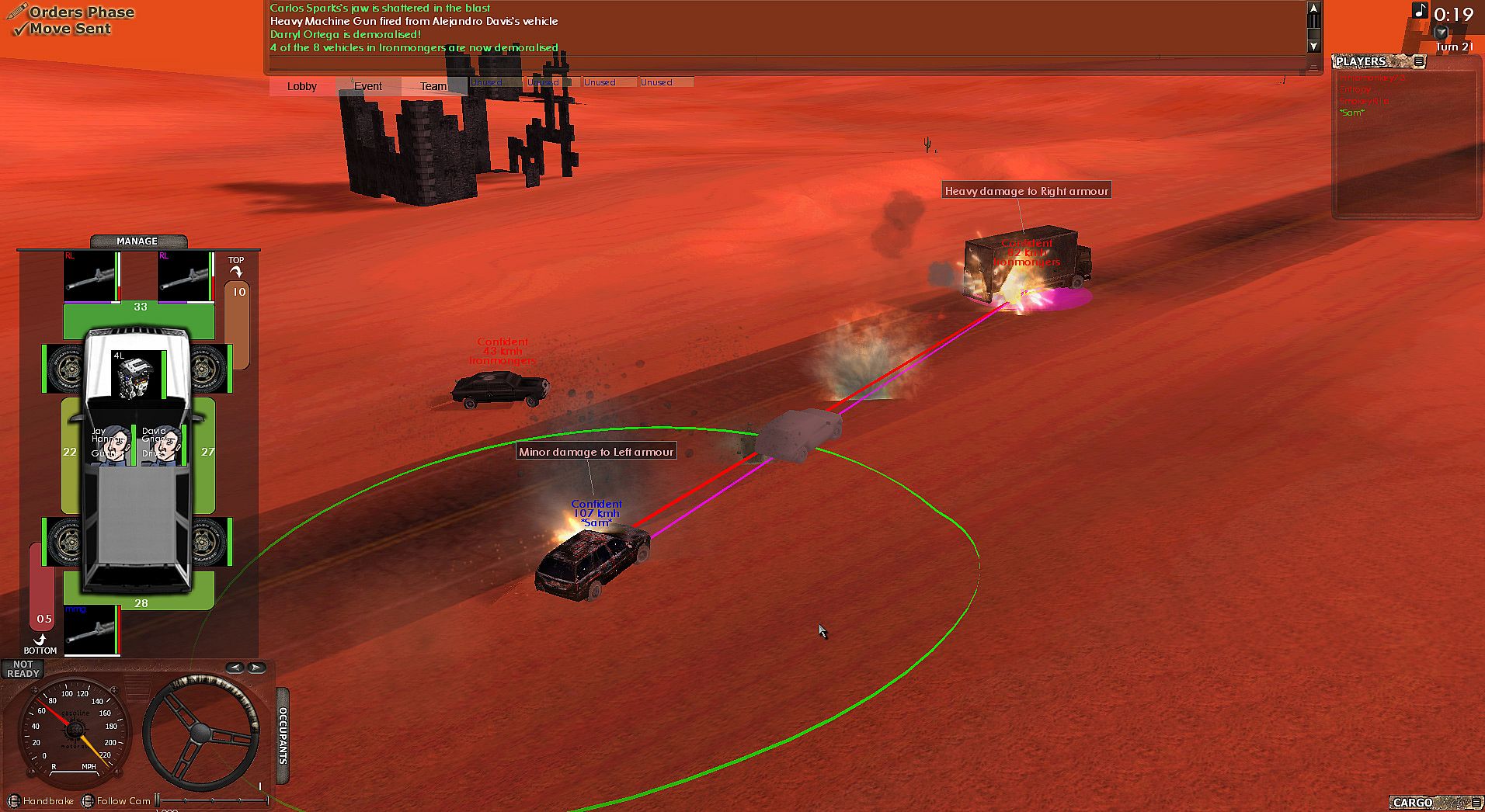 Darkwind is the only car game we know of that combines accurate physics with turn-based play. Not just turn based racing and Death-racing (with multiple cars), but also combats with up to 20 vehicles is where you realise why turn based is a must in this game. Running 10 trucks at once through a slaver ambush in Badlands, managing speed, steering, gun fire from anywhere up to 8 points on a truck would not be possible in real time.