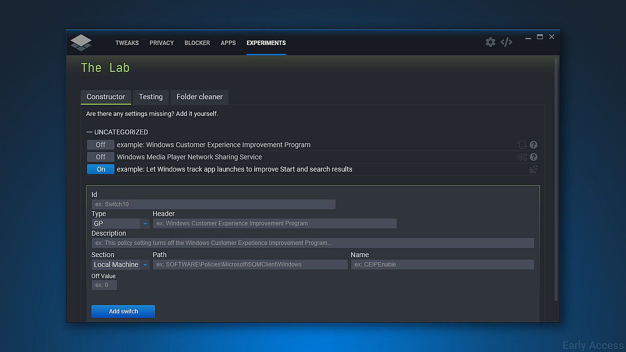 *This feature is in beta testing on the Experiments tab, after that Constructor will be available on the Privacy and Tweaker tabs.