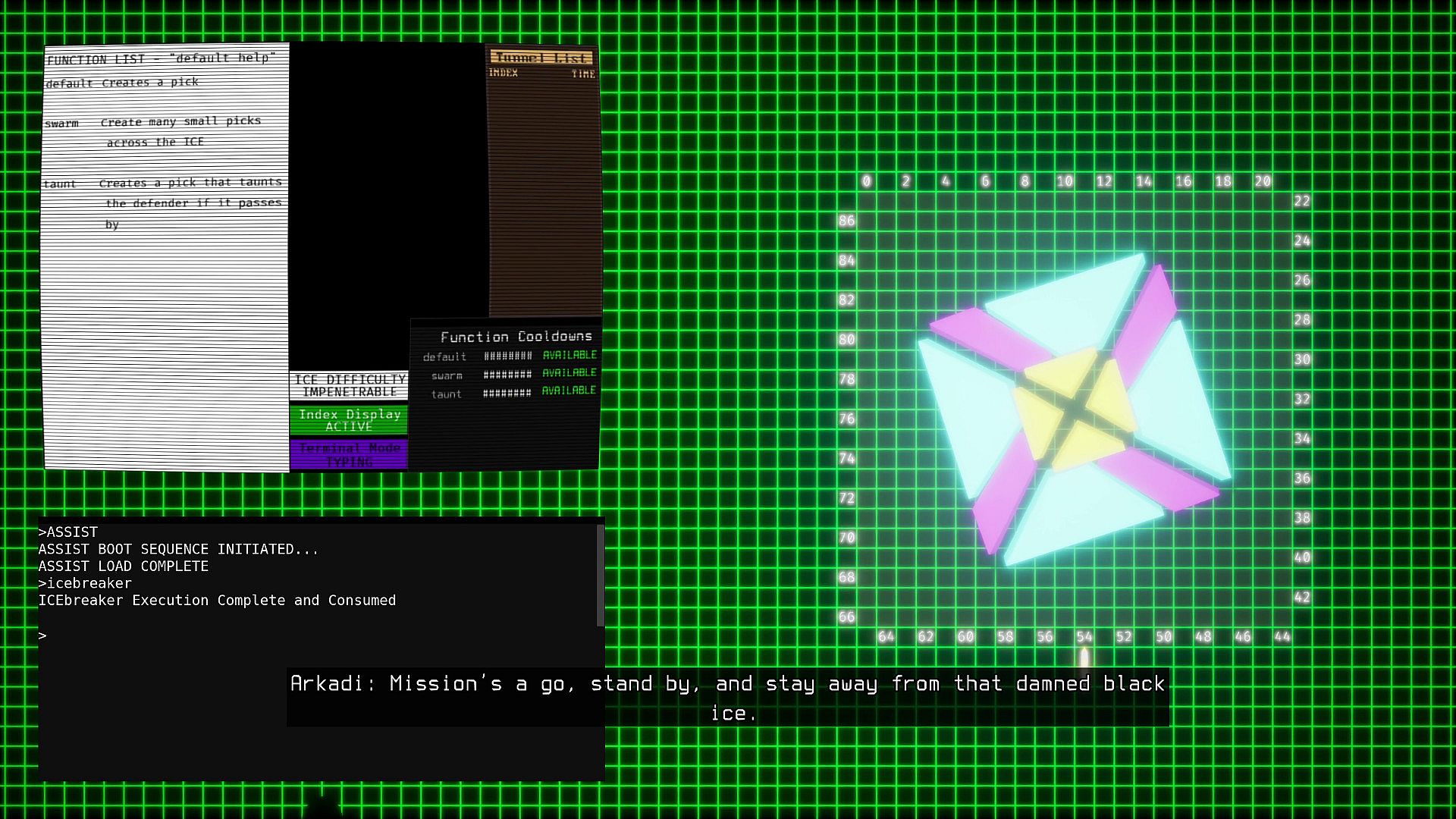 ICE surrounds some programs on the Grid. Use your hacking interface to execute functions to tunnel through. ICEpicks can be strategically placed as the ICE’s defender attempts to destroy them. Use ability functions to manipulate the ICE’s variables and protect the picks. Additional functions can be found within various programs.