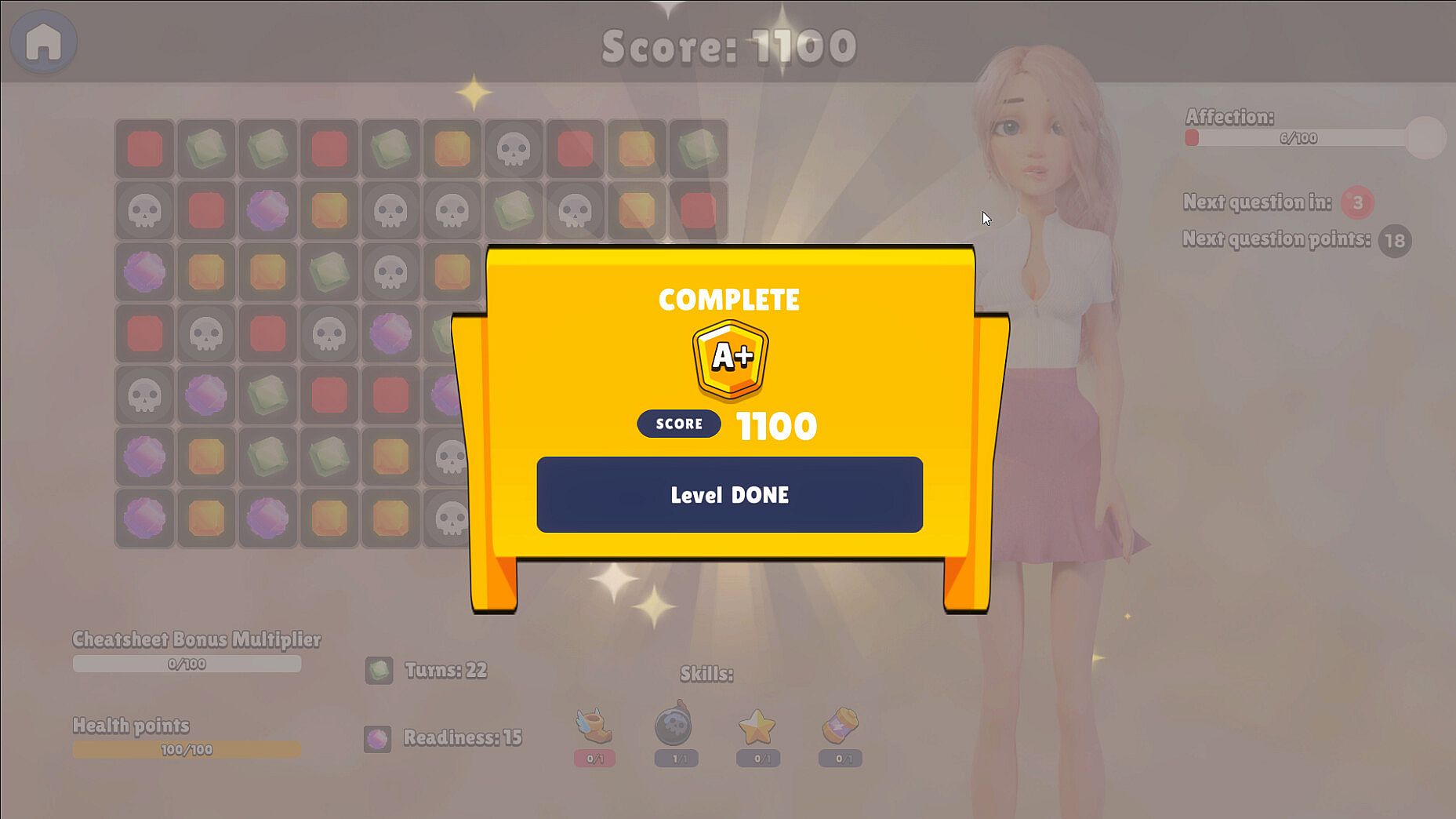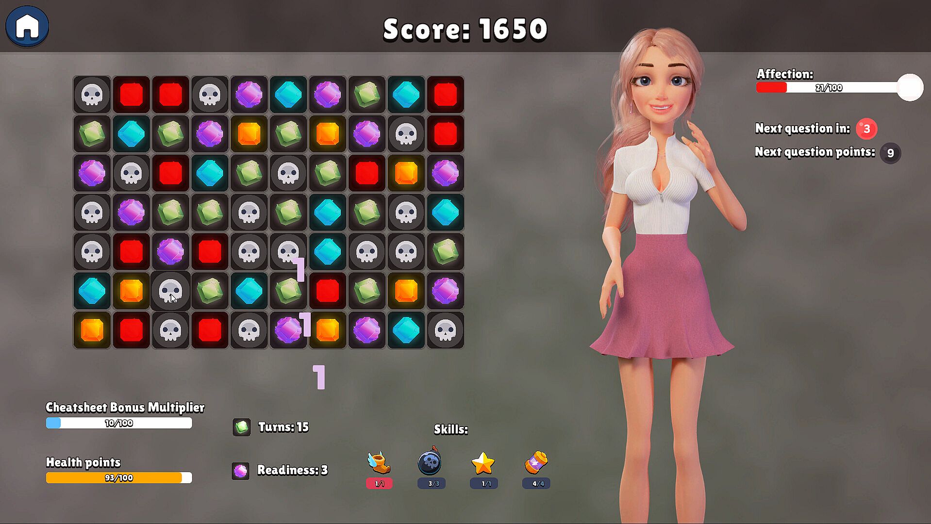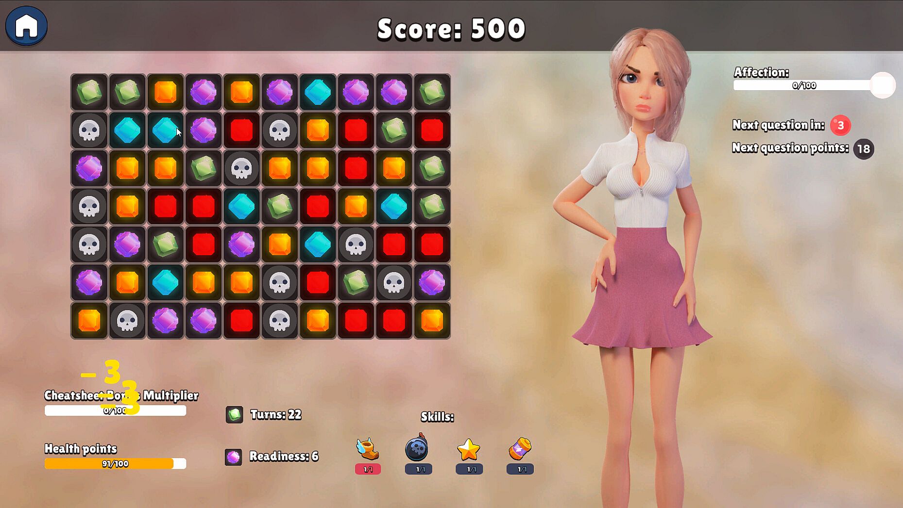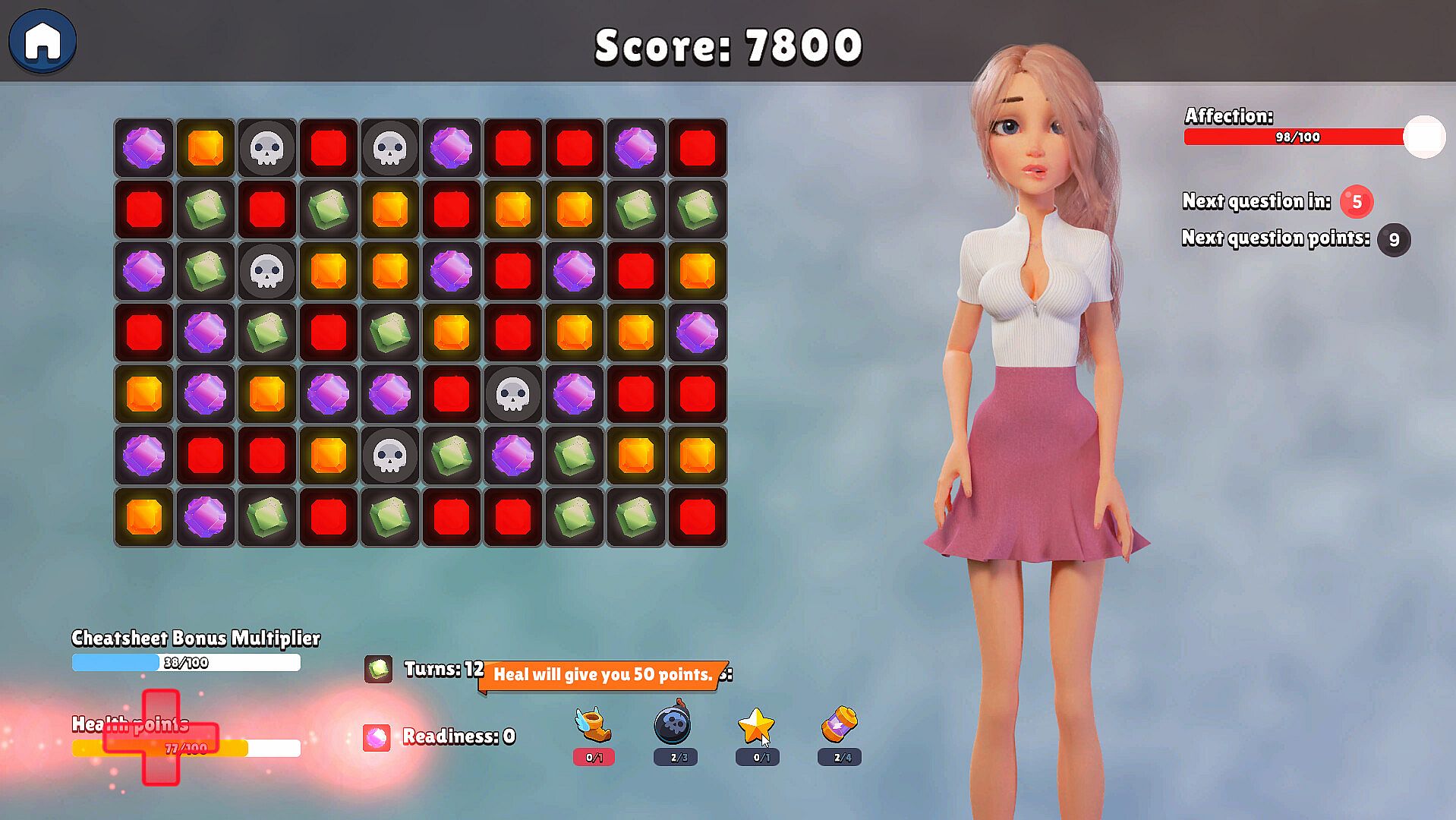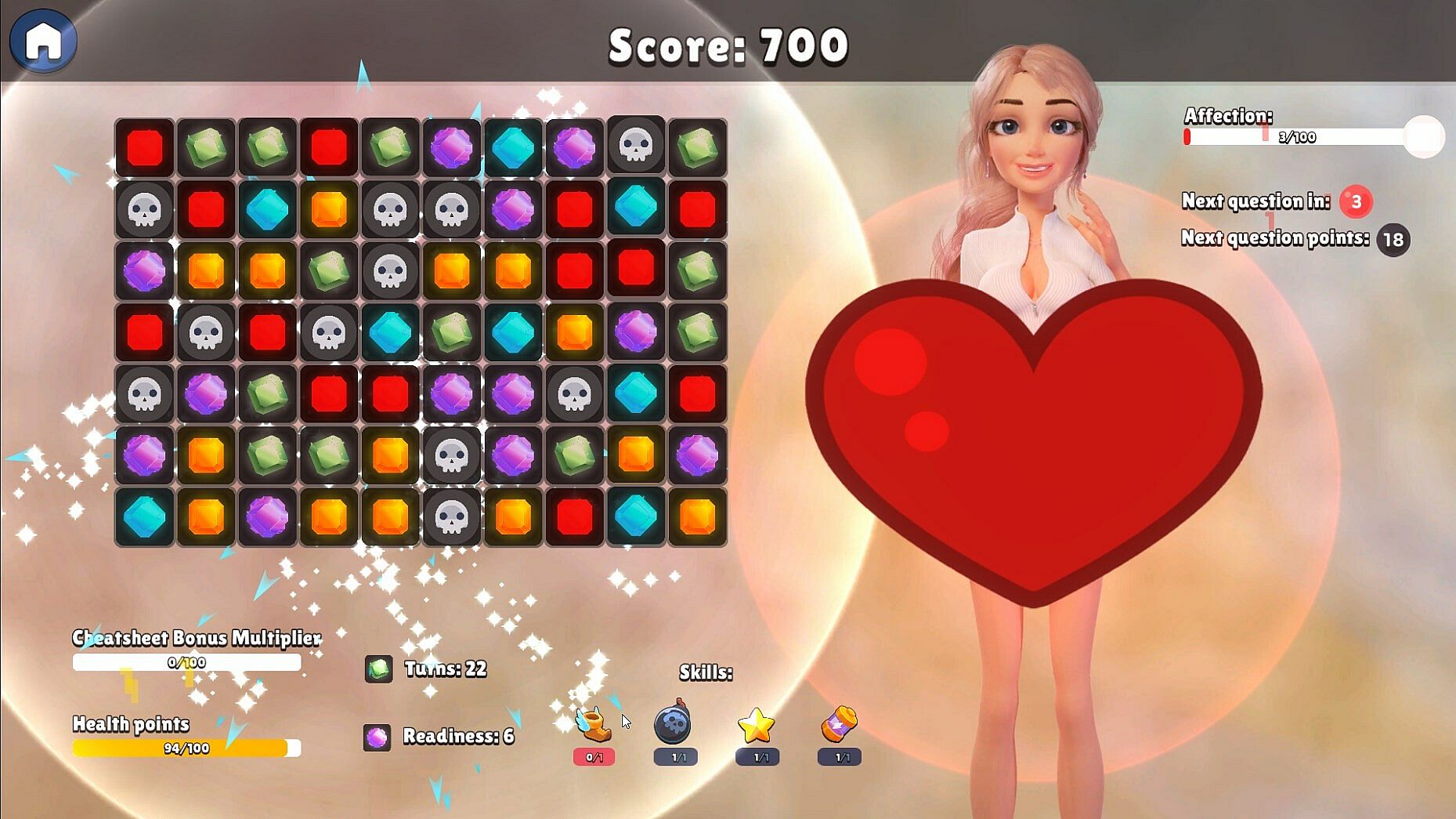 Dating Izzie is a unique puzzle game with visual novel elements that challenges you to win over Izzie's heart through the power of match 3 puzzles. As you go on dates with Izzie, you'll need to solve classic match 3 puzzles, matching gems of the same color to progress to the next level. You also get skills to use to influence the game and win just in time before you run out of turns!
