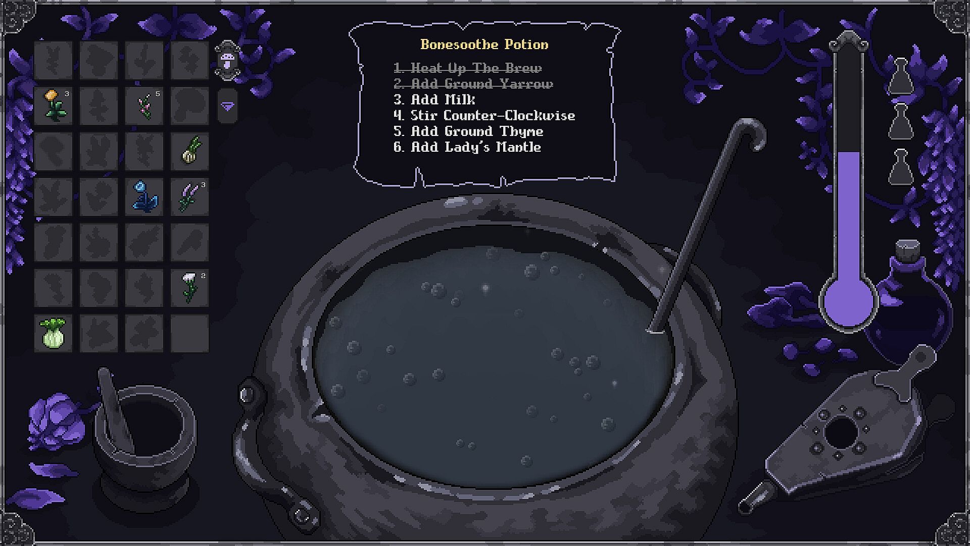 Brew: Work the mortar and stir the cauldron in a satisfying minigame that is easy to learn but hard to master. As your skills grow, your potions will become more potent and valuable.