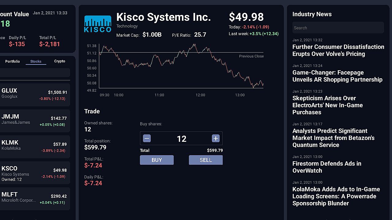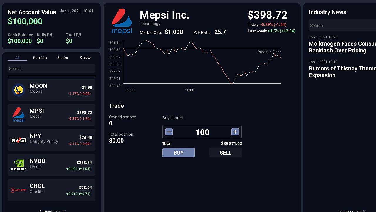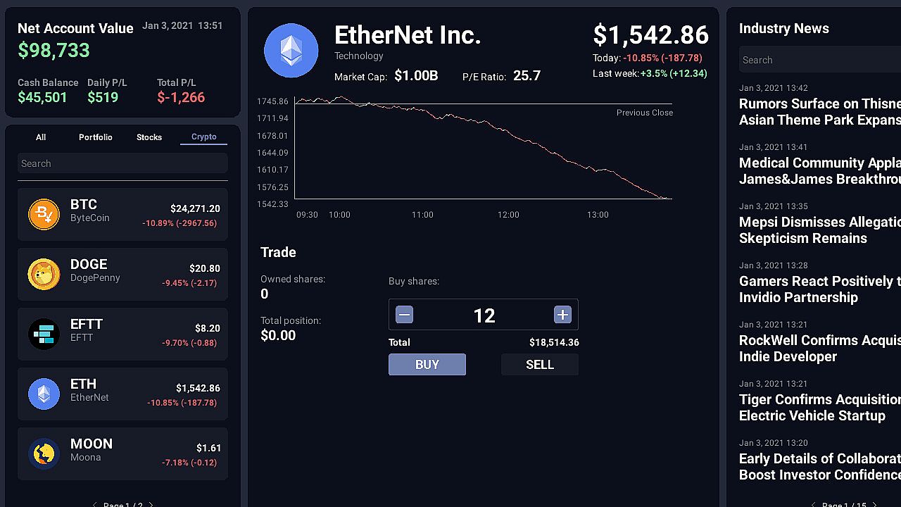 • Trading Platform: Fast-paced trading where quick thinking in stocks and crypto can make or break you. Markets change in real-time based on news and world events