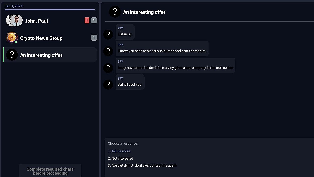 Fresh out of college with your finance degree, you land a job at Obsidian Capital, a small and shady firm. Your new coworkers are smart and well-connected, but they're not always playing by the rules. It's up to you to figure out how to succeed in this tricky environment, balancing making money with doing what's right in both the stock and crypto markets.